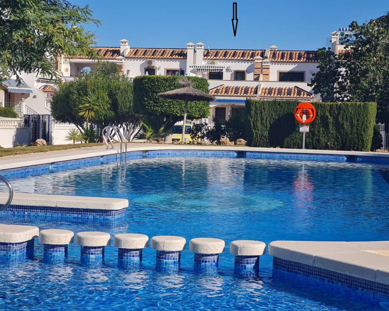 We are delighted to offer for sale this superb 100m2 south-west facing Bungalow Buhardilla in the very sought after urbanisation of VILLAMARTIN Pau-8. The property is situated in a gated urbanisation and offers 3 bedrooms, 2 bathrooms with 68m4 front and rear gardens. Entering through the 8m2 sunny terrace the property distributes as; spacious open plan lounge, dining area and fully equipped kitchen, complete with an adjacent utility/storage area. On this level you have two double-sized bedrooms with fitted wardrobes and a bathroom with shower, one of the bedrooms has patio doors leading out to the rear 14m2 garden. To the first floor you find a further double bedroom with ensuite bathroom with 2 wash basins and shower, a large storage room and patio doors leading out to the sunny 27m2 solarium with lovely open green area and pool views. This lovely property is sold unfurnished and has air-conditioning and internet. The wonderful gated community is very well maintained and gives peace of mind. It has 1 large communal swimming pool, nice communal gardens, parking in front of the house and is only 10 min walking distance to the famous Villamartin Plaza, Golf Course and supermarket, within 5 min drive you find the largest shopping centre in the Alicante region, Zenia Boulevard with over 150 shops, bars and restaurants. The white sandy beaches of Orihuela Costa are only 3 km away and 45 mins drive from both Alicante and Murcia Corvera Airports. This lovely property will not be on the market long, so early viewing is advised to avoid disappointment. MUST BE SEEN !!