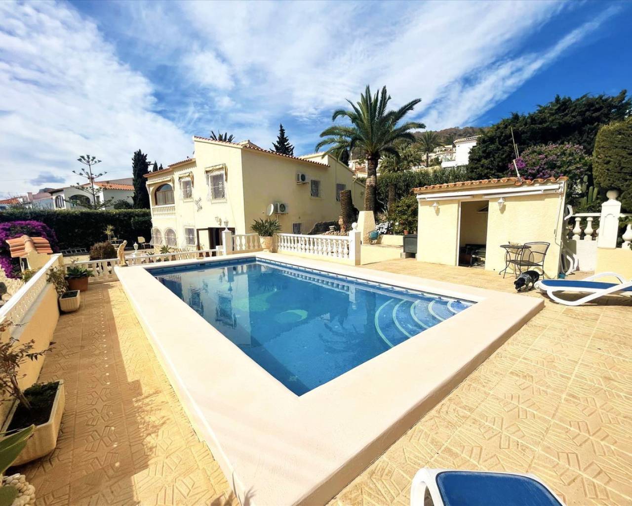 This charming villa is located in the peaceful Gran Sol urbanization, in Calpe, on a plot of 800 m². Just a few minutes by car from the beautiful beaches, supermarkets, and all the amenities Calpe has to offer, making it an ideal option for both a permanent residence and a vacation home. The villa is distributed over two floors. On the upper floor, we find two bedrooms with built-in wardrobes, two bathrooms (one en-suite), an independent kitchen, and a bright living room with a fireplace, creating a warm and inviting atmosphere. On the lower floor, there is an additional bedroom with a built-in wardrobe, a full bathroom, a living room, a versatile room that can be adapted to different uses, and a storage room. The exterior of the villa offers a large terrace with a private pool, perfect for relaxing and enjoying the Mediterranean climate. There is also a parking area. The property is equipped with air conditioning, double-glazed windows for added comfort, and a laundry area, ensuring that it is functional and comfortable at all times. With an excellent location and all the necessary amenities, this villa is a fantastic option for enjoying the Mediterranean lifestyle in Calpe. Call us for a visit or more information. We work to find the house of your dreams. We will show you this property if you are interested, or we will search for you until we find what you are looking for. Then, we will take care of all the necessary paperwork until the keys are handed over!