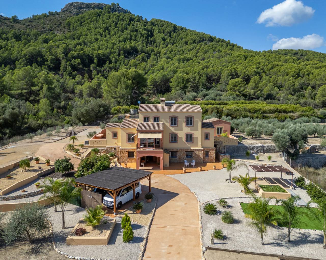 Beautifully designed and appointed finca with a stunning rural location, offering peace and tranquility, yet within close proximity to the Spanish pueblo of Orba. This outstanding family residence has been impeccably appointed by the current owners, to create a stylish, modern home, yet it stays true to its authentic Spanish character. The outside gardens and living spaces are simply beautiful, on a fully fenced plot of 10,048m2, with manicured gardens that give huge "Kerb appeal", yet blend into the surrounding countryside. Spread over three floors and covering 358m², the house showcases a distinctive finca style, featuring high-quality materials, that make it truly one of a kind. Furthermore, there are breathtaking views of the surrounding mountains and lush landscape. It offers the perfect blend of sophistication, comfort, and rustic charm. As well as stunning aesthetics, the home has been designed to harmonise with its natural surroundings and to be energy efficient, with respect for the environment. This also means that the house is economically efficient. The front door, to the main house, is on the middle floor. An elegant entrance hall leads to the spacious, open plan living spaces. The living room has a feature, free standing wood burner and beautiful wood flooring. A stylish, fully fitted kitchen adjoins the dining room. Also on this floor, there is a double bedroom suite with its own dressing room and bathroom and a separate guest cloakroom/WC. On the upper floor, there is a sumptuous master suite with its own dressing room and bathroom, and another double bedroom and bathroom. On the lower level, there is a further bedroom suite with bathroom. Further rooms on this floor can be used as a workshop, studio, office etc. Furthermore, as there is an entrance directly to the outside, this floor could easily be converted to make an independant guest apartment or living space for extended family. There are many luxury extras with this house: Double glazing throughout, hot and cold A.C,, gas central heating, 28 solar panels providing electricity, meaning it rarely needs to draw power from the grid, solar thermal water heating, water filtration system, security cameras and electric gate. Detached from the house, there is a stone built office/WFH suite. This could easily be utilised as a guest suite or gym, to suit the lifestyle of the new owner. The exterior living includes; A 15 metre swimming pool surrounded by sun terraces, garden areas with fruit trees, an olive grove, a feature fish pond, a carport for 2 cars, parking space for a mobile home, with electricity and water supply, agricultural water for garden irrigation.. and much more. Orba is a charming village in the province of Alicante, with a great sense of community. Just a 20-minute drive takes you to the coastal towns and Blue Flag beaches of Oliva, Denia, and Javea. The Orba Valley is an agricultural valley, primarily harvesting oranges (It is also known as "The Orange Valley"). Orba is well connected, with Alicante and Valencia international airports both approximately an hour's drive away. The village offers essential amenities, including supermarkets, restaurants, medical services, banks, and shops as well as many excellent restaurants, cafés and pretty plazas to watch the world go by. This is an outstanding family residence in a superb location. It must be viewed to appreciate all it has to offer. For more detailed information, call us now.
