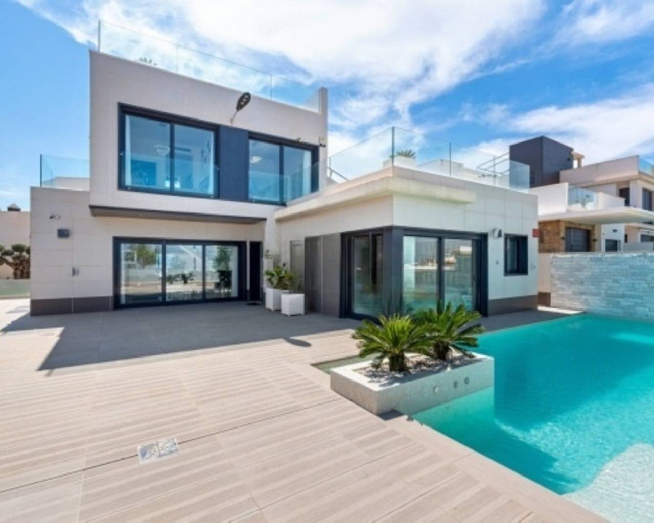 This newly built luxury villa contains 5 spacious bedrooms and 4 modern bathrooms, carefully arranged over two floors and a basement, all seamlessly connected by a practical lift and an elegant glass staircase with soft interior lighting. The basement is dedicated to entertaining and includes a game room (with pool table and football table), party room with full kitchen, two additional bedrooms, two storage rooms and a full bathroom. The ground floor consists of an open-plan living and dining room with a central kitchen with an island, a master bedroom with en-suite bathroom, as well as a utility room and guest toilet. On the first floor you will find two large bedrooms, two further bathrooms and access to private balconies. The top floor opens to a spectacular 70 m² solarium with breathtaking panoramic views.Premium Features and Interface The villa is fully equipped with air conditioning, central heating and underfloor heating and is sold fully furnished with design work, excluding personal items. Luxurious amenities include motorized sofas, brand new mattresses, a pyrolysis steam oven, a combined refrigerator/ice maker, solar panels and a pellet stove for eco-friendly heating. Security is paramount, with reinforced windows and doors, security keys and a sensor-based alarm system.Outdoor Paradise Step into the carefully landscaped garden with a private pool with waterfall, jacuzzi and hydromassage jets. Around the pool there is a lush green area, an outdoor shower and a large parking lot for several cars.Location – Bellavista Residence Residencial Bellavista is located in the quiet and picturesque neighborhood of San Miguel de Salinas and offers some of the most beautiful views of the Costa Blanca. Located just 7 km from the beautiful beaches of Orihuela, close to the best golf courses and a large shopping center with all the necessary services, restaurants and shops, this property is ideal for those who value both nature and tranquility.