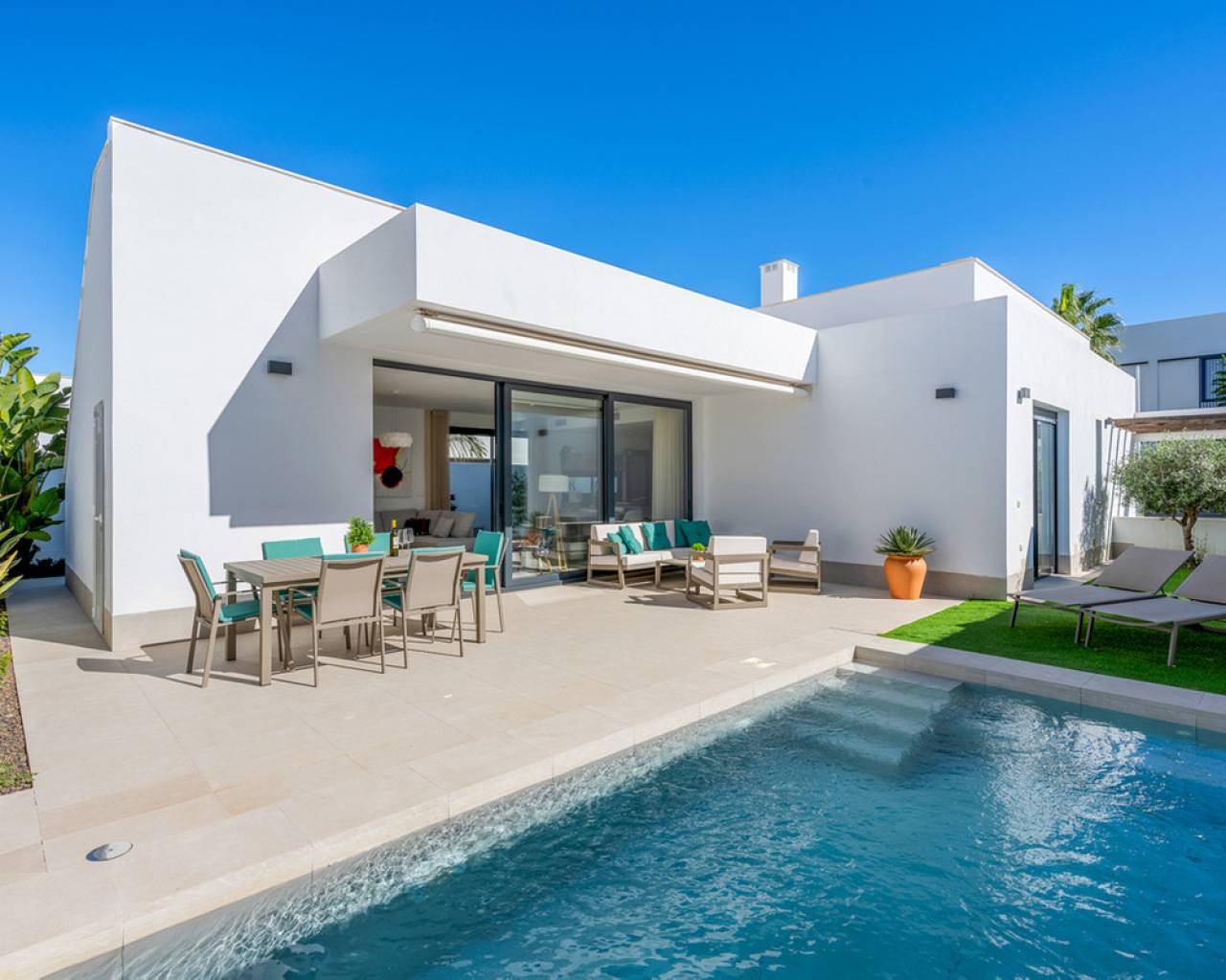 A modern style detached villas with 3 bedrooms and private swimming pool in Mar de Cristal, Murcia only 400 metres away from the beautiful white sandy beaches. The property boasts a cosy living/dining room with direct access to the garden, a modern fully equipped kitchen, utility/storage room, three bedrooms with fitted wardrobes, two bathrooms, air conditioning (hot/cold) throughout the property, several terraces, a landscaped private garden with swimming pool, off-road parking. Mar de Cristal is located in the Mar Menor and includes many features, such as the exclusive paddle and tennis club, a marina next to the promenade and beach, and the beach. In addition, there are multiple services, public and private, which will assure you the most comfortable and pleasant stay. Only 15 minutes from Cartagena, and only 5 minutes from La Manga Club, Cabo de Palos, or La Manga del Mar Menor. The Calblanque Regional Park, which can be found nearby, is described as a place of outstanding beauty, with long white sand beaches. Mar Menor Sea is one of the best places in the work where you can practice sailing, windsurfing, canoeing, swimming, water skiing, or any other kind of water sport.