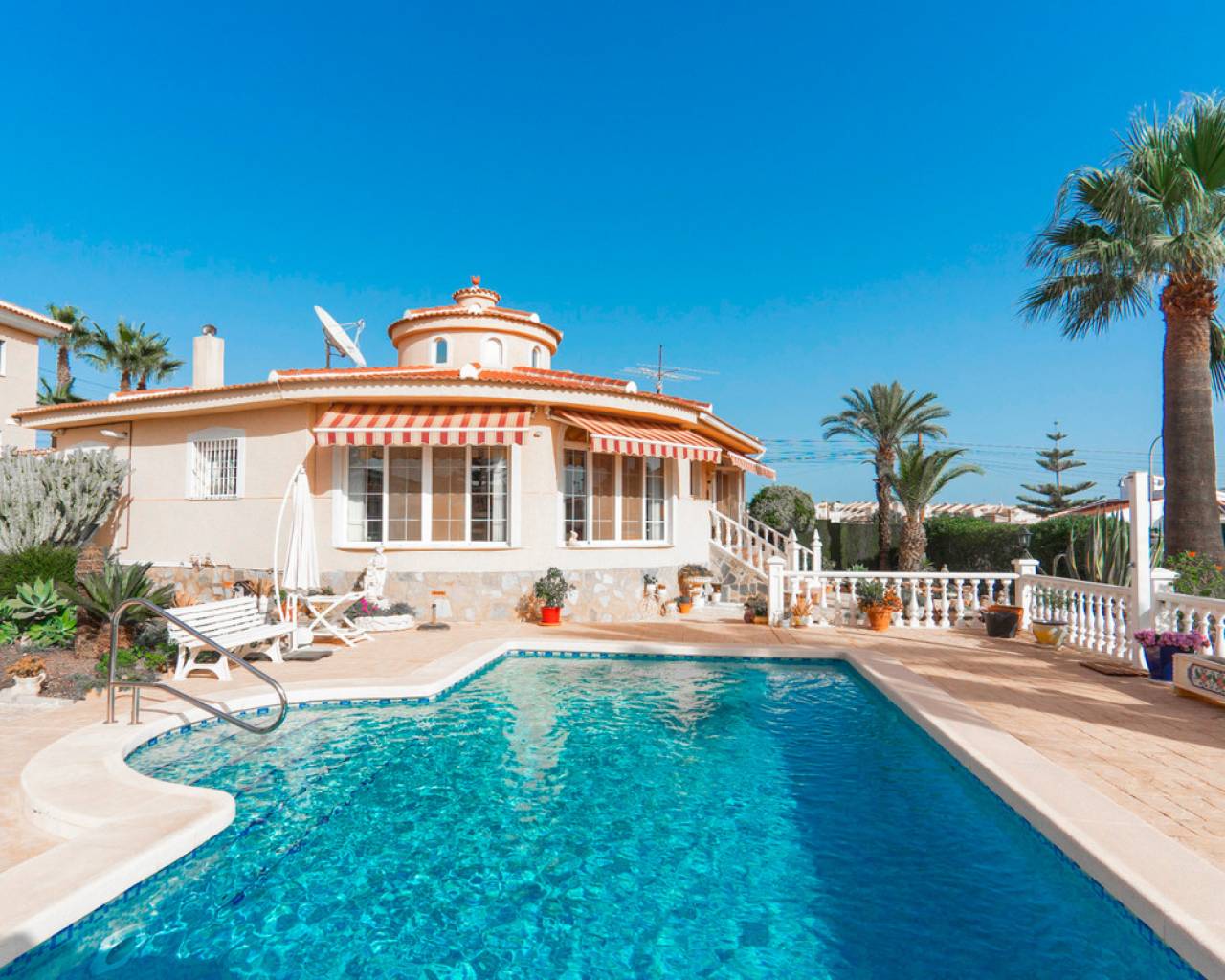 SPACIOUS LIVING ALL ON ONE LEVEL IN ONE OF THE MOST SOUGHT-AFTER AREAS OF CIUDAD QUESADA This spacious bungalow sits on a generous 1,084m² plot and offers excellent build quality, bright interiors and superb outdoor living. Designed on one level, it is ideal as a family home or a substantial holiday retreat, with plenty of scope for future extensions thanks to the size of the plot.Originally built for Swiss buyers, the property benefits from upgraded construction including gas central heating, damp-proof course and cavity wall insulation—rare features in Spain. The home is in very good condition throughout. Private Pool and Attractive Gardens The villa features mature landscaping, a rockery, multiple seating areas and a private swimming pool. The outdoor space is perfect for relaxing in the sun or enjoying shade at any time of day. Flexible Year-Round Living A south-facing, wrap-around glazed porch serves as an additional living room and can be fully opened in summer or closed for warmth in winter. Bright and Spacious Interior Two entrances from the porch lead into the main living areas: A large, light-filled living room with feature skylight A modern farmhouse-style kitchen with breakfast bar, utility area and access to the rear garden Accommodation A hallway leads to the main bedrooms: Master bedroom with fitted wardrobes, ensuite with bath and shower, new A/C and ceiling fan Two further double bedrooms with fitted wardrobes Fourth bedroom, currently used as a dressing room Family bathroom with shower Guest House / Summer Kitchen With Building Potential Beside the pool is a separate guest suite converted from the original garage. It includes a studio-style room, bathroom and a kitchen overlooking the pool—ideal for summer cooking and entertaining. Thanks to the size of the plot, there is still ample buildable square meterage available, and the current owners have already obtained approval to extend and even build upwards on the guest annex. Whether you want additional living space, a larger guest house or a bespoke hobby room, the potential here is excellent. The annex can also be easily reconverted back to a garage if preferred. Off-road parking is available. Sought-After Location in Ciudad Quesada Set in one of Quesada's most desirable areas, the villa is close to amenities, restaurants, golf and international schools. Minutes walk to restaurants & bars 10 minutes to Guardamar's beaches 15 minutes to Torrevieja 30 minutes to Alicante Airport Easy access to Orihuela Costa and Zenia Boulevard A beautifully presented villa offering space, privacy, excellent build quality and exciting potential for further development.  Contact us now to request your in person or virtual viewing.