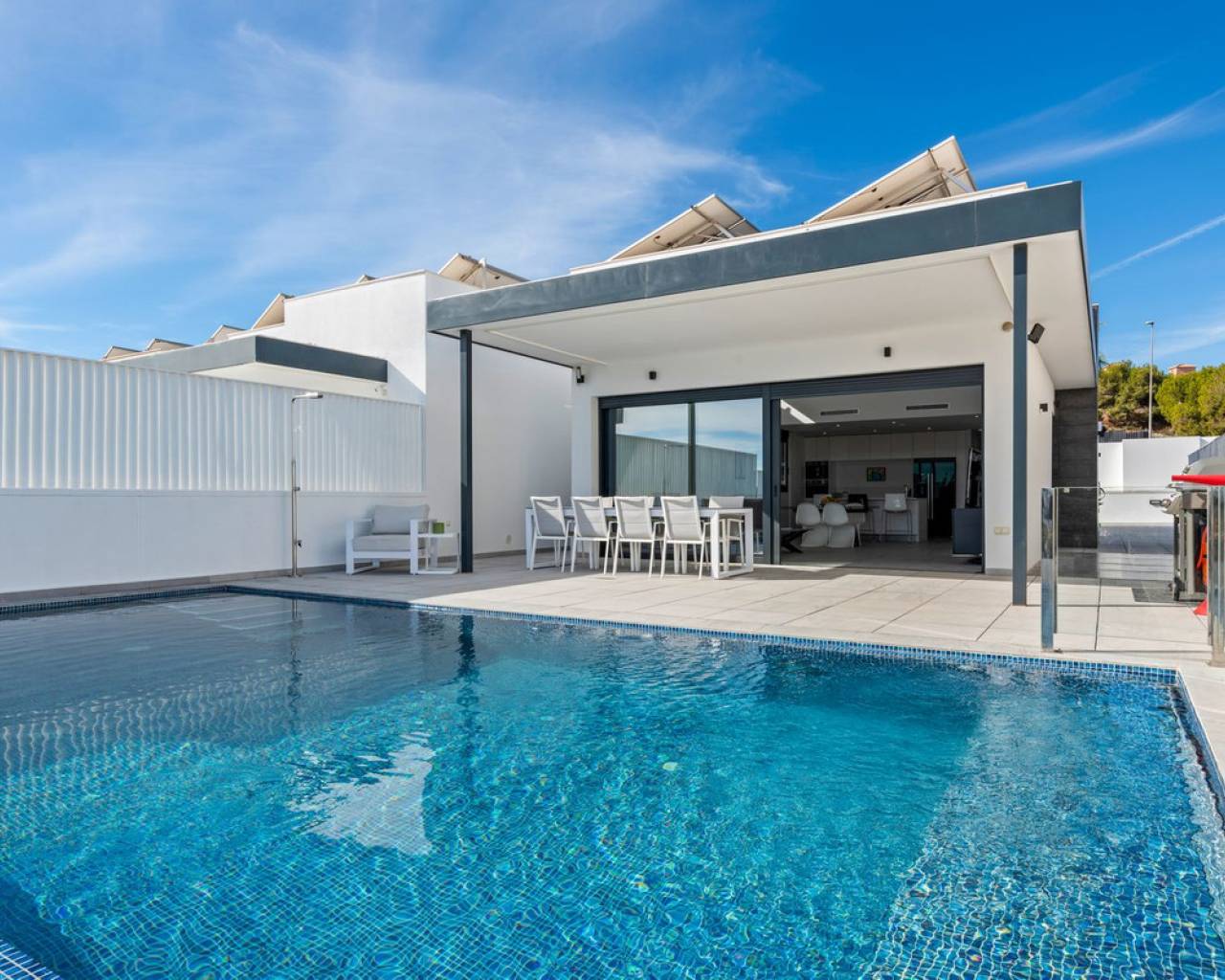 We are proud to present this exclusive top of the range independent villa with spectacular uninterrupted sea views. If you are looking for a home that is high tech and walk in ready, then book your viewing for this amazing property today! As we enter the villa straight into the open plan kitchen/living room you will immediately notice how bright and spacious it is. The 60m² living area has a raised ceiling of 3.5m and has large panoramic sliding doors across the back, which allows you to fully enjoy the amazing sea views. The doors lead out to a large covered terrace and the beautiful newly fitted heated infinity pool with lights and electric cover. Down a few steps to the back of the pool there is a cosy deck where you can sunbathe until the sun goes down. Back inside to the sleek modern kitchen you will be wowed by the technology this villa has. All the appliances are top of the line and can be controlled by your phone, through WiFi Home Connect. That includes the built-in oven, microwave, dishwasher, induction hob, extractor fan and even the coffee machine! All appliances that are built in, will remain. There is even a hidden pop-up plug stand built into the island. Beside the front door are hidden storage cupboards, ideal for coats, shoes and much more. As we continue to explore this level you will find a separate large fully tiled cloakroom and the bright master bedroom with a large dressing area and a sleek master ensuite with double sinks and glazed walk-in shower. Large sliding doors in the master bedroom lead out to the rear garden with a grassed seating area. As you walk down the stairs, you immediately arrive at the second living room, currently being used as a home gym and play area for children. Patio doors lead out to a lovely courtyard area which is also accessed via all the bedrooms. On this level there are 3 more fabulous bedrooms to explore. The first is currently being used as a spacious office. The next bedroom has built in wardrobes, patio doors to the courtyard and a high end modern ensuite. The last bedroom is a beautiful suite, comparable to a 5 star hotel room, with endless fitted wardrobes, a gorgeous ensuite with freestanding bath and walk-in shower, as well as patio doors off the bedroom leading to the afore mentioned courtyard. But that's not all there is down here, leading off the living room is a very spacious laundry and utility room which also gives access to an enormous storage room. Throughout the house there is hot and cold air conditioning which can be controlled in 5 different Daikin air zones by the control panels or by your phone. This stunning villa has even more to offer: Top of the line water softener has been fitted throughout, including the swimming pool. The main level living room has a pellet warmer to help create those extra cosy nights. There are mosquito nets and electric shutters throughout the entire property. Every bathroom has radiators, underfloor heating and extractor fans. The electric gate leads to the private driveway with parking for 3 cars and a brand new unused electric car charger. The pedestrian gate has a video doorbell with internal opener. Up on the 60m2 solarium you will find 22 solar panels. New privacy fencing has been installed. Exterior lighting and 5 security camera points around the property. This luxury villa really is walk in ready and is waiting to wow you! This stunning villa is less than a 5 minutes' drive from the vibrant town of San Miguel de Salinas where you can find all the amenities that you require. Sought after Spanish schools, 24hr medical centre, church square, banks, pharmacies, municipal pool, football ground and a fantastic selection of local and international bars and restaurants. As a Spanish town it celebrates the many colourful fiestas throughout the year and there is a weekly produce market on a Wednesday. If golf is on your agenda, then you will not be disappointed with the award winning Las Colinas golf course only a few minutes' drive, and a further 4 prestigious golf courses less than a 10-minute drive. The fabulous sandy coast line of the Orihuela Costa is 12 minutes away by car as is a very popular and large shopping mall, Zenia Boulevard, where you can shop to your hearts content. Community Fees: €39 / monthly. Basura Tax: €75 / annually. IBI Fees: €770 / annually
