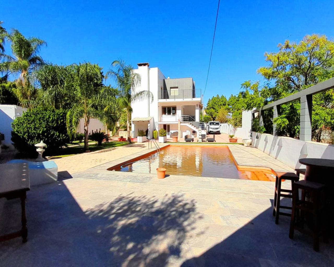 This spacious and bright recently refurbished villa is located in a very quiet location in the Montgó area and has 4 bedrooms and 3 bathrooms plus an outside toilet next to the swimming pool. The villa is distributed over 2 floors, on the upper floor we find 2 spacious bedrooms with fitted wardrobes and access to a terrace, a complete bathroom for these bedrooms to share and the master bedroom which has en-suite bathroom and access to the same terrace which enjoys beautiful sea views that you can even enjoy from the comfort of your bed. On the main floor there is a spacious living-dining room with access to the back terrace which has folding awnings. On this floor we find a 4th double bedroom with fitted wardrobes, a shower room and a large fully equipped kitchen with access also to the back terrace. The villa has 3 separate basements, one of which is currently used as an office and has air conditioning. Right next to the pool there is an amazing and spacious summer kitchen / barbecue area enclosed by sliding glass doors. This fantastic villa is equipped with air conditioning hot and cold throughout the house, piped music throughout the house as well, TV sockets in all bedrooms, double glazed windows and doors and pre-installation of pool heating system. The villa also has a closed garage and a beautiful garden with palm trees. The 10x12m swimming pool is painted orange inside. Contact us to schedule a viewing.