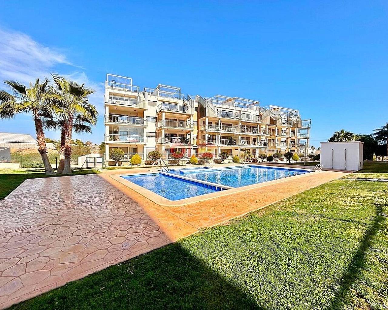 Luxurious 2-bedroom, 2-bathroom flat in Villamartin. It has large terraces, all south-facing, with views of La Zenia Boulevard and Zenia Beach. Equipped with appliances, fully fitted bathrooms with furniture, LED lighting and air conditioning throughout. The communal area has large gardens, three swimming pools (one of which is heated) and a children's playground. It also has its own parking space and storage room. Ideally located close to golf courses (Villamartin, Las Ramblas, Campoamor and Las Colinas), the Blue Flag beaches of Orihuela Costa and the Zenia Boulevard shopping centre.