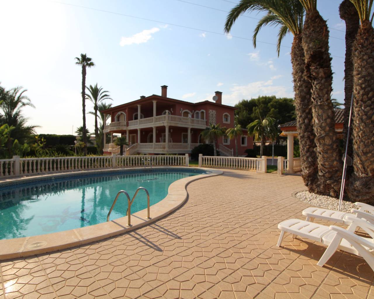 This property is a fabulous villa surrounded by enviable gardens with Mediterranean plants and romantic corners of more than 7,500 square meters in a green and natural oasis that provides you with the great serenity that few places can achieve. The plot is completely landscaped with lush palm trees of great particularity, with a wonderful natural lawn, a pond with natural water that balances the temperature and humidity of its surroundings and fruit trees It stands out for the design of its construction, the qualities of its materials and the elegance of its finishes, as well as for the privacy and tranquility that surround the house. The equipment of the property is very complete with an imposing and stately home with a beautiful pool, a large independent barbecue that has a dressing room with bathroom and shower. The 780 m2 house has two floors connected by an internal staircase and also has a basement. On the main floor we find a beautiful porch, ideal for breakfast, an elegant dining room with magnificent views of the garden, a living room with a library, a room used as a living room, 3 bedrooms, 2 kitchens, one of which has a very spacious dining room with a fireplace and laundry. On the first floor we find a living room and a large terrace, overlooking the pool and the garden, another living room with dining room, 3 bedrooms, one of which has access to a large terrace to enjoy the sunsets, 2 bathrooms, kitchen and laundry. And finally, in the basement, there is a large space used both as a warehouse and a garage. The property has high quality commercial, recreational and sports services in the surroundings, as well as the connection to important communication routes with the main cities by road and with the Alicante-Elche airport.