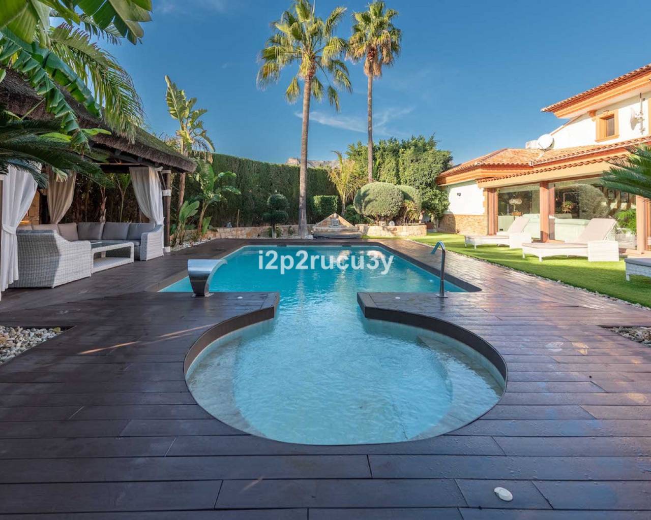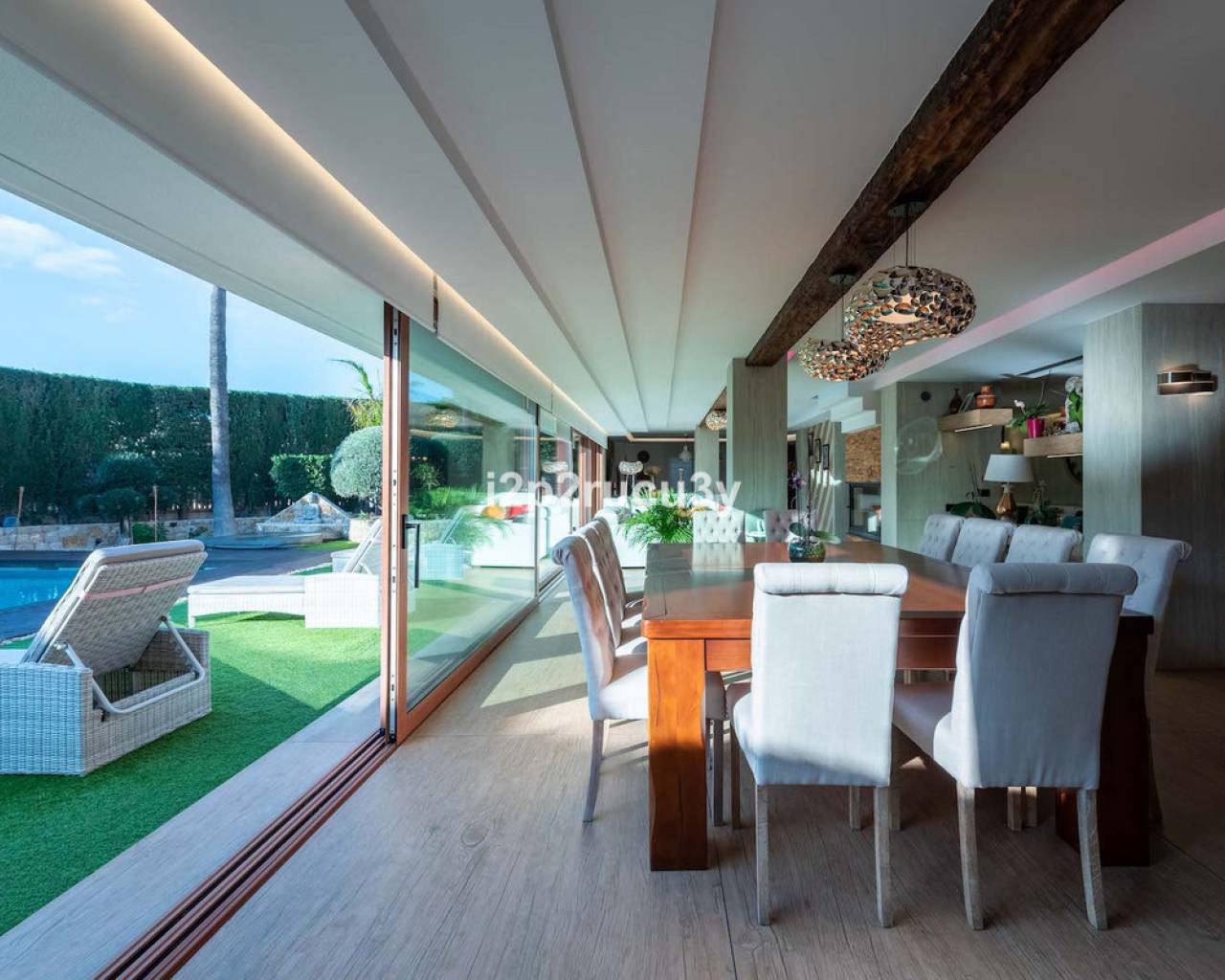 Exclusive Mediterranean House in Calpe: Prime Location and Unique Design Perfect Location This stunning home is situated in one of Calpe's most sought-after areas, just a short walk from schools, sports facilities, supermarkets, and only 800 meters from the town center and the beach. It's ideal for those seeking convenience and proximity to essential services. Mediterranean Design with Modern Details The property, renovated with a contemporary style, seamlessly blends Mediterranean charm with high-end finishes. Every corner has been thoughtfully designed to provide a sophisticated and comfortable living experience, both inside and out. Bright and Spacious Interiors Upon entering, you'll find an elegant foyer with a stunning wooden staircase leading to the upper floor. This level houses three spacious bedrooms with built-in wardrobes, two of which include walk-in closets. Each bedroom has its own en-suite bathroom. On the main floor, there is a fourth bedroom with a private bathroom and an additional guest bathroom. The expansive living-dining area stands out for its brightness, thanks to large windows that flood the space with natural light. The neutral decor, accented with vibrant touches, creates a welcoming ambiance. Completing this space is a modern industrial kitchen equipped with state-of-the-art appliances, perfect for culinary enthusiasts. Stunning Outdoor Spaces The garden is designed to impress, featuring a variety of plants, palm trees, ancient olive trees, and fruit trees. The pool area, surrounded by decking and grass, is perfect for sunbathing. Additionally, a chill-out area with a bar, built with natural materials like African reed, provides an ideal spot for summer evenings. Additional Amenities The lower level of the home features a fully equipped gym, along with a jacuzzi and a complete bathroom. There is also an exclusive wine cellar, perfect for enjoying wine with friends and family. Other extras include a multi-car garage, smart home system, security alarm, surveillance cameras, storage rooms, and more. Contact us for more information and discover this gem in Calpe.