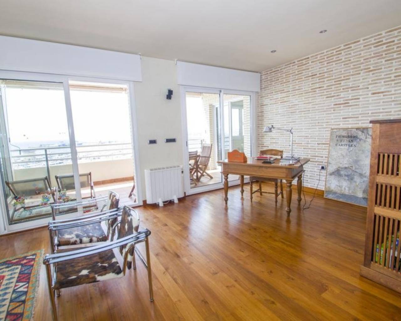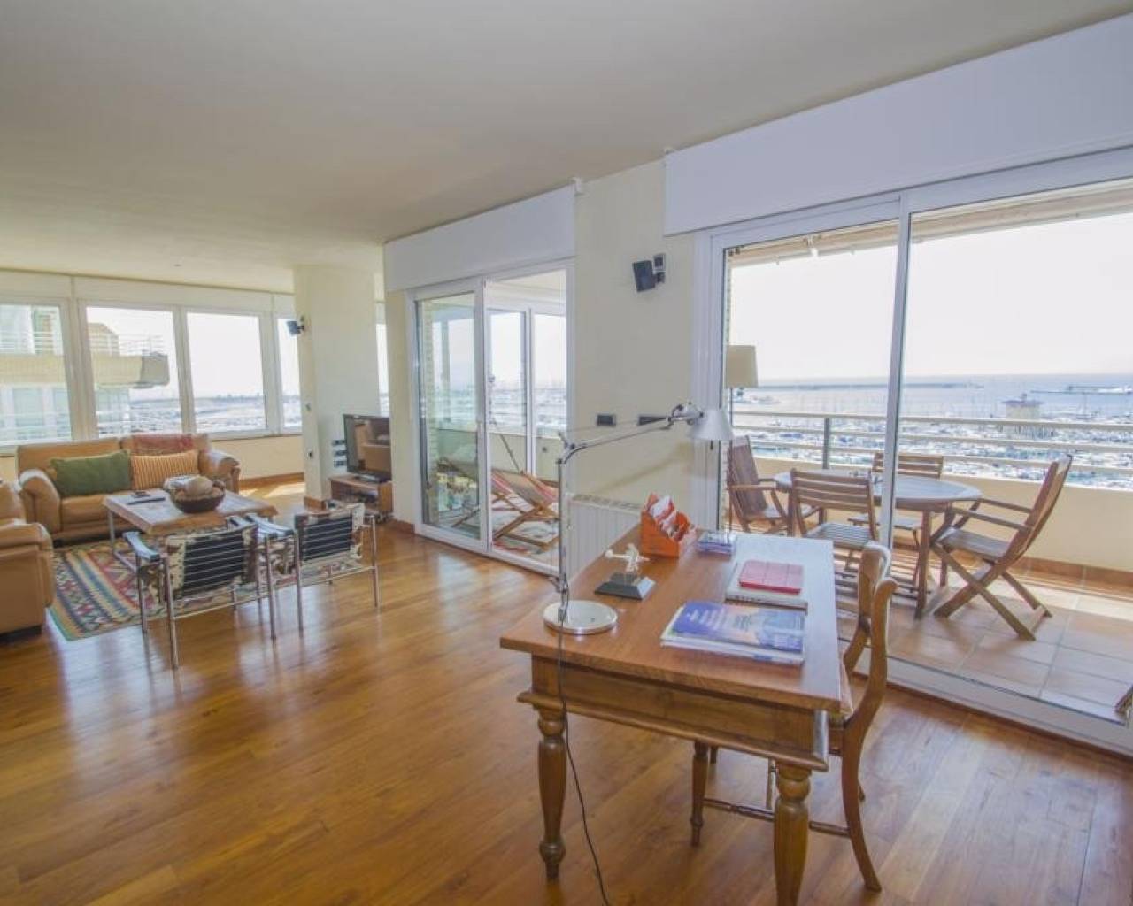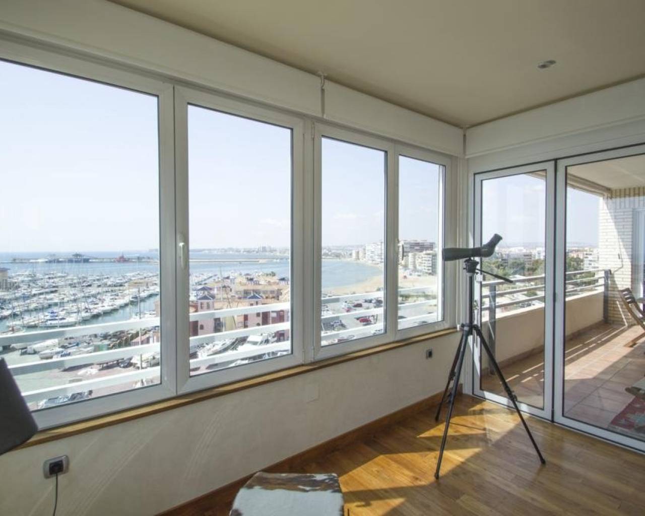 We are privileged to be able to offer this spectacular apartment in central Torrevieja. Three large bedrooms, one with en-suite bathroom and walking closet. Adjacent to the other bedrooms is another bathroom. From the living room, kitchen and dining area you can enjoy a fantastic view of the Mediterranean Sea, the coast and the beautiful harbour. The kitchen is built with the highest quality white goods, stove and oven for the professional home cook. Descaling filters are available for incoming water to the entire apartment. There are also osmotic filters for drinking water and ozone filters for washing machines, which means that detergents can be excluded. Kitchen table in own design and living room furniture in exclusive design, including a by the French brand Le Corbusier. Solid wood flooring throughout the home, as well as solid specially designed doors and handles. In the patio, with entrance from the kitchen, there is a washing machine and dryer. AC is available in parts of the apartment as a complement to the existing gas heating. Balcony for cozy evenings at home. Only 100 meters to the beach and all the city's facilities.