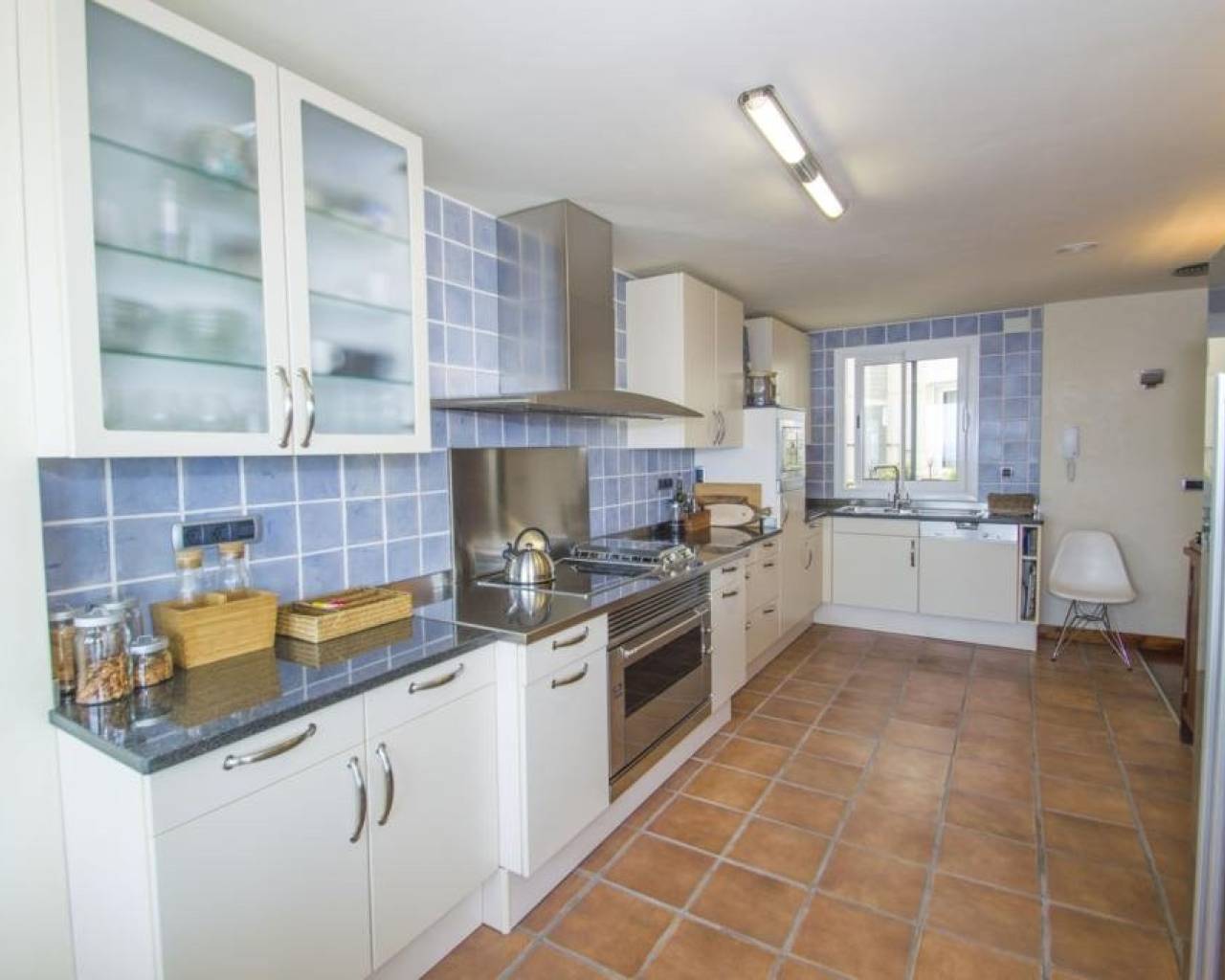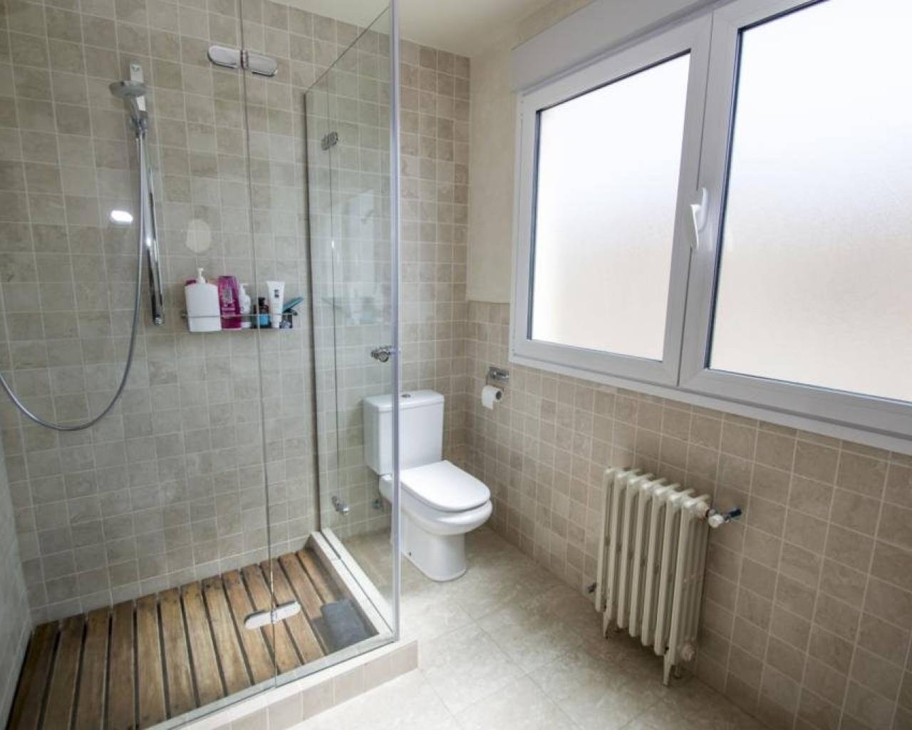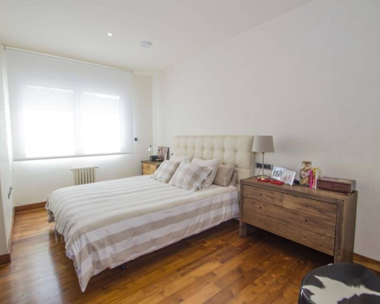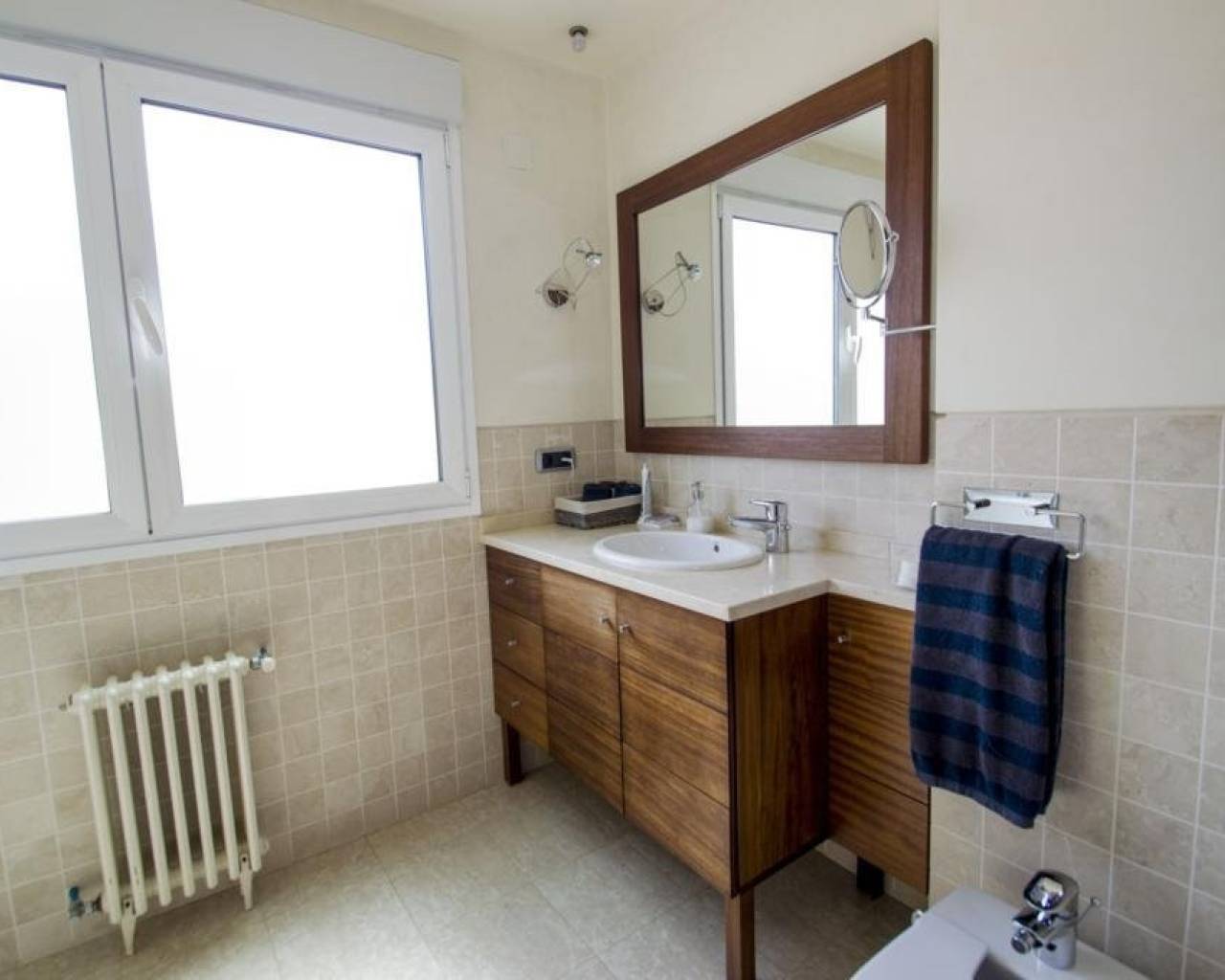 We are privileged to be able to offer this spectacular apartment in central Torrevieja. Three large bedrooms, one with en-suite bathroom and walking closet. Adjacent to the other bedrooms is another bathroom. From the living room, kitchen and dining area you can enjoy a fantastic view of the Mediterranean Sea, the coast and the beautiful harbour. The kitchen is built with the highest quality white goods, stove and oven for the professional home cook. Descaling filters are available for incoming water to the entire apartment. There are also osmotic filters for drinking water and ozone filters for washing machines, which means that detergents can be excluded. Kitchen table in own design and living room furniture in exclusive design, including a by the French brand Le Corbusier. Solid wood flooring throughout the home, as well as solid specially designed doors and handles. In the patio, with entrance from the kitchen, there is a washing machine and dryer. AC is available in parts of the apartment as a complement to the existing gas heating. Balcony for cozy evenings at home. Only 100 meters to the beach and all the city's facilities.
