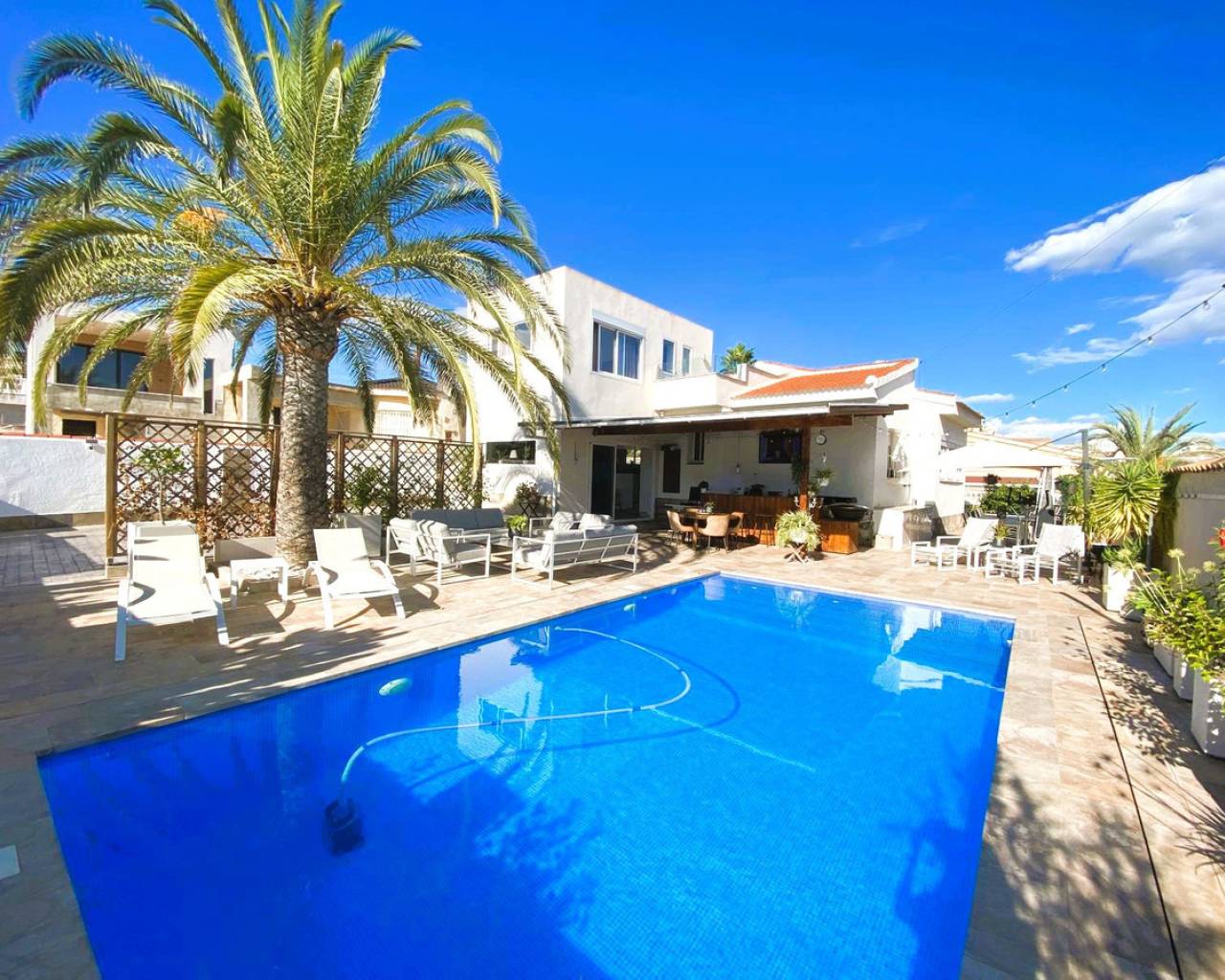 Do you want a villa with everything extra? Then you have found your home here! A large plot with a thoughtful layout. Here, plants and flowers thrive alongside mandarins, oranges, kiwis, limes, passion fruits, and mangos. There are planting boxes for vegetables and herbs at the back, along with two storage sheds. A large saltwater pool leads you to an outdoor kitchen (with refrigerator/freezer and dishwasher) and bar, as well as spacious areas for dining furniture, a lounge section, and sun loungers. The house also opens up with a spacious and modern kitchen, a TV room, a large bathroom with a shower, and four bedrooms, including a master bedroom with a walk-in closet and an ensuite bathroom with a shower. There is underfloor heating in the ensuite bathroom and the kitchen. Upstairs, you will find an additional apartment with a large bedroom, a bathroom with a shower, and a balcony with a fantastic view of both the salt lakes and the sea. Integrated air conditioning and two separate AC units in one of the bedrooms (currently an office) and in the apartment on the upper floor. There is parking for two cars on the property with an automatic gate. Automated irrigation for pots and trees. Within walking distance, there are restaurants, bars, shopping, a gym, and a very good new bodega, as well as Marquesa Golf Course two kilometers from the house. Welcome home!