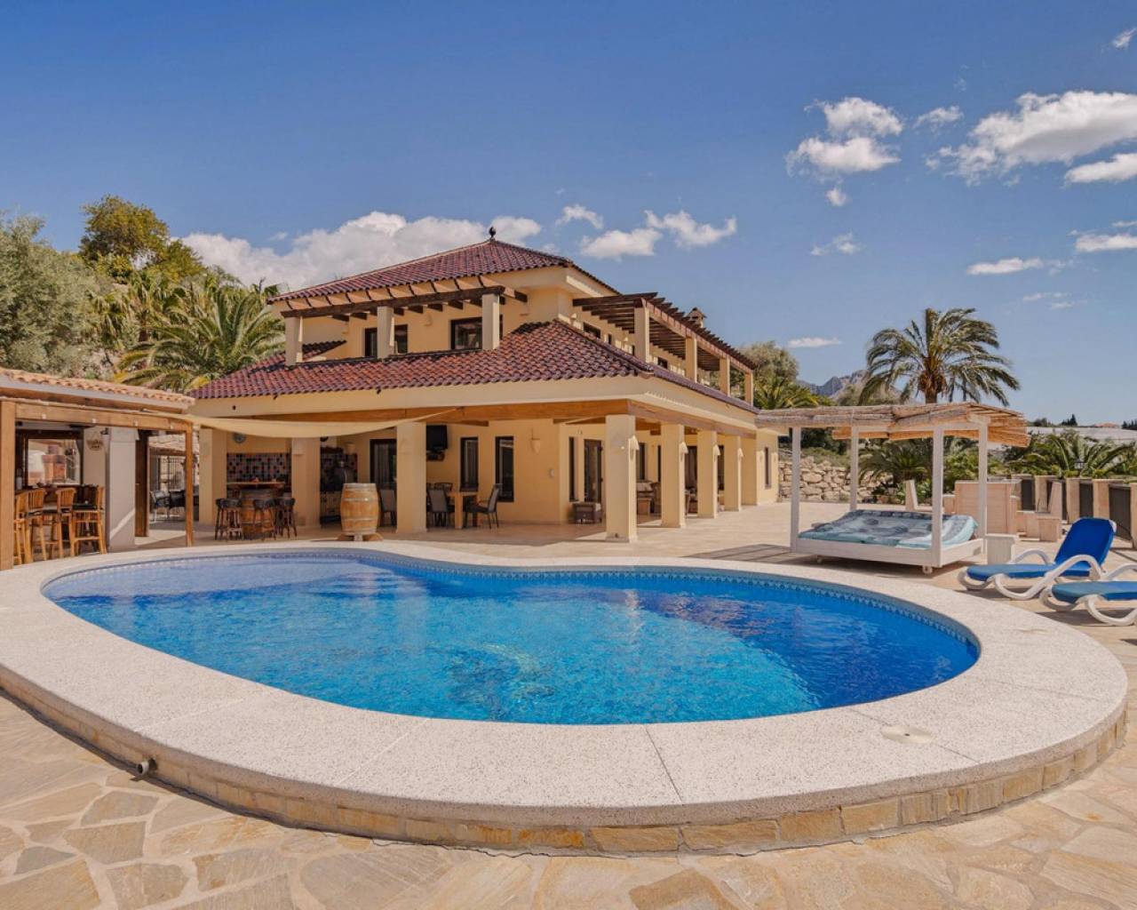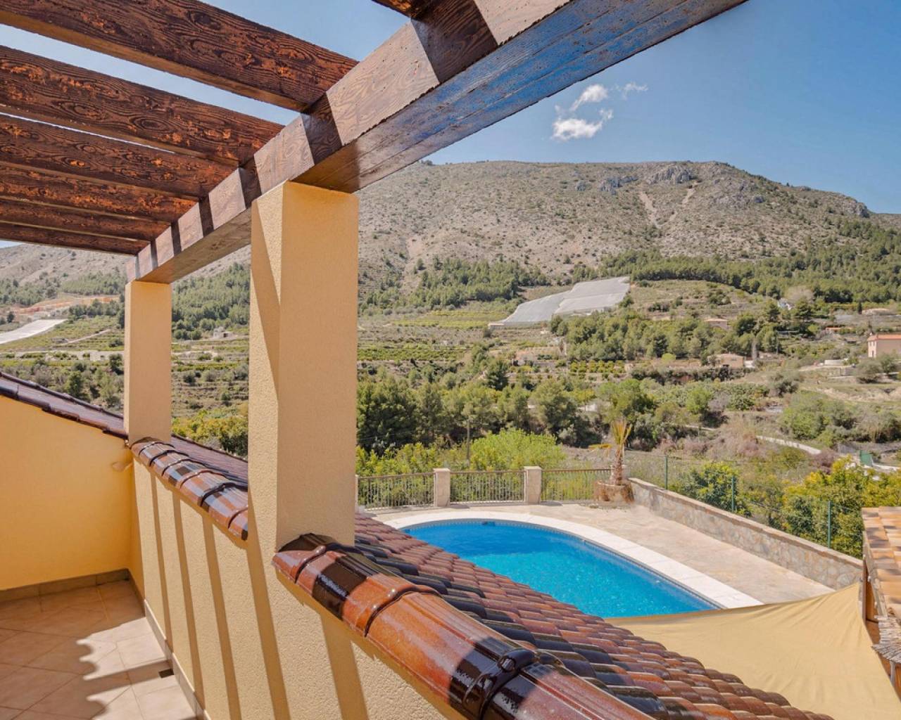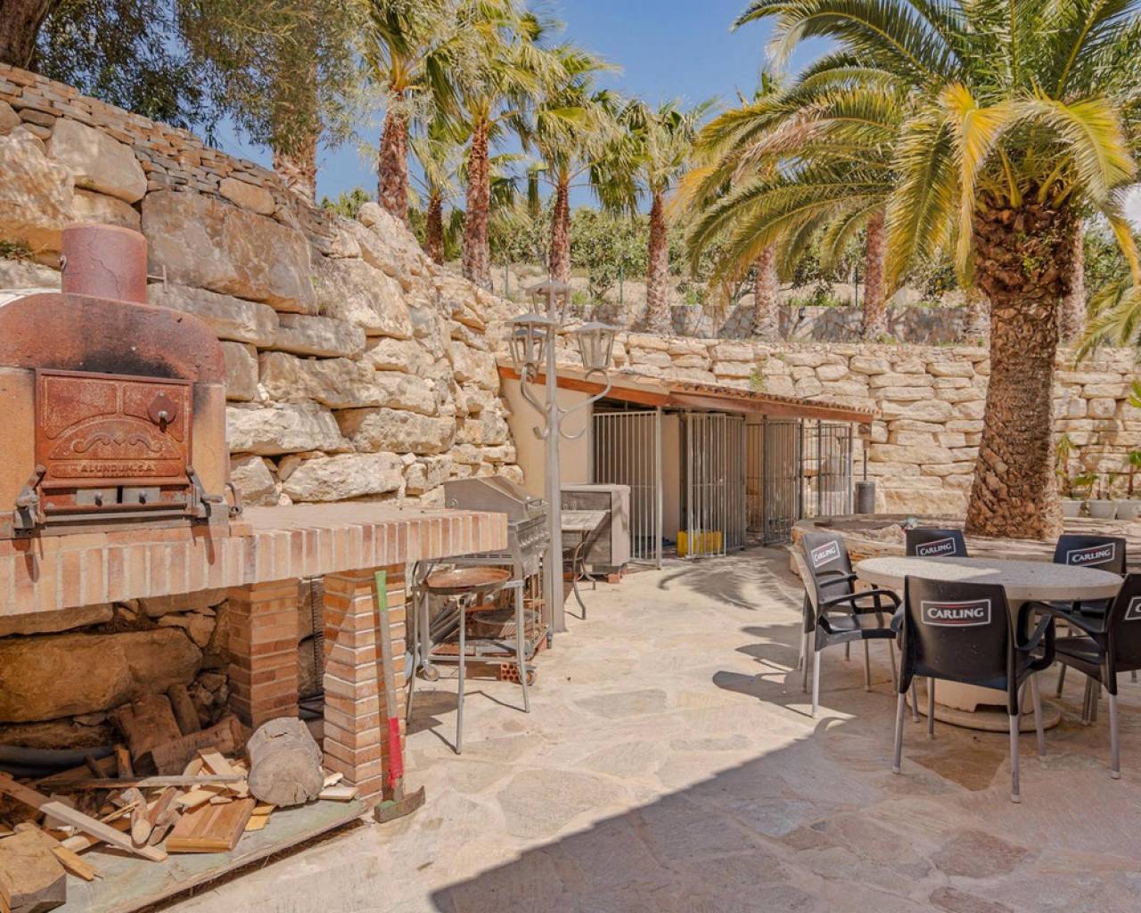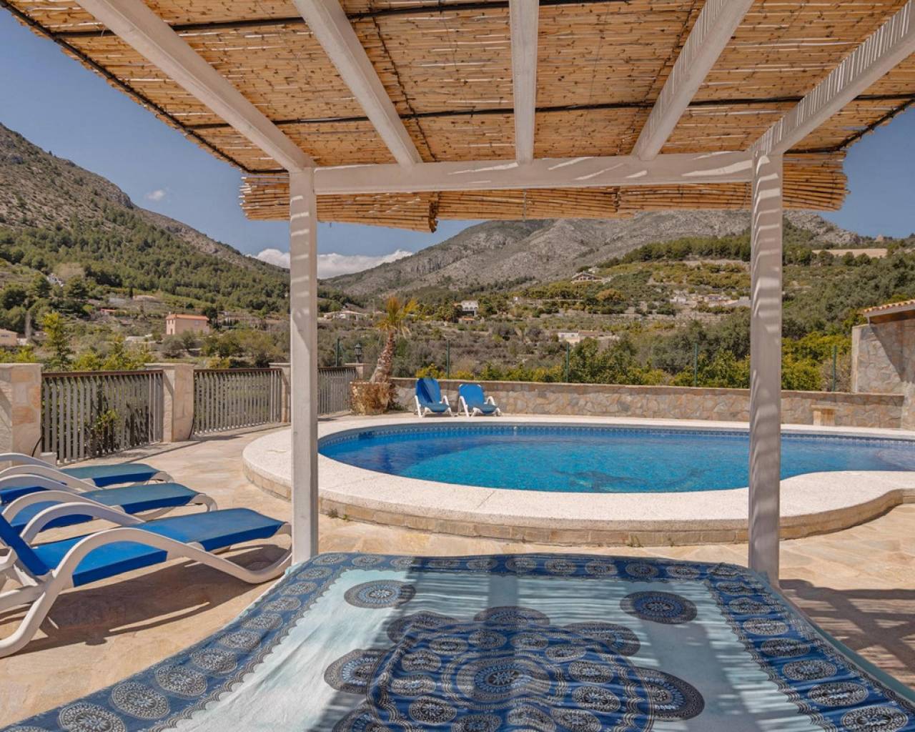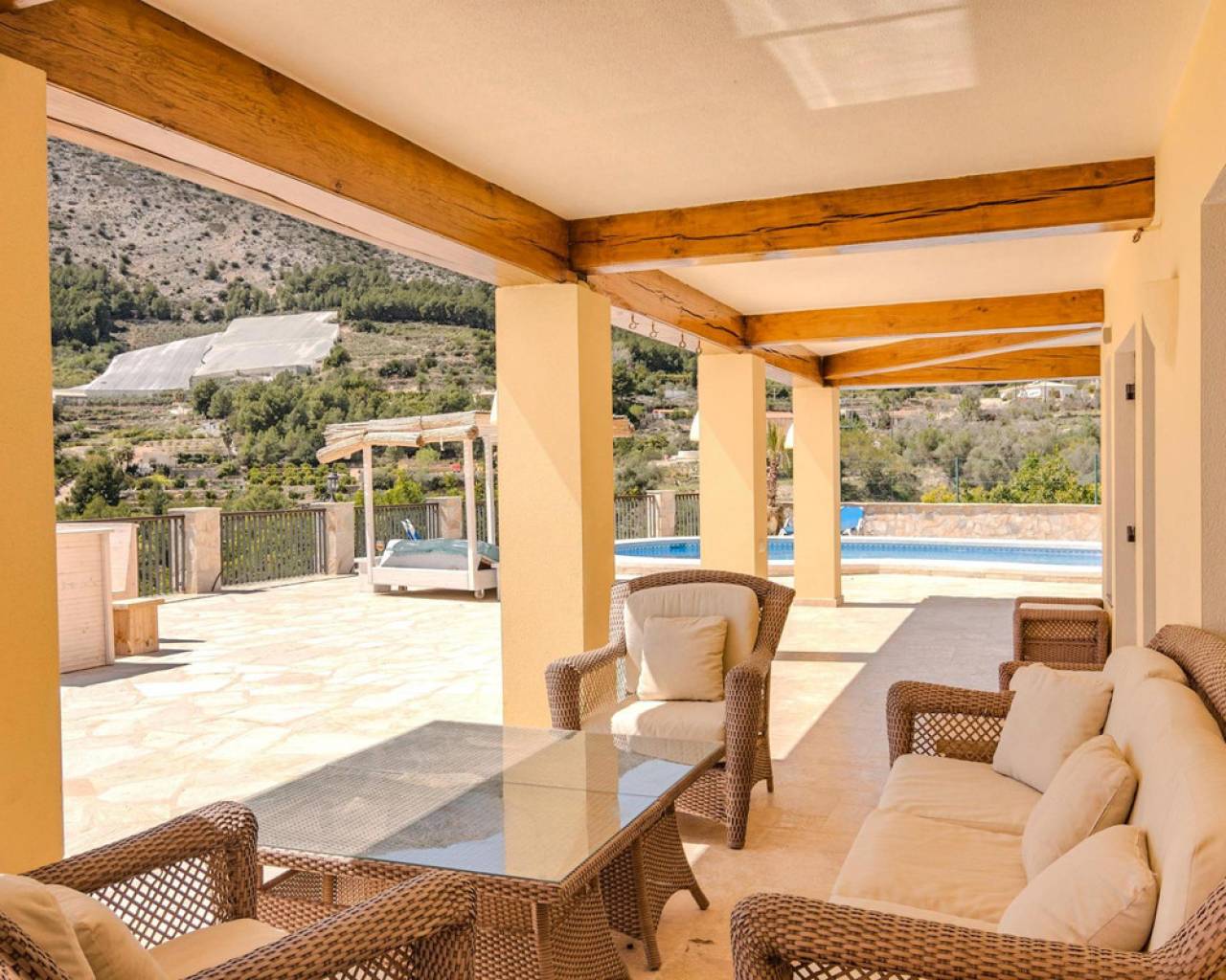 . Magnificent 4 bedroom villa in the hills of Callosa d'en Sarria     Great location in an oasis of tranquillity with panoramic views over the hills and even sea views!   This great house with a living area of approx. 320 m² was built under Dutch direction in 2012,2013 on a plot of 10.003 m². It is located in a rural area at approx. 4 km. from Callosa amidst orange, olive and medlar plantations. On the ground floor the house consists of an "official" entrance with spacious hall and guest toilet. The large living room access to a large, covered and open terrace and pool from where the view is overwhelming. The kitchen with utility room is large and fully equipped. Furthermore, on this floor the "master bedroom" with bathroom en-suite and walk-in closet, access to the large terrace. On the first floor there are three bedrooms, one with en-suite bathroom, each with its own terrace, and a second bathroom.  The house has terraces all around, so always a shady spot, and next to the pool a large outdoor kitchen, annex bar, which can be closed in the cooler winter months, so it can be used all year round. In short, a very interesting option for the more demanding enthusiasts!   The distance to the airport is about 80 km., the coast around Altea is 15 km.