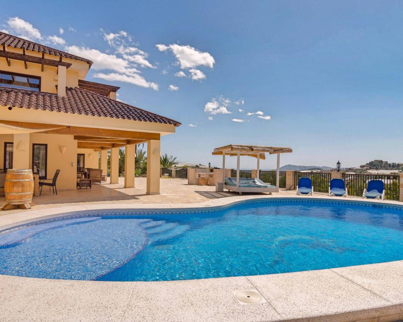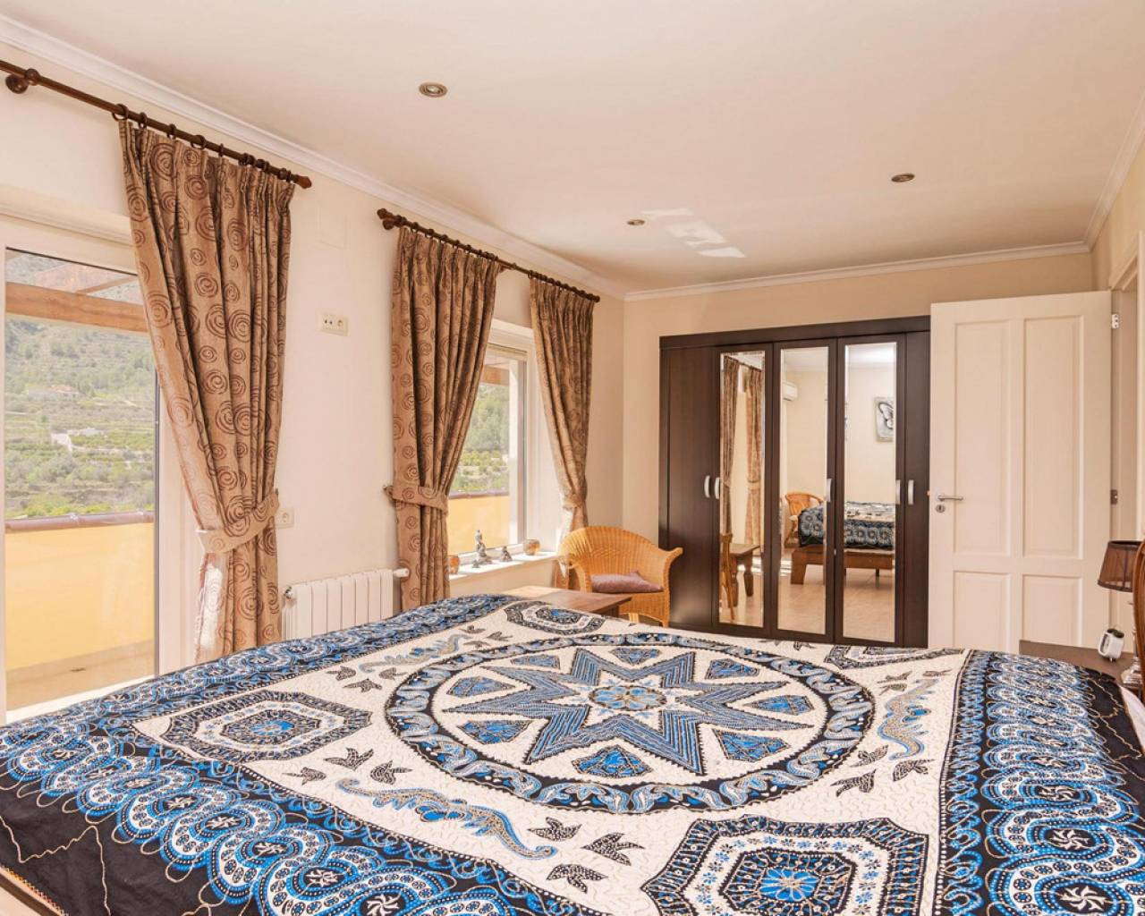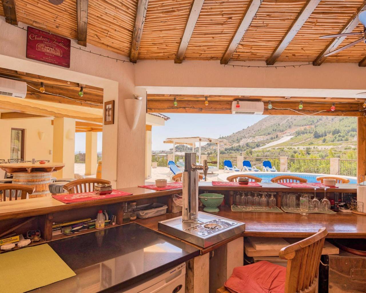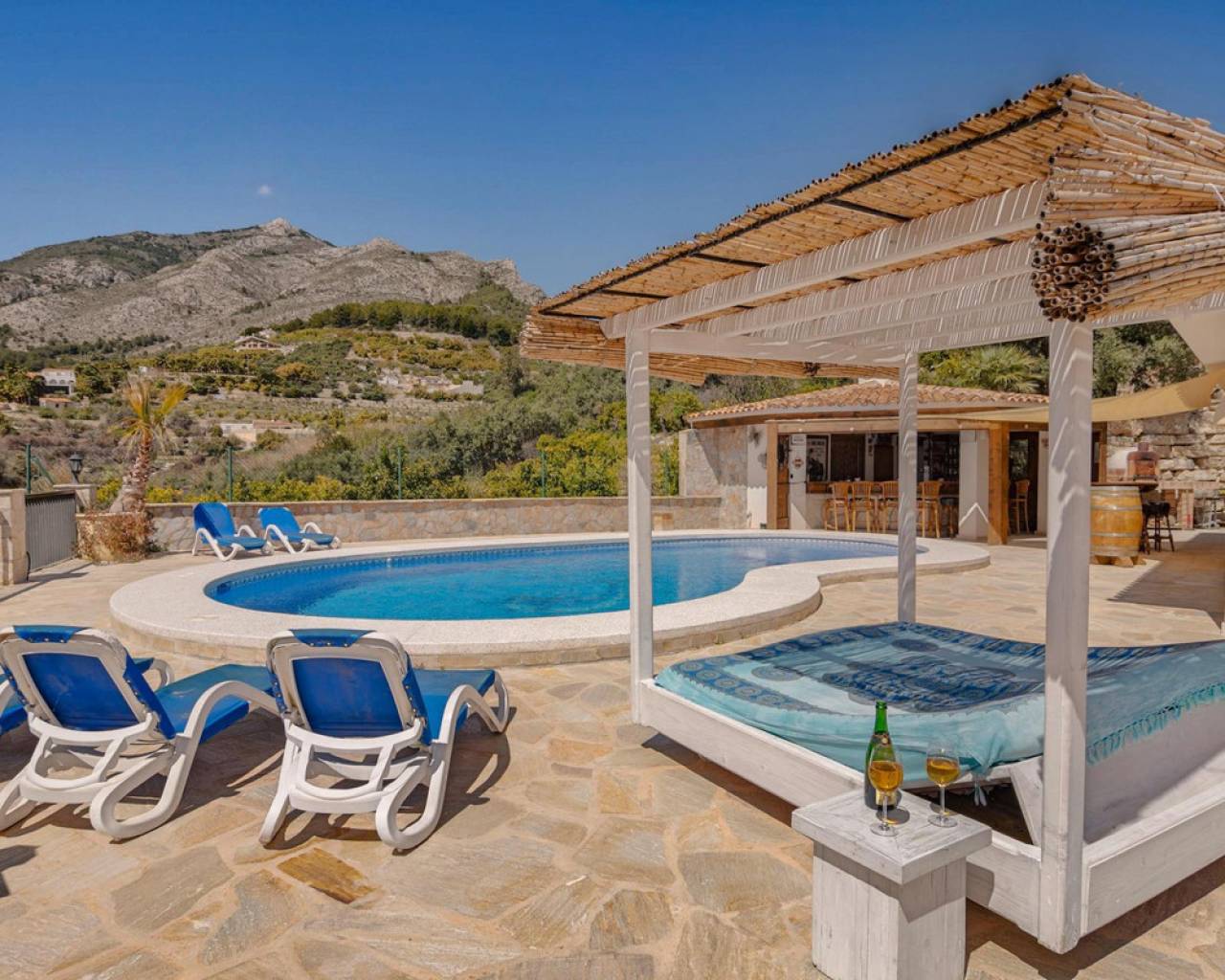 . Magnificent 4 bedroom villa in the hills of Callosa d'en Sarria     Great location in an oasis of tranquillity with panoramic views over the hills and even sea views!   This great house with a living area of approx. 320 m² was built under Dutch direction in 2012,2013 on a plot of 10.003 m². It is located in a rural area at approx. 4 km. from Callosa amidst orange, olive and medlar plantations. On the ground floor the house consists of an "official" entrance with spacious hall and guest toilet. The large living room access to a large, covered and open terrace and pool from where the view is overwhelming. The kitchen with utility room is large and fully equipped. Furthermore, on this floor the "master bedroom" with bathroom en-suite and walk-in closet, access to the large terrace. On the first floor there are three bedrooms, one with en-suite bathroom, each with its own terrace, and a second bathroom.  The house has terraces all around, so always a shady spot, and next to the pool a large outdoor kitchen, annex bar, which can be closed in the cooler winter months, so it can be used all year round. In short, a very interesting option for the more demanding enthusiasts!   The distance to the airport is about 80 km., the coast around Altea is 15 km.