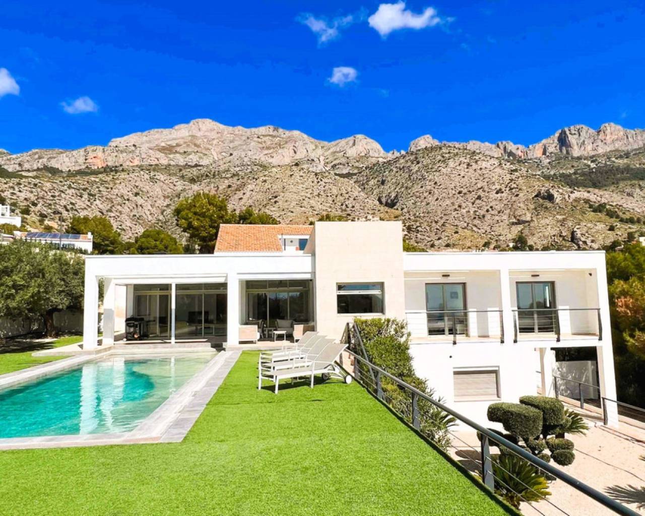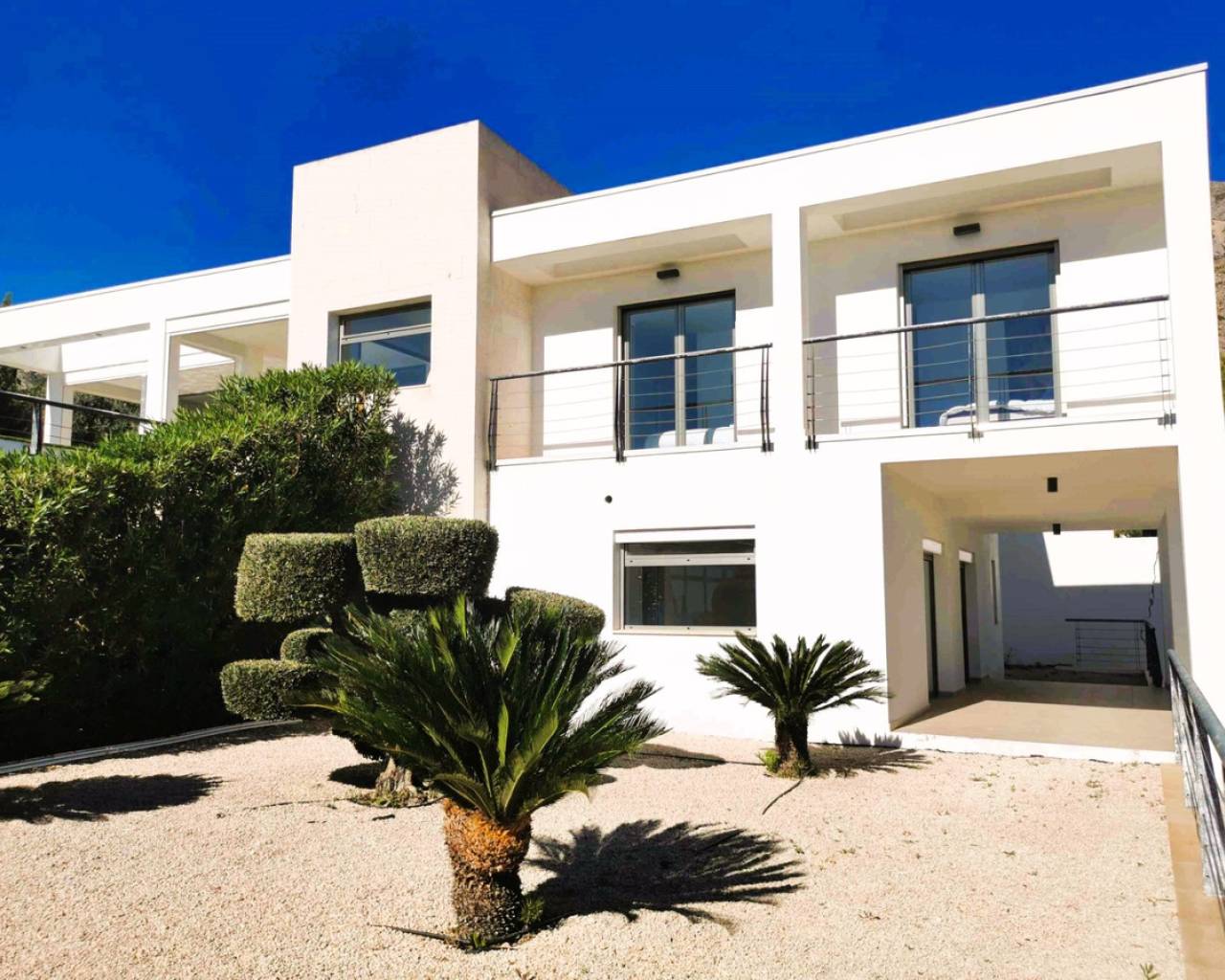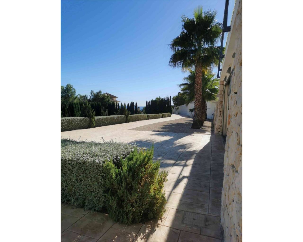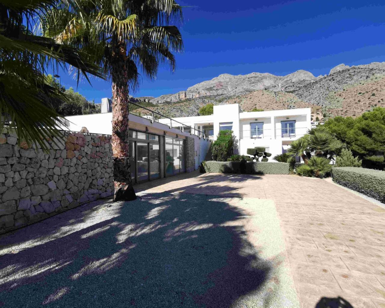 Spacious villa of 330 m2 on a plot of 2000 m2 in the exclusive area of Monterico, Altea la Vella. The property is distributed over two floors, fully fenced and with two automated entrances for convenient access to the garages or the main entrance of the house. The main access to the villa is on the first floor. The first floor consists of a spacious lounge/dining room with a wood burning fireplace and with floor-to-ceiling windows giving access to the covered terrace and swimming pool. On the same floor there are 3 bedrooms with fitted wardrobes, en-suite bathrooms and terrace. There is also a guest toilet located in the hallway. The kitchen is independent with access to the terrace with pool. The lower floor consists of a lounge/games room, with exit to a large covered terrace and the gardens, 2 bedrooms with fitted wardrobes and en suite bathrooms. Also on this floor you will find the separate laundry room and storage room. There is an additional 50m2 of space available for extension, offering many possibilities such as a storage room, hobby area, wine cellar, home cinema etc. The salt water infinity pool measures 12 x 4m and is equipped with a self-cleaning system, counter-current swimming pump, heat pump and LED lighting. The water is kept clean and warm with a fully automated insulated slatted cover. The orientation of the house is south facing. It has top of the range Panasonic air conditioning/heating and security system. and security system. There is a spacious garage of almost 50m2 with ample outdoor parking. The house has magnificent views to the sea, the mountains and the swimming pool, low maintenance gardens with automatic watering system installed, Air conditioning hot and cold and double glazing. Altea la Vella is located on 5 min. drive, 7 km from Altea, 5 km from the Olla beach.