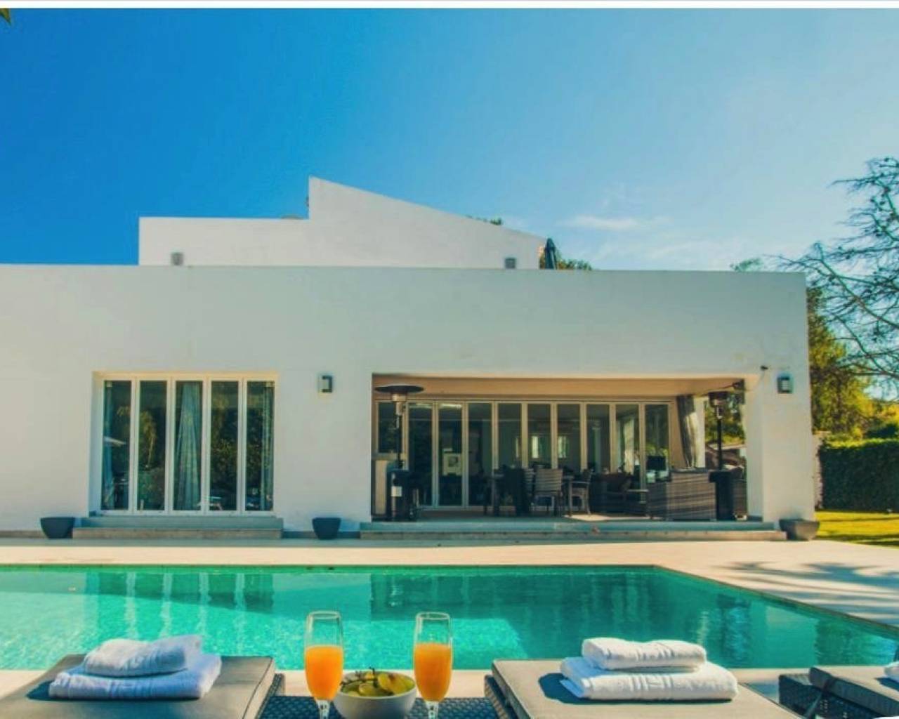 MODERN VILLA WITH PRIVATE POOL IN JÁVEA 6 Bedroom. LAYOUT: The Villa is contemporary and offers all the comforts of a modern property. As soon as we enter, to our left is the American kitchen composed of all the necessary appliances to prepare delicious meals, with an ideal central island. The dining room is opposite the kitchen consisting of a table and chairs. The living room, with access to the garden, is made up of two fourseater sofas each, an armchair, a bench for three guests and a coffee table. We will also find a TV in this space. On this floor there are four bedrooms: three with a double bed each and one with a kingsize bed and a bathroom with a bathtub en suite. Two bathrooms with shower are also located on this floor. Climbing the internal staircase we access the upper floor of this magnificent villa. Two bedrooms, one with a double bed and an ensuite bathroom with shower; and another with a kingsize bed and an en suite bathroom with a bathtub, make up this floor. EXTERIOR: The garden of the villa is full of plants and lemon trees . The pool is located in the middle of the garden and is surrounded by hammocks to enjoy the good Mediterranean climate. Under the porch, we find an outdoor dining table with table and chairs, as well as a bar where we can serve refreshments in summer. In addition, we also have a small chill out area with a sofa and two armchairs where we can relax on our vacations. Thus, another chill out area is located next to the pool with enough capacity for all the guests of the villa. In the other part of the accommodation there is a trampoline as well as a space to exercise outdoors. The villa is located in a quiet residential area. SITUATION: The villa is located in a quiet residential area where privacy, relaxation and comfort are synchronized to offer an unforgettable stay and experience. The villa is just a few minutes from all amenities such as restaurants, supermarkets and activities in the charming town of JÁVEA.
