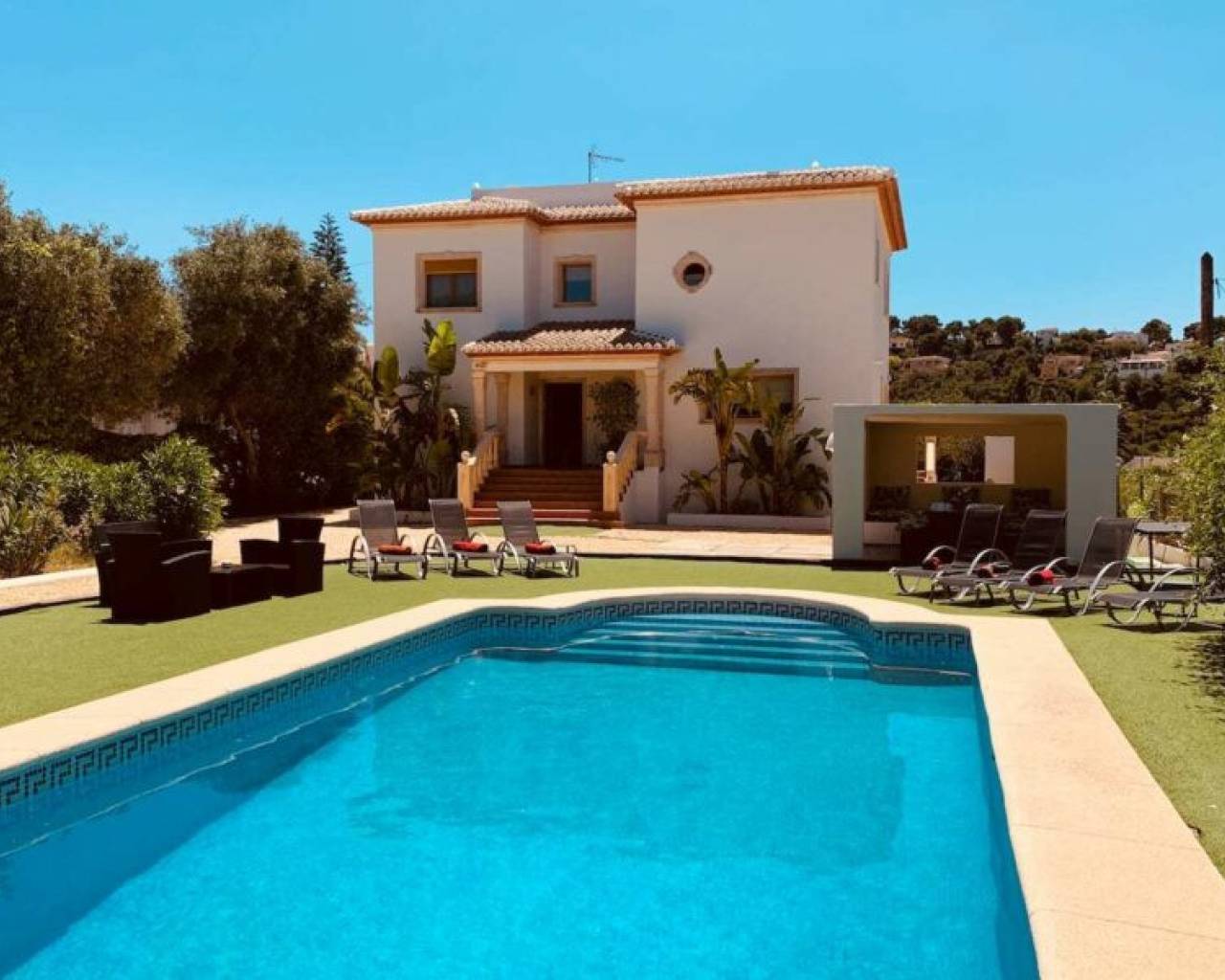 Spacious Luxery Villa of 295 m2, on a big flat plot of 1.700 m2, located in a quiet and private area of Portixol, Cap Marti in Jávea. Only 5 min from beaches of Arenal and walking distance to beautifull other bays of Javea .Enjoy the open views over the valley and the azul blue Mediterranean sea from the upper terrace.Outside is the 8m x 4m pool surrounded with sunbeds and a nice chillout Poolhouse with BBQ area with seating, table, bar and barbecue. Parking for several cars.The spaceThe villa faces south and consists of a large entrance hall; a spacious living and dining room with double height ceiling and fireplace; a very spacious fully equipped kitchen with bar, dining area and direct access to the garden; a huge master bedroom with dressing room, large ensuite shower room and a private terrace; 4 more double bedrooms; a bathroom; a shower room; a spacious naya with open terrace next door and a large roof terrace with beautiful views over the area, the Montgó and the Sea. The villa has air conditioning (hot and cold), gas central heating and double glazed aluminum windows.Familyfriendly villa with rooftop terrace. You'll have the entire home to yourself and will only share it with other guests in your party at this Stunning, Spacious, Family Friendly Villa With Pool, Garden, A/C AND WifiA spacious American style villa perfect for families with children. The villa is a modern, well equipped villa with Air conditioning in each bedroom (installed in 2019) & a large lawned rear garden and a private pool area at the front as well as shaded naya and rooftop terrace with spectacular panoramic views.In 2016 a summer house and bbq area was added (with a new built in gas barbecue at the rear) to the front of the house, so there is now a lovely shaded space to dine/relax in around the pool. The villa boasts five large bedrooms and three bath/shower rooms. A large naya overlooks the rear garden and is the perfect spot for al fresco family dining. This is in addition to the front garden and pool area with summer house and bbq area. There is also a terrace and a roof terrace offering superb panoramic views of the Sea, Montgo mountain and surrounding hillside.The property is a 5 min drive to the main sandy Arenal beach and is in a peaceful area and fully enclosed with off street parking for several cars. WIFI Satellite (English and Spanish) TV Office Area Children's play area OutsideTable Tennis Toys, kids and adults books & games all provided. Rooms open to patios. Kitchens offer refrigerators, stovetops, microwaves, and separate dining areas.Bathrooms include bathtubs or showers, bidets, and hair dryers. Televisions come with satellite channels and DVD players. Additionally, rooms include coffee/tea makers and irons/ironing boards.
