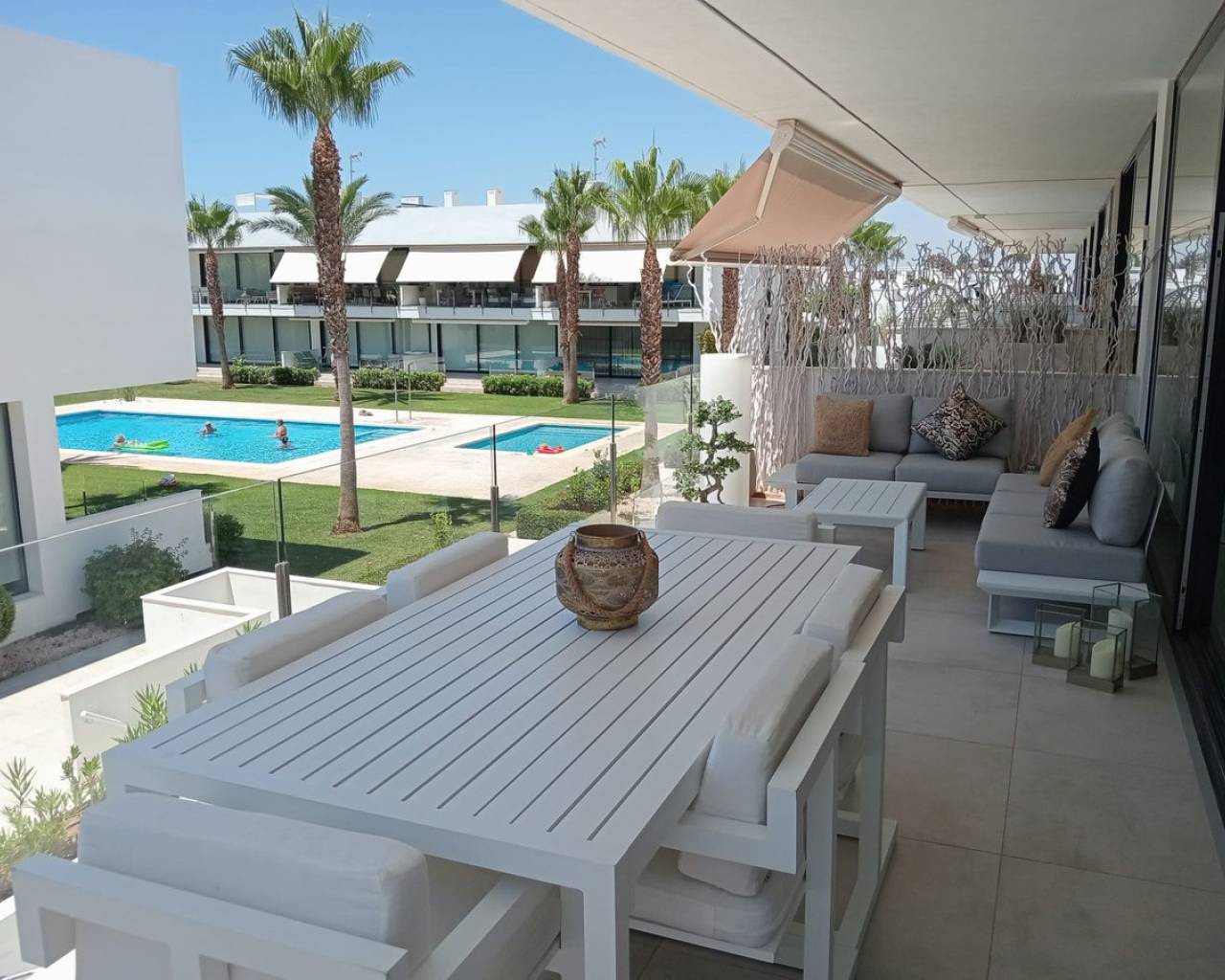 This exceptional modern penthouse in Mar de Cristal captures the perfect balance between contemporary luxury and laid-back coastal living. Ideally positioned just 500 meters from the beach, the property showcases elegant design, high-end features, and breathtaking views, offering a sophisticated retreat in one of Spain's most tranquil seaside settings. The penthouse apartment features a bright, spacious open-plan living room and kitchen that seamlessly connects to a south-facing terrace, creating the ideal setting for indoor-outdoor living. Floor-to-ceiling sliding glass doors on three sides flood the interior with natural light and offer panoramic views of the surrounding landscape. The modern kitchen is sleek and functional, complete with a stylish breakfast bar, perfect for both everyday cooking and casual dining. Step out onto the sun-drenched terrace overlooking the communal gardens and pool, an inviting space to unwind, entertain, or simply enjoy the warm Mediterranean climate. One of the most impressive features of this penthouse is its expansive private rooftop solarium, an exclusive retreat designed for relaxation and enjoyment. Complete with a stylish chill-out lounge and a luxurious hot tub, it offers sweeping views of the sea and surrounding mountains. Whether you're entertaining guests, soaking up the sun, or enjoying a quiet evening under the stars, this rooftop space elevates the coastal lifestyle to a new level of comfort and sophistication. The residence is set within a well-maintained complex featuring beautifully landscaped communal gardens and a spacious swimming pool, offering a peaceful, resort-like atmosphere for residents to relax and recharge. Adding to its appeal, the property is just 500 meters from the beach, allowing for easy, walkable access to the coastline for morning strolls, sunbathing, or a refreshing dip in the sea whenever you please. Mar de Cristal is a picturesque coastal town known for its peaceful atmosphere and relaxed seaside charm. Despite its tranquil setting, it offers easy access to local amenities, restaurants, and a variety of leisure activities. For golf enthusiasts and those seeking world-class facilities, the renowned La Manga Club resort is just a 10-minute drive away, providing championship golf courses, tennis courts, fine dining, and a luxury spa experience. The property can be sold partly or fully furnished, this can be negotiated.