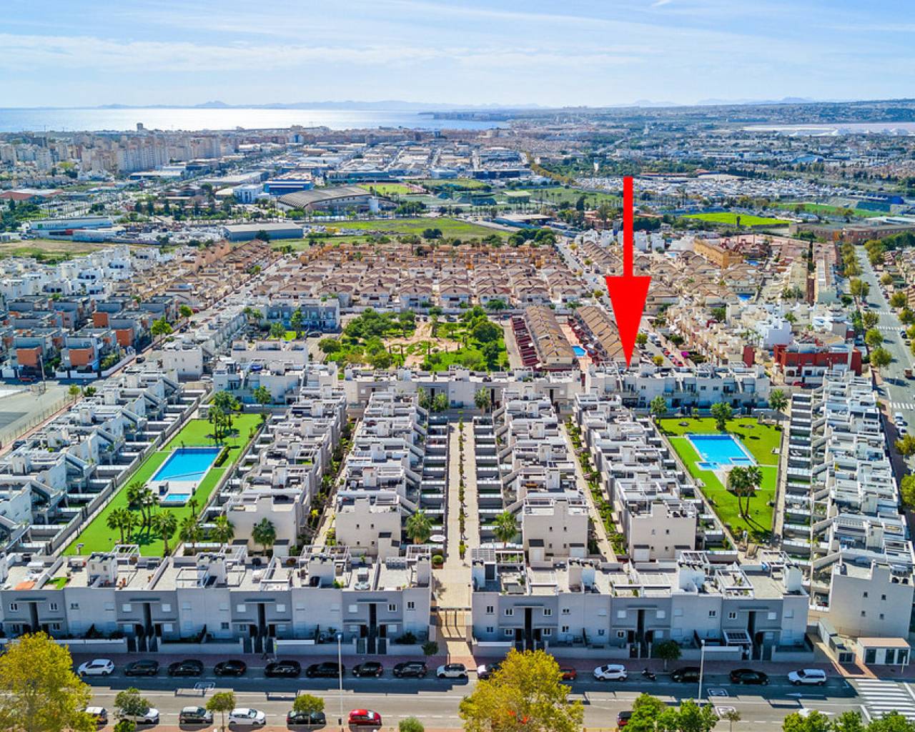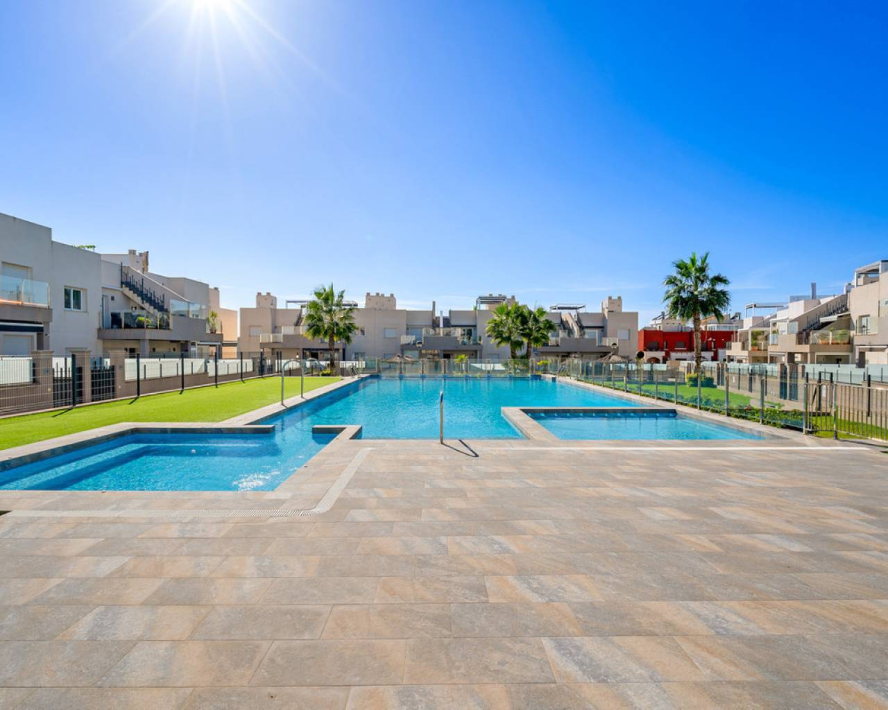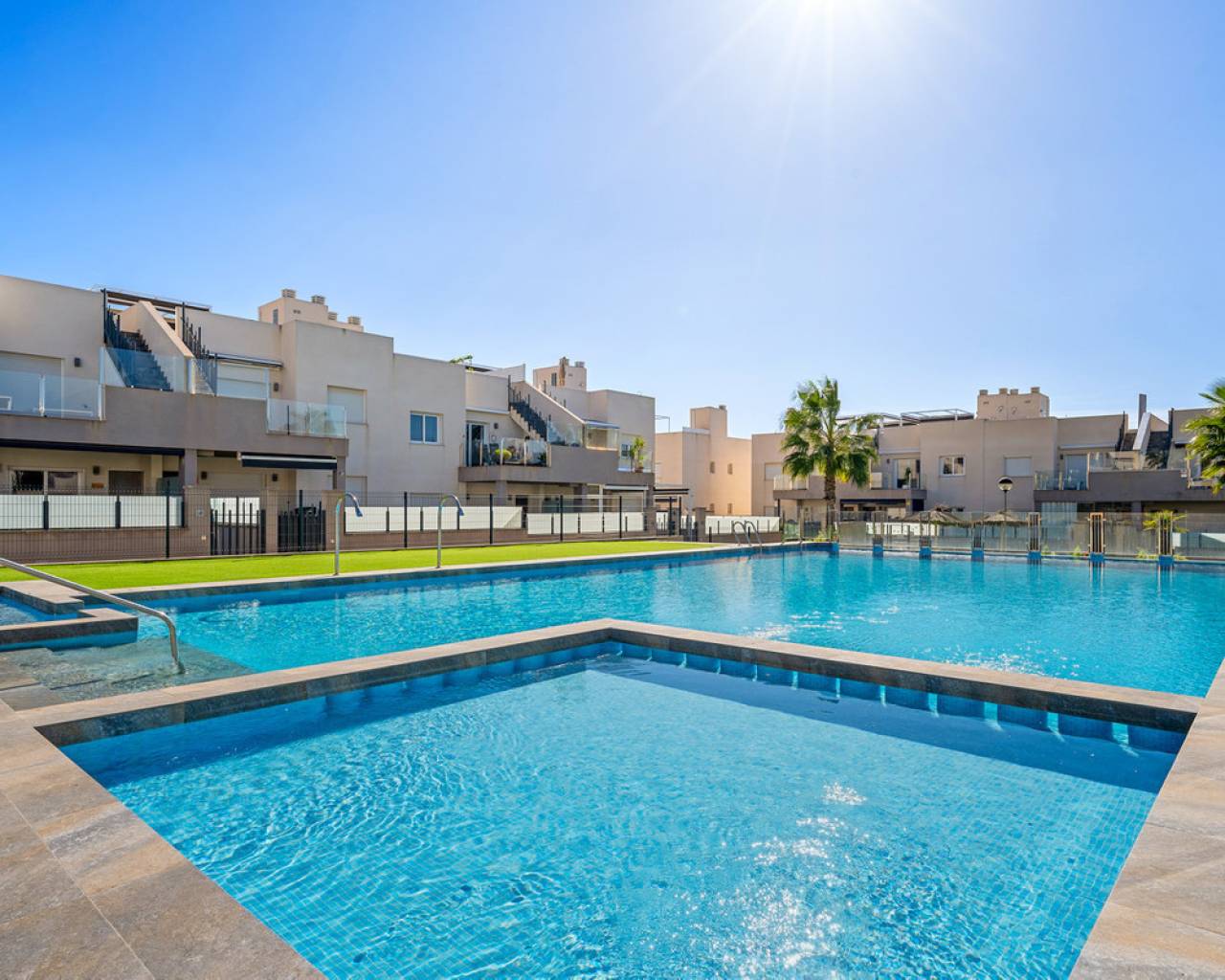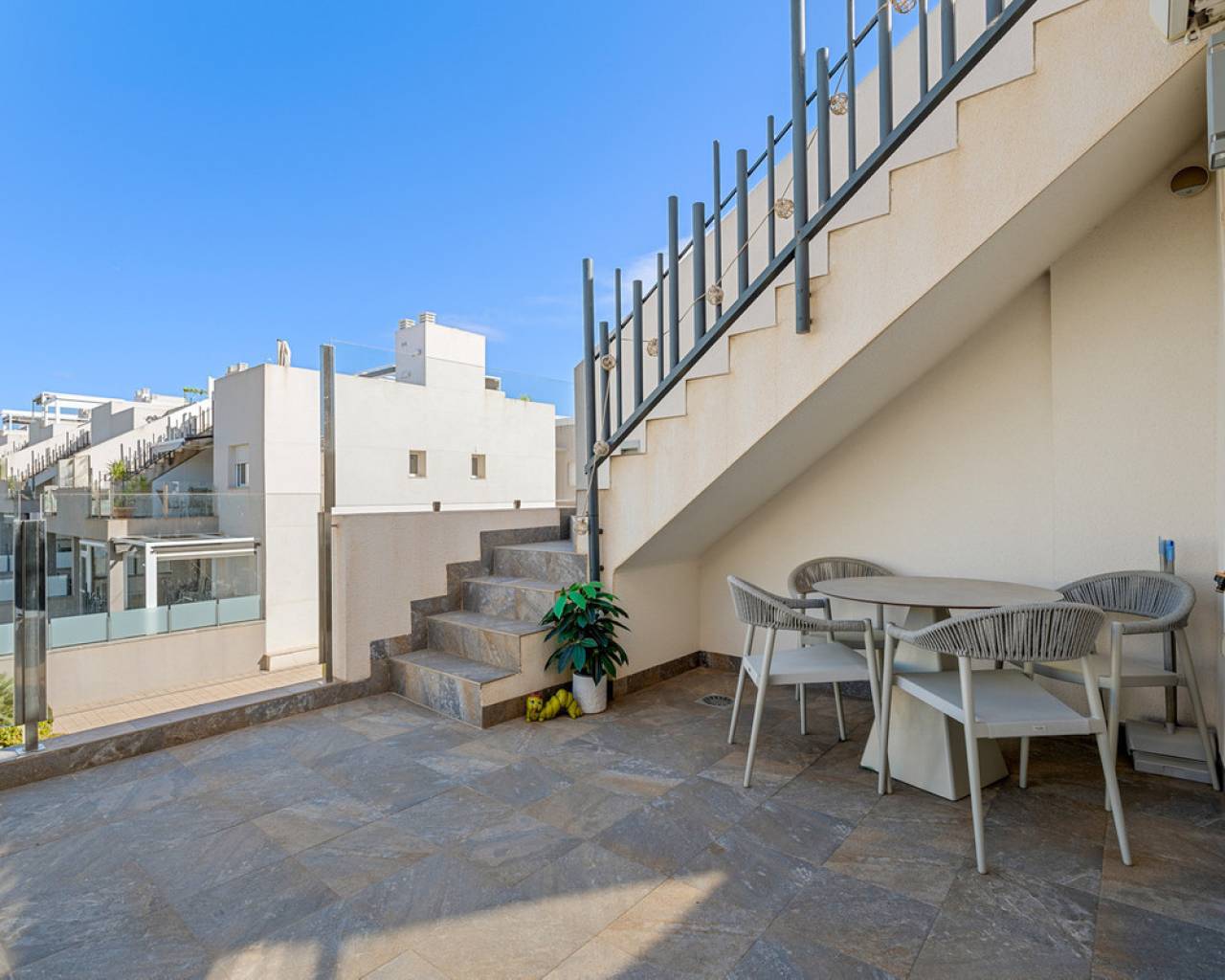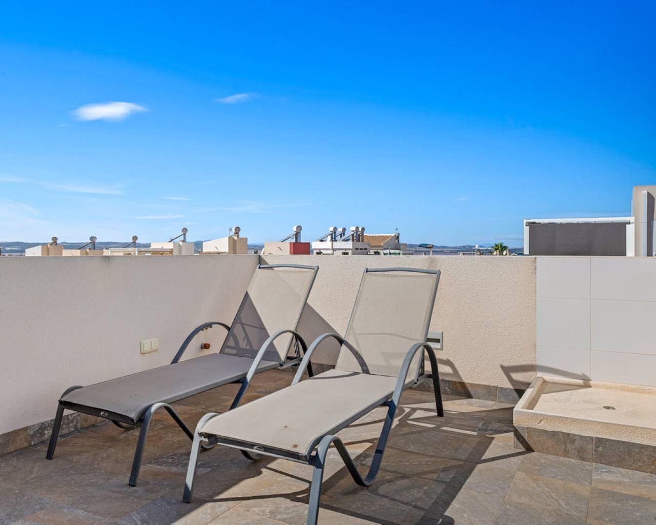 This elegant upper bungalow from 2019 offers a modern and comfortable base in one of Torrevieja's most sought-after areas, namely Aguas Nuevas. The home has 78 m² with two good bedrooms and two stylish bathrooms, one of which is ensuite. There are large built-in wardrobes in both bedrooms, so there is plenty of space for storage. Here is a layout that works perfectly for both year-round use and holiday living. The living room with modern and stylish kitchen as well as living and dining area is bright and well-appointed. From here there is access to a large terrace with views of the common area and one beautiful pool. When you want a little extra freedom and sun, you can simply go up one floor - here a large roof terrace awaits with plenty of opportunities to create your very own outdoor space, whether it is for relaxation, sunbathing or cozy evenings with family and friends. There is also a storage room where both the washing machine and the water heater are conveniently located. The home is being sold furnished with quality fixtures and fittings, so you can move in without any hassle. The central air conditioning system ensures a comfortable temperature regardless of the season. There is underfloor heating in both bathrooms. A large private parking space in the underground parking garage is included in the price – a clear advantage in the area. The complex is fenced and well-maintained and offers two communal pool areas, one of which has a heated jacuzzi. In addition, there are green areas and a playground, making the surroundings safe and pleasant for both adults and children. The location is a big plus. Here you live within walking distance of Mercadona, cafes and restaurants – all within easy reach when everyday life or vacation needs to work smoothly. La Mata beach is only a few minutes away by car or bike, and Alicante Airport can be reached in approximately 40 minutes, making travel days a breeze. It is quite simply a home that combines move-in quality, good outdoor areas and an attractive address near the beach and amenities. An obvious option for those who want a home with both comfort and a top location on the Costa Blanca. Please contact us for more information or if you would like a viewing.