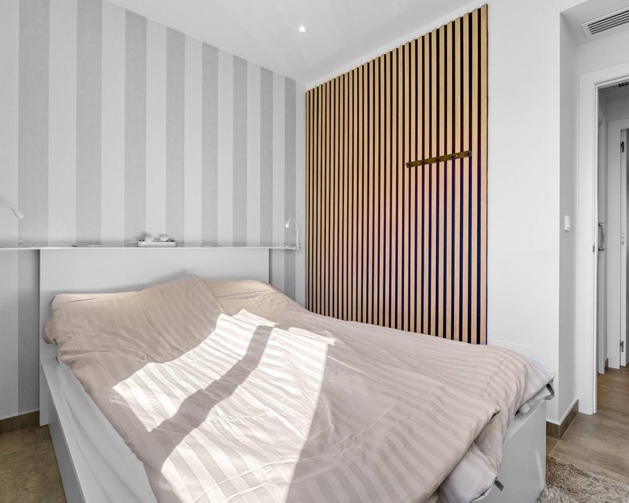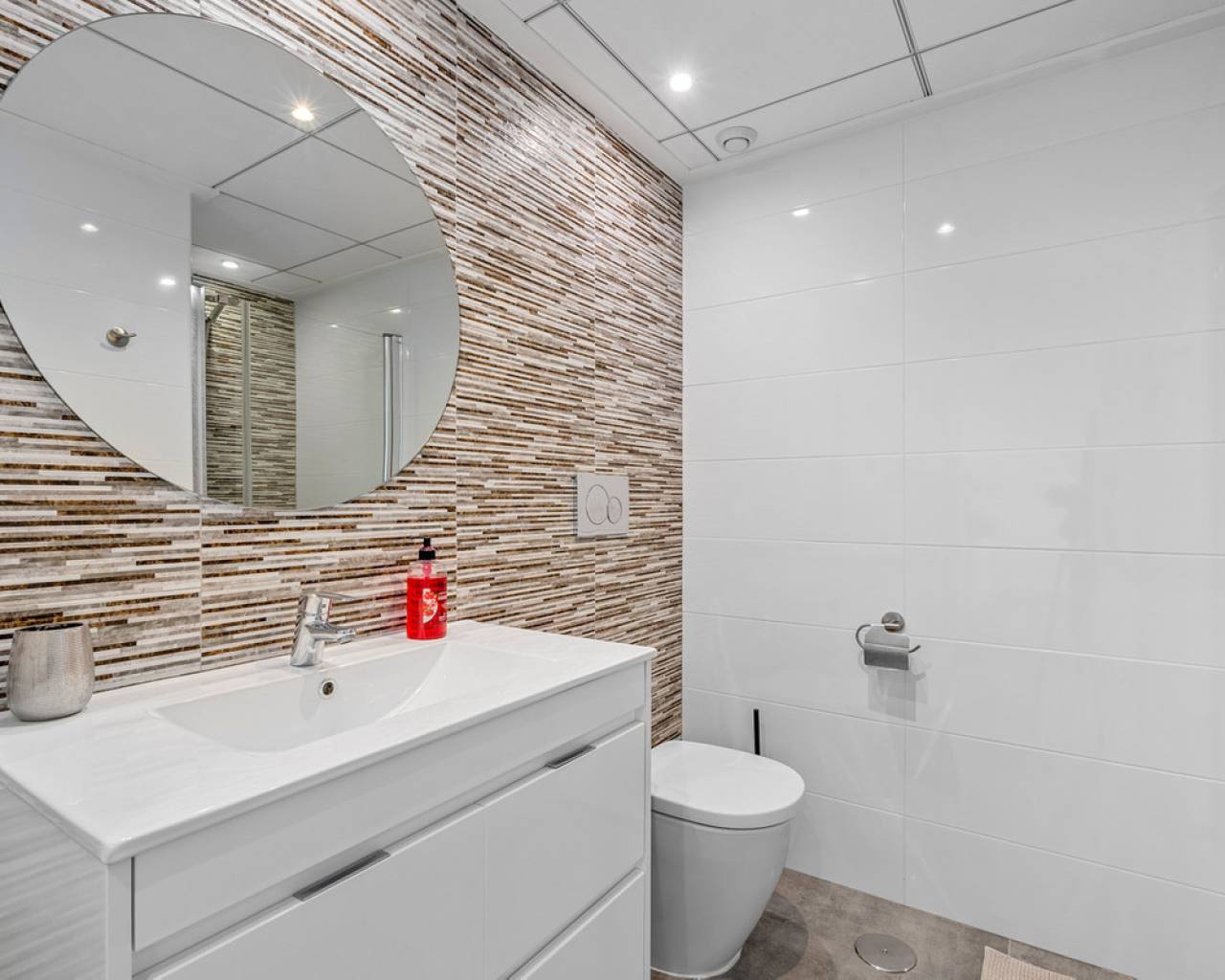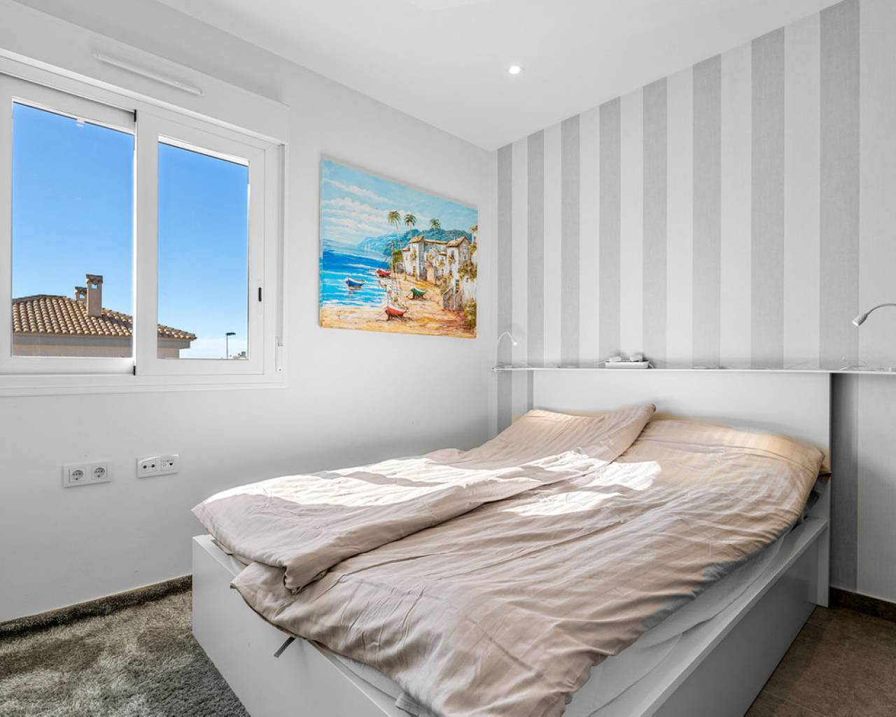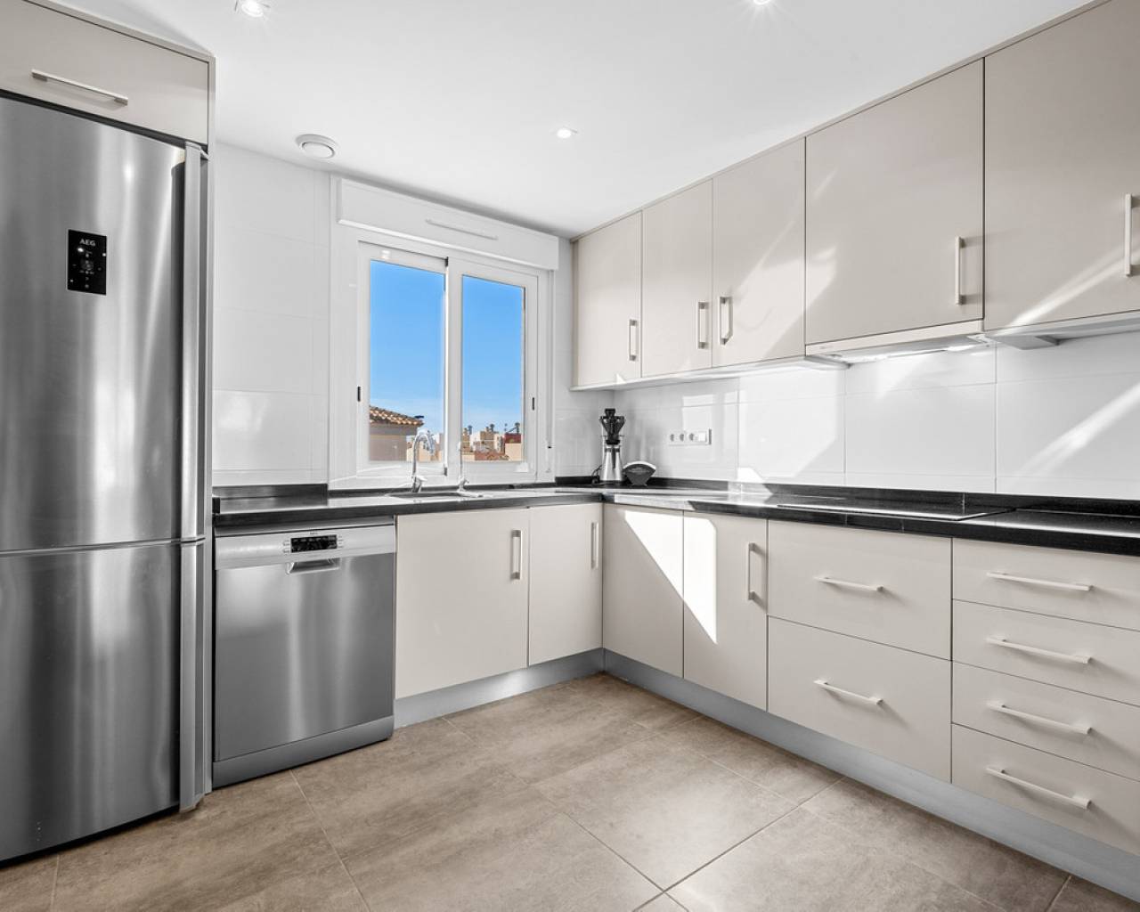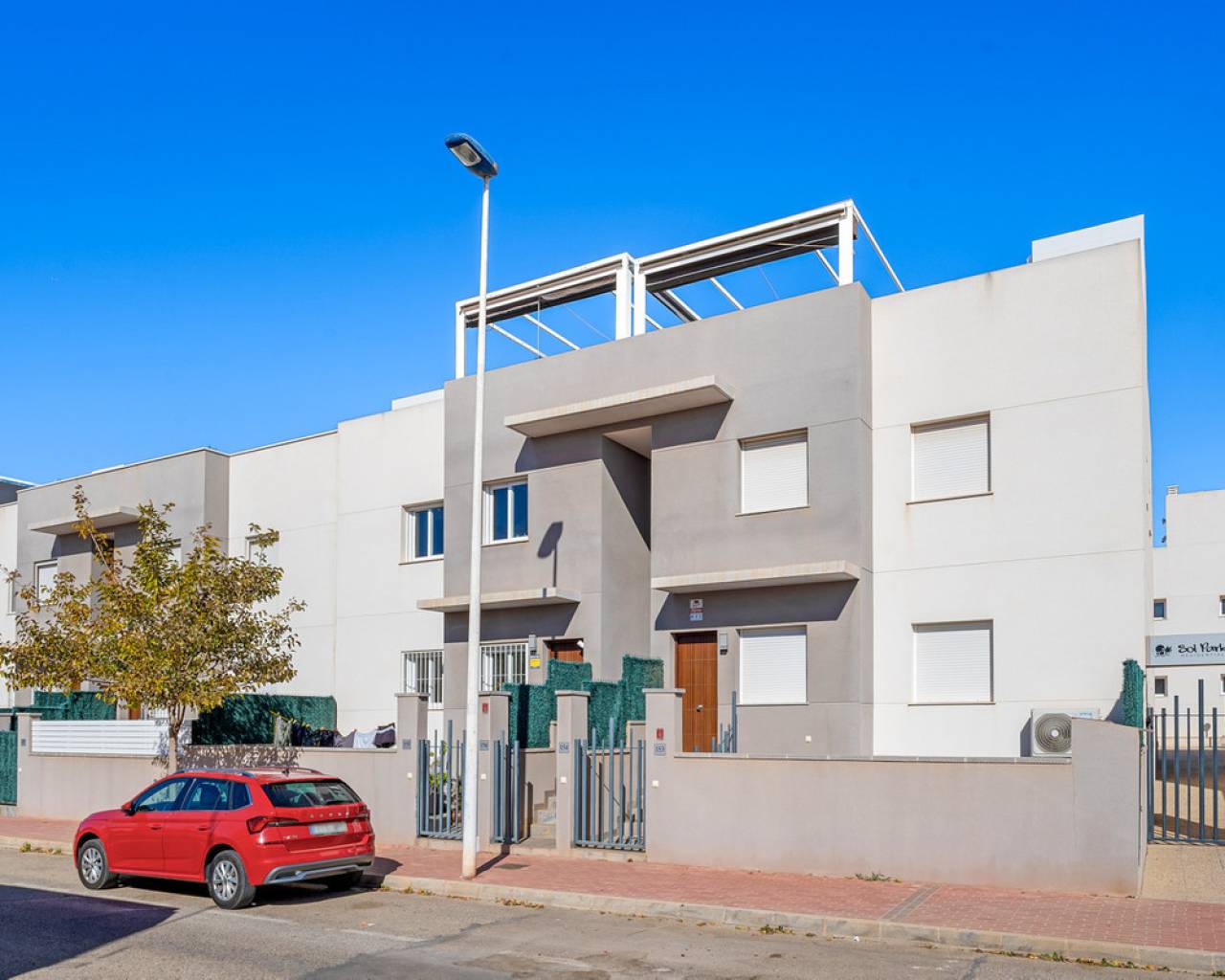 This elegant upper bungalow from 2019 offers a modern and comfortable base in one of Torrevieja's most sought-after areas, namely Aguas Nuevas. The home has 78 m² with two good bedrooms and two stylish bathrooms, one of which is ensuite. There are large built-in wardrobes in both bedrooms, so there is plenty of space for storage. Here is a layout that works perfectly for both year-round use and holiday living. The living room with modern and stylish kitchen as well as living and dining area is bright and well-appointed. From here there is access to a large terrace with views of the common area and one beautiful pool. When you want a little extra freedom and sun, you can simply go up one floor - here a large roof terrace awaits with plenty of opportunities to create your very own outdoor space, whether it is for relaxation, sunbathing or cozy evenings with family and friends. There is also a storage room where both the washing machine and the water heater are conveniently located. The home is being sold furnished with quality fixtures and fittings, so you can move in without any hassle. The central air conditioning system ensures a comfortable temperature regardless of the season. There is underfloor heating in both bathrooms. A large private parking space in the underground parking garage is included in the price – a clear advantage in the area. The complex is fenced and well-maintained and offers two communal pool areas, one of which has a heated jacuzzi. In addition, there are green areas and a playground, making the surroundings safe and pleasant for both adults and children. The location is a big plus. Here you live within walking distance of Mercadona, cafes and restaurants – all within easy reach when everyday life or vacation needs to work smoothly. La Mata beach is only a few minutes away by car or bike, and Alicante Airport can be reached in approximately 40 minutes, making travel days a breeze. It is quite simply a home that combines move-in quality, good outdoor areas and an attractive address near the beach and amenities. An obvious option for those who want a home with both comfort and a top location on the Costa Blanca. Please contact us for more information or if you would like a viewing.