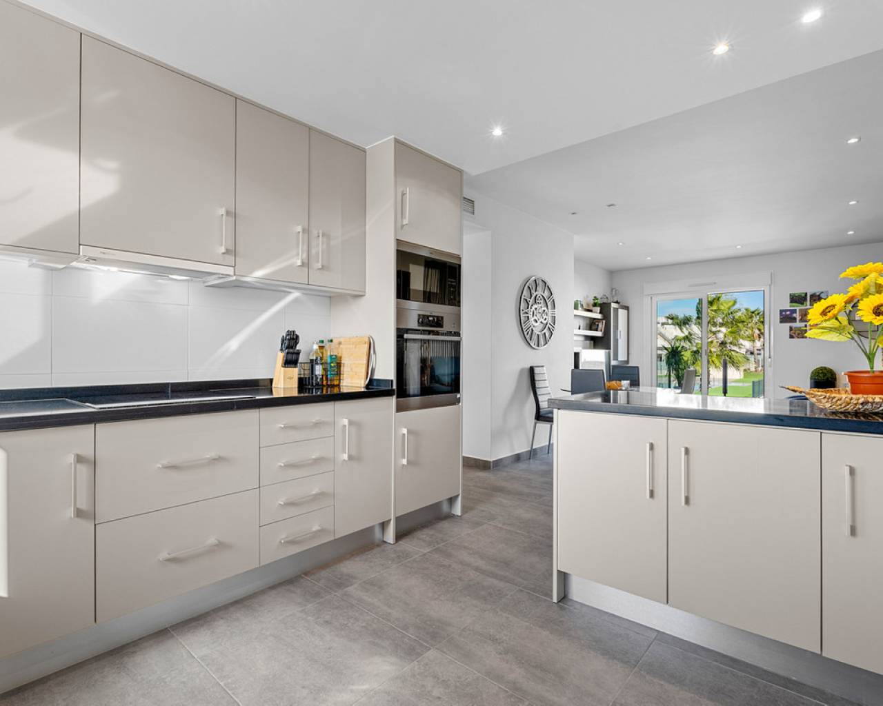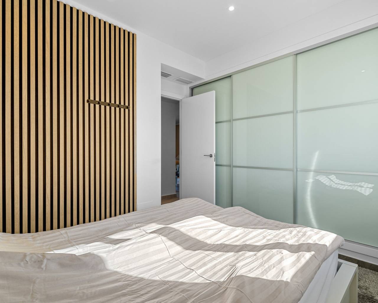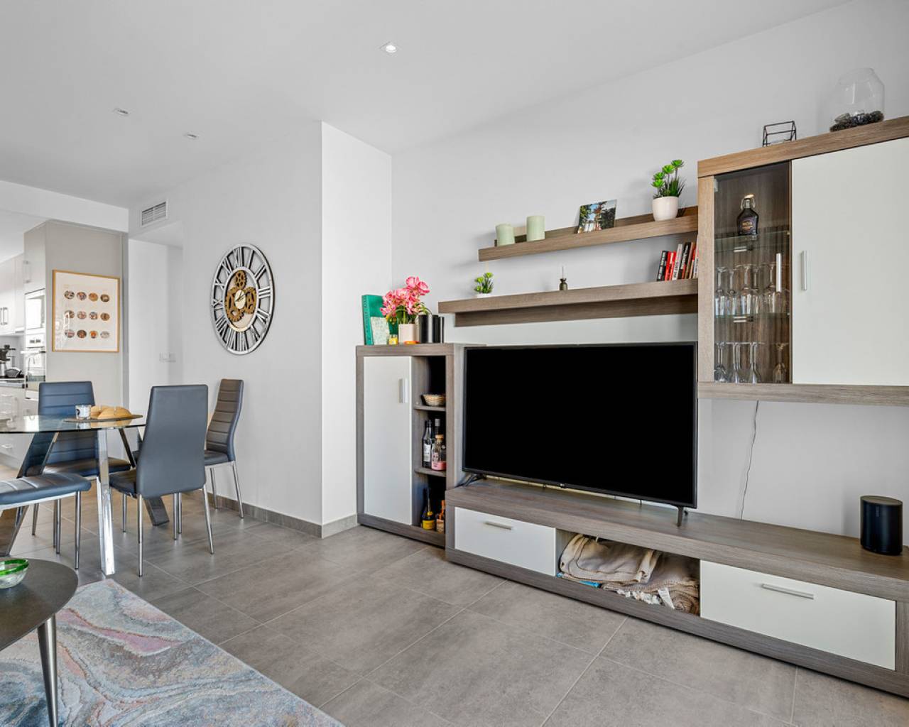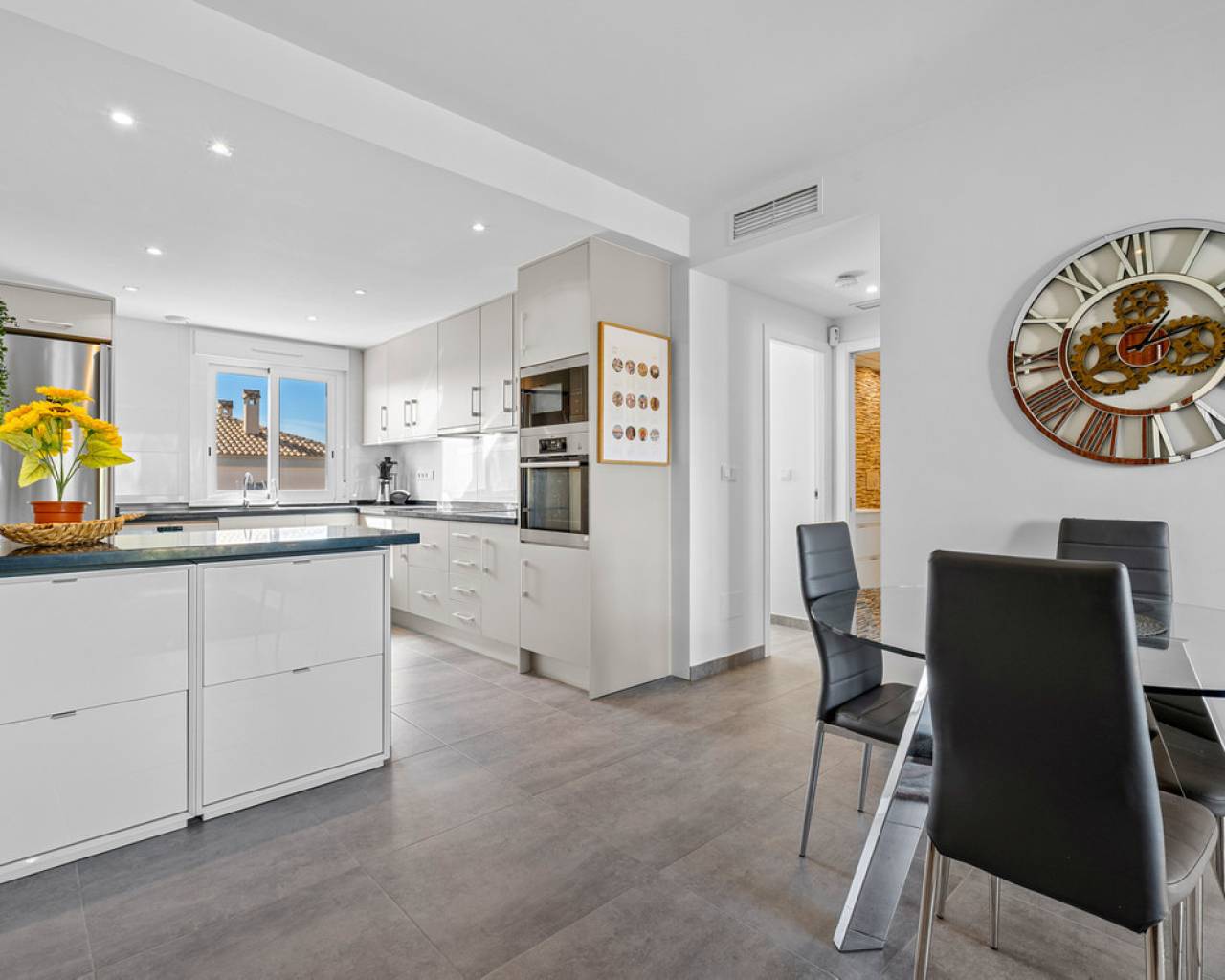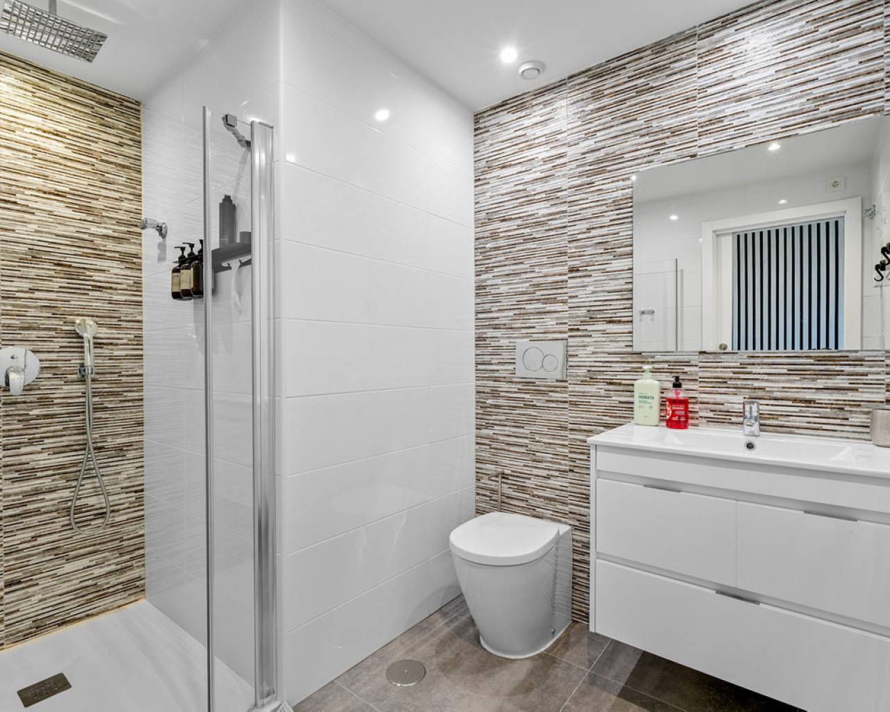 This elegant upper bungalow from 2019 offers a modern and comfortable base in one of Torrevieja's most sought-after areas, namely Aguas Nuevas. The home has 78 m² with two good bedrooms and two stylish bathrooms, one of which is ensuite. There are large built-in wardrobes in both bedrooms, so there is plenty of space for storage. Here is a layout that works perfectly for both year-round use and holiday living. The living room with modern and stylish kitchen as well as living and dining area is bright and well-appointed. From here there is access to a large terrace with views of the common area and one beautiful pool. When you want a little extra freedom and sun, you can simply go up one floor - here a large roof terrace awaits with plenty of opportunities to create your very own outdoor space, whether it is for relaxation, sunbathing or cozy evenings with family and friends. There is also a storage room where both the washing machine and the water heater are conveniently located. The home is being sold furnished with quality fixtures and fittings, so you can move in without any hassle. The central air conditioning system ensures a comfortable temperature regardless of the season. There is underfloor heating in both bathrooms. A large private parking space in the underground parking garage is included in the price – a clear advantage in the area. The complex is fenced and well-maintained and offers two communal pool areas, one of which has a heated jacuzzi. In addition, there are green areas and a playground, making the surroundings safe and pleasant for both adults and children. The location is a big plus. Here you live within walking distance of Mercadona, cafes and restaurants – all within easy reach when everyday life or vacation needs to work smoothly. La Mata beach is only a few minutes away by car or bike, and Alicante Airport can be reached in approximately 40 minutes, making travel days a breeze. It is quite simply a home that combines move-in quality, good outdoor areas and an attractive address near the beach and amenities. An obvious option for those who want a home with both comfort and a top location on the Costa Blanca. Please contact us for more information or if you would like a viewing.