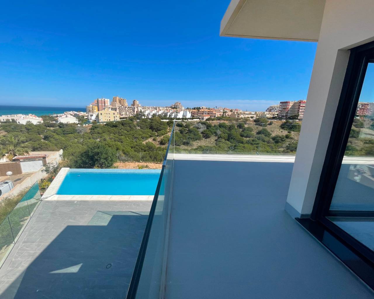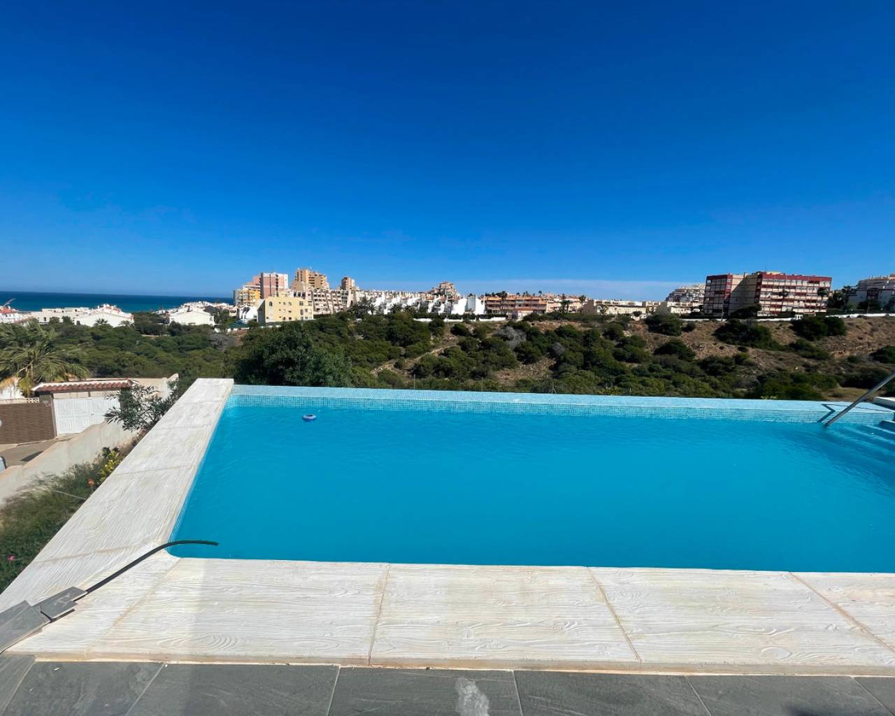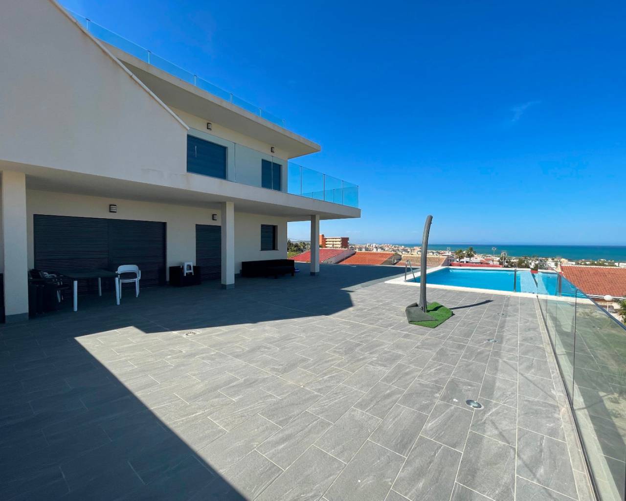 A semi-detached house with a private pool, all nearly new, recently built, stunning views, near La Mata beach in Torrevieja, independent access to the first-floor house. The house has two separate units. 2 fully equipped kitchens, sold furnished, has a spacious garage.
