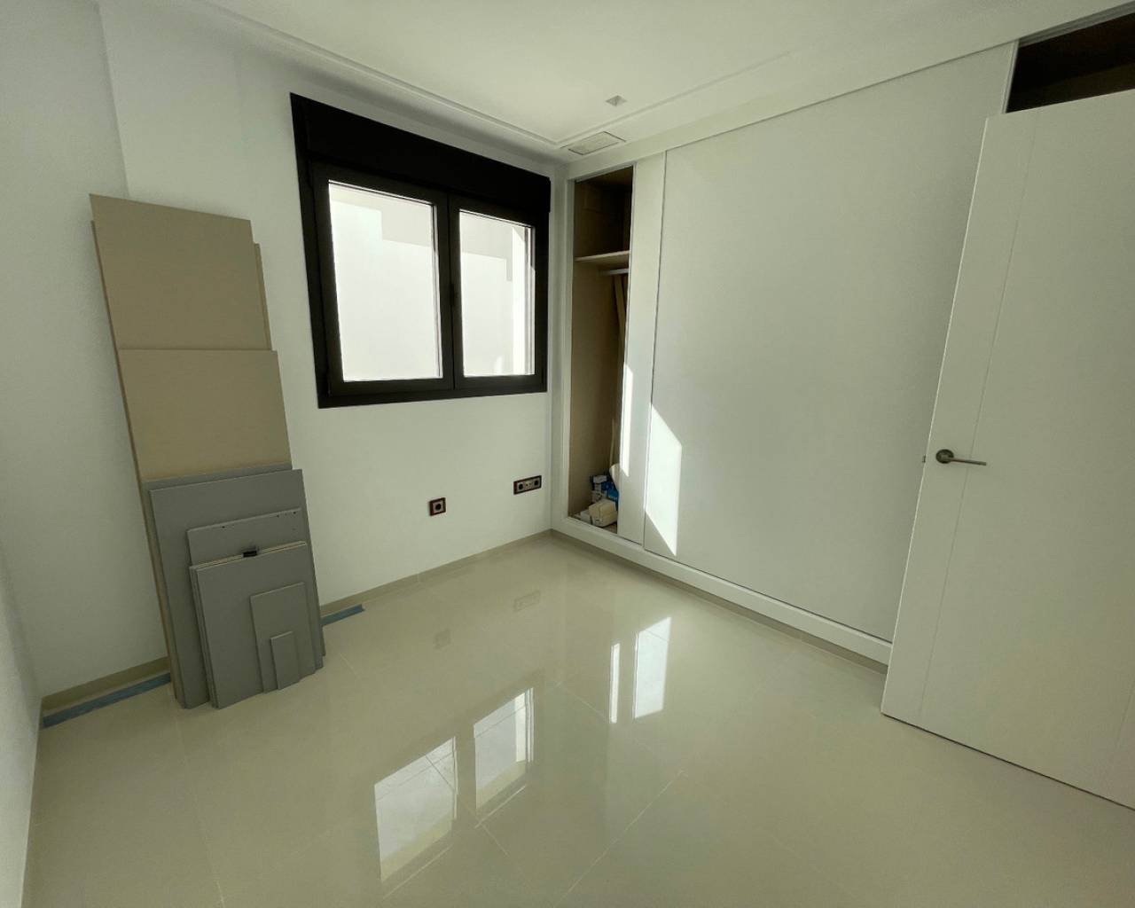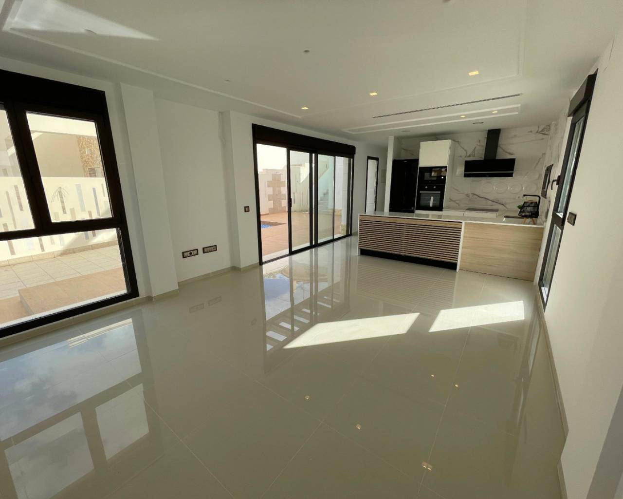 This beautiful detached 3-bedroom, 3-bathroom home is located in Benijófar, steps away from all essential services and the new Benisol shopping center. The spacious interior includes a large living room and an open-plan, fully-equipped kitchen with an oven, microwave, dishwasher, range hood, and refrigerator.The property offers per-installation for air conditioning and built-in wardrobes in every bedroom. On the ground floor, you'll find two of the three bedrooms, including one with an en-suite bathroom, as well as an additional shared bathroom. The third bedroom, also en-suite, is located on the first floor and is accessible by an external staircase, providing an independent entrance. This upstairs suite features a dual-sink bathroom and opens onto a vast 70 m² solarium with stunning mountain views.Outside, enjoy the private swimming pool, parking on the property, and a storage area cleverly designed under the stairs. This home is set in one of Benijófar's most popular areas, blending convenience, privacy, and style.