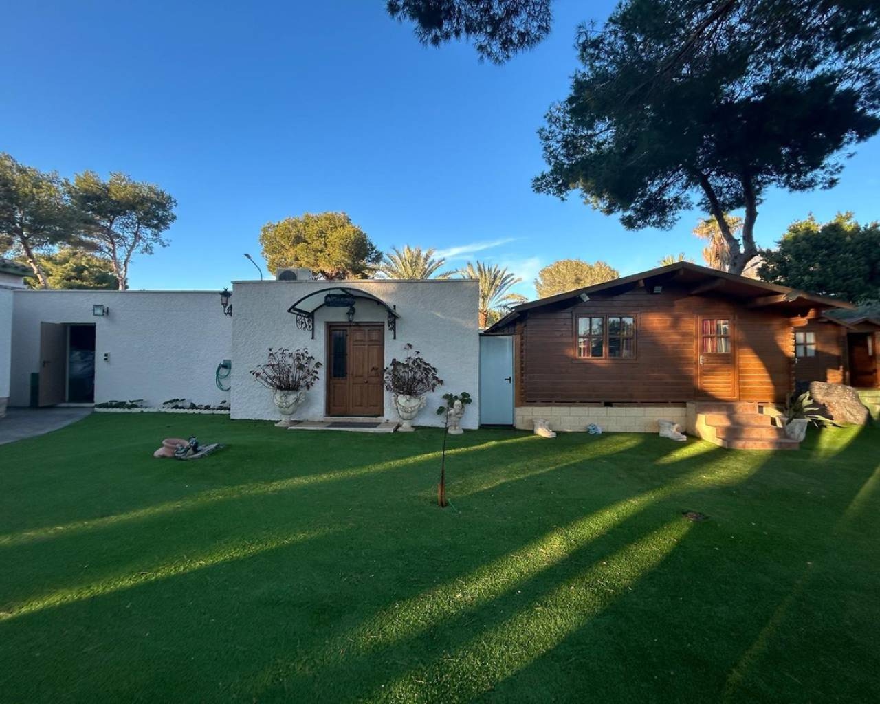 Beautiful and cozy villa located in one of the most beautiful areas of Orihuela Costa, in Dehesa de Campoamor. The house of about 200m2 built on the plot of almost 1500m2 is less than 900m from the beautiful beaches of Campoamor, within walking distance to the area where the tennis and paddle courts, the supermarket, the pharmacy, several bars and restaurants and other services are located. The villa built on the ground floor, we will find a total of 3 bedrooms and 2 bathrooms, the master bedroom with an en-suite bathroom and a large dressing room. Living room with fireplace, large independent kitchen, backyard with access to the laundry area and a nice front porch of about 20m2. In the well-kept and maintained garden we find a large private swimming pool (15x4) with a sliding transparent cover, a gym with a jacuzzi and a Finnish sauna, a wooden guest house with a small lounge, 2 bedrooms and a bathroom, and two other wooden houses, one with a bathroom that serves the garden and the swimming pool and a storage room. It also has a private garage for several vehicles and a barbecue area in the backyard of the house. It is sold furnished and equipped.