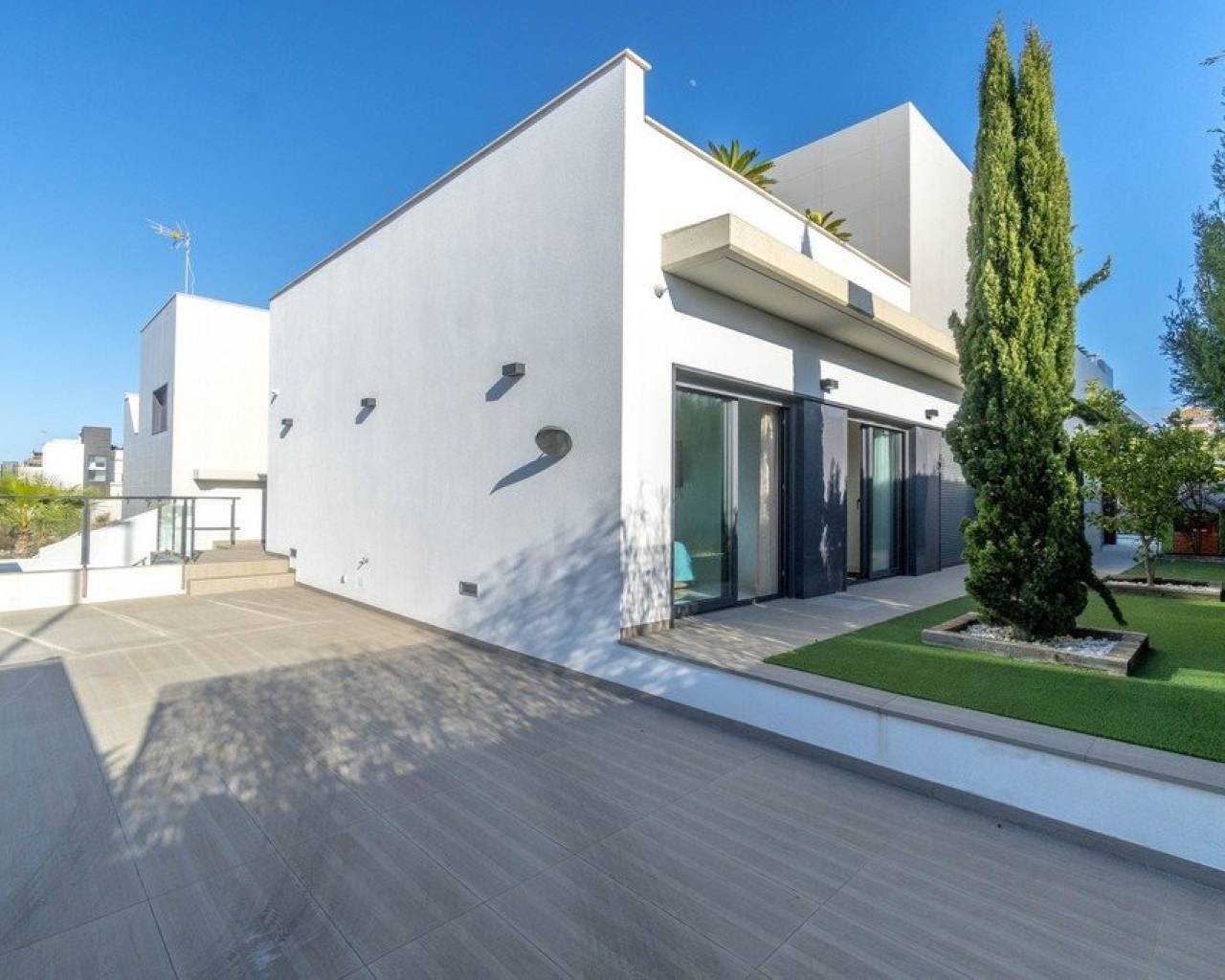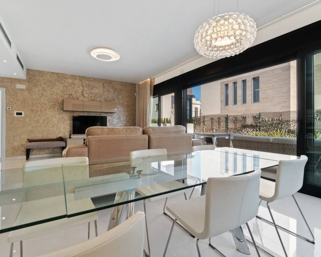 Modern style luxury villa located in Campoamor, only 300 m from the beach. Villa with an area of 200m2, built on a plot of 500m2, the house has 4 bedrooms, 3 bathrooms, living room, kitchen, terrace and solarium of 46m2 with sea views. The outside part has a private pool 8x4. Underfloor heating in the bathrooms, centralized air conditioning installed, parking on the plot. Top quality materials. Heated saltwater pool. It is close to all services, schools, just 10 minutes by car from the largest shopping center in Alicante, Zenia Boulevard, 40 minutes from Alicante airport and a few minutes from some of the best golf courses.