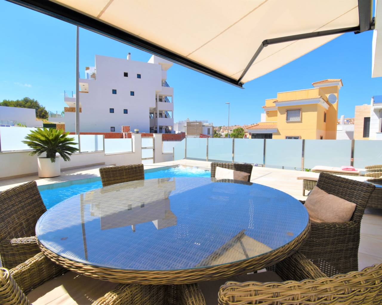 br /> This West Facing, 2018 Built, Three Bedroom, Detached Villa in Las Filipinas, a popular residential area within Villamartin. A variety of bars/restaurants can be found just ten minutes on foot; the nearest main chain supermarket, five minutes by car along with three golf courses, Villamartin Plaza, La Fuente commercial centre. La Zenia Boulevard shopping centre is ten minutes by car and the beaches along the coast fifteen minutes. Having been built by a reputable constructor, the qualities within this property are second to non. The main living area being open plan with two sets of wide sliding doors, one from the lounge and the other the dining area which lead out to the pool area, there are also stairs leading up to the first floor and to the underbuild. The kitchen is fully fitted and there is a shower room plus a double bedroom with en suite shower room along with a terrace. On the first floor there is a further double bedroom with dressing room, en suite and access up to the solarium. The underbuild comprises of a lounge and kitchen area plus a double bedroom with en suite, double sliding doors to the outside and a kitchen area. The garden is tiled with an artificial grassed area, a 7x4 private pool and off road parking Extras include air conditioning, electric gates and built in wardrobes in bedrooms.