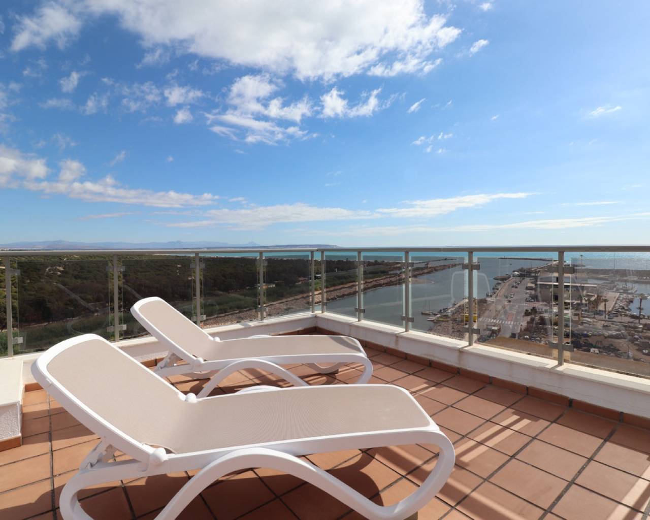 This Stunning, Corner, East Facing, Three Bedroom Penthouse, Duplex Apartment in Guardamar del Segura is located at the port, on the 10th Floor, within a Secure Gated Community boasting luxury amenities. With a spacious 10m2 uncovered terrace and an expansive 74m2 private rooftop solarium, this residence offers unparalleled panoramic views across the river, the sea, pine forest, and mountains beyond. Inside, the property features fitted wardrobes in each of the three bedrooms, ensuring ample storage space, while air conditioning throughout ensures year-round comfort. Residents can enjoy leisure time in the communal swimming pool, tennis court, playground, and mini-golf area, all within the gated community. Parking is convenient with two private underground enclosed garages measuring 42m2 and 37m2 respectively, along with a private underground car parking space. The separate kitchen with an adjoining utility room adds practicality to the living space, while security is enhanced with a sturdy security door. Outdoor living is enhanced with a sun awning on the terrace, providing shade on sunny days. The property's prime location places it less than 500 meters from the beach and seafront, offering easy access to the coast's stunning amenities. Situated in Costa Blanca South, this residence is within easy reach of local amenities and facilities, making it an ideal choice for those seeking luxury living in a vibrant coastal community. Absolutely Remarkable Views! One not to be missed!!!