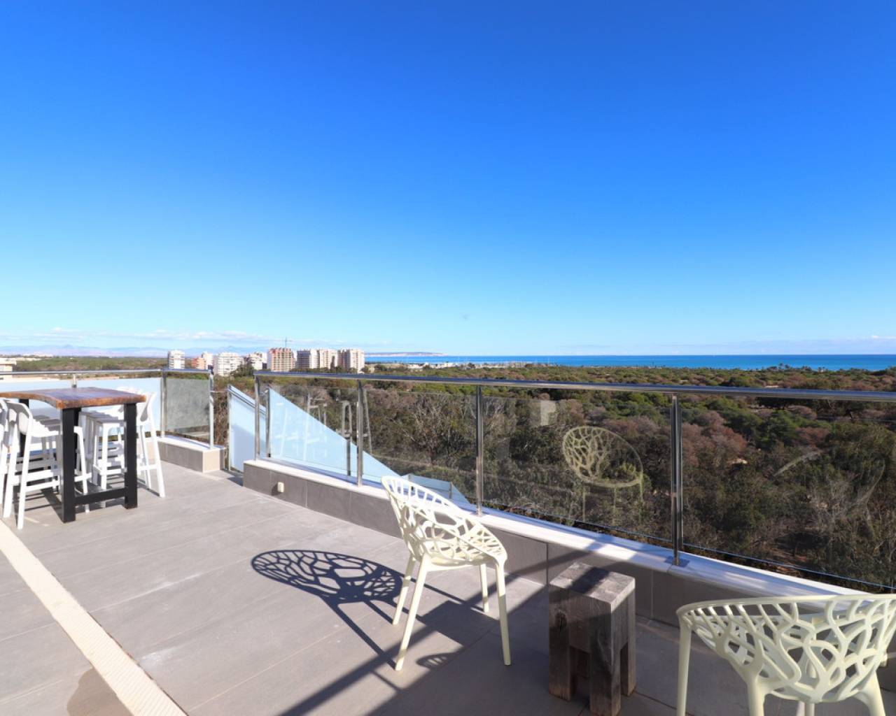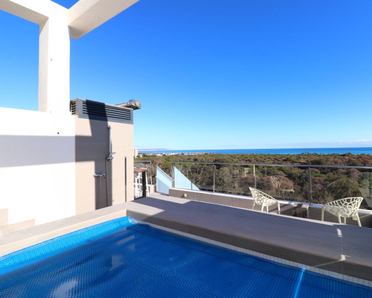 This East Facing, Penthouse, Three Bedroom, Luxurious Apartment in Guardamar del Segura, is located in a highly sought-after area, just a 10-minute walk to a main chain supermarket, 15 minutes to the marina and beach, and a 5-minute drive to the town centre. Beautifully and tastefully presented, this 109m2 apartment boasts modern living, being built in 2018, enjoying spectacular unspoilt views across the pine forest and dunes to the sea from the living area. Natural light streams through the wall-to-wall sliding glazed doors, which disappear seamlessly into the wall, creating a wonderful flow to the amazing terrace and chill-out area, ideal for taking in the stunning surroundings. The open-plan modern fitted kitchen is complemented by a utility room. There are three double bedrooms with fitted wardrobes, the master featuring an en suite, and a family shower room. A private solarium, accessed via the terrace, offers the ultimate in outdoor luxury with a private 2.5 x 1.8 heated pool, built-in BBQ, and kitchen area. From here, you can also enjoy serene views over the river. Additional features include a 25m2 basement parking space, ducted air conditioning, under floor heating throughout, CCTV in the block, video intercom, and a lift providing direct access to the apartment. The communal pool adds the finishing touch to this exceptional property.