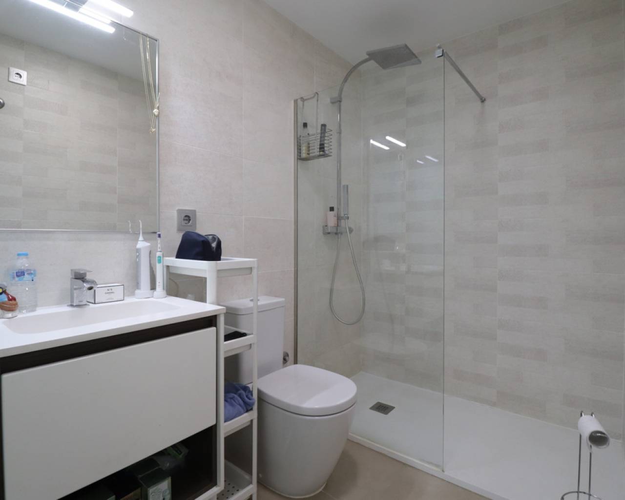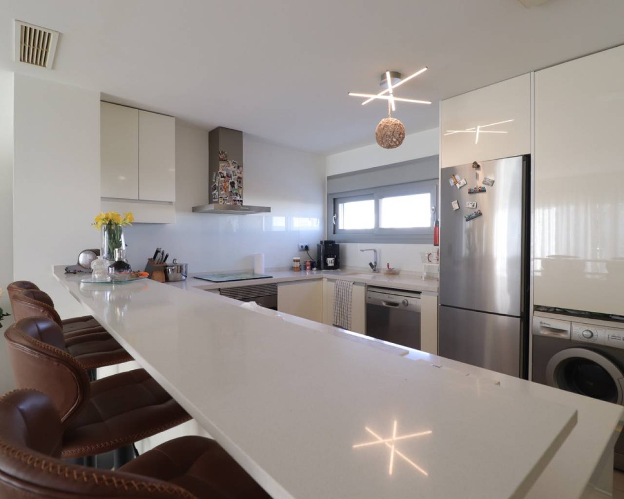 This West Facing, Two Bedroom, Top Floor Modern Apartment in Vista Bella Golf, is located on the borders of the popular golf course, just a five-minute walk to bars, restaurants, and a supermarket. Conveniently situated, it is a five-minute drive to Los Montesinos, ten minutes to Quesada and Benijófar, and approximately twenty minutes to the coast. Built in 2019, this stylish apartment offers a spacious living area with large glazed sliding doors leading out to a generously sized terrace that overlooks the beautifully maintained communal gardens. The open-plan modern fitted kitchen features a substantial breakfast bar, perfect for casual dining and entertaining. The property includes two double bedrooms with fitted wardrobes; the master bedroom benefits from an en suite shower room, while there is also a well-appointed family shower room. External stairs provide access to the fantastic private solarium, which includes storage and a section with sun blinds, allowing for comfortable outdoor dining while taking in the serene views and stunning sunsets. Additional features include ducted air conditioning, four solar panels, and an allocated community parking space. This modern apartment offers the ideal blend of luxury, convenience, and tranquility in the heart of the Costa Blanca South.