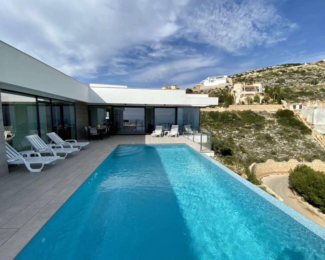 Nestled in the prestigious Cumbre del Sol, perched high above the sparkling Mediterranean Sea, this high luxury villa offers an unparalleled lifestyle of opulence and tranquility.Boasting the most breathtaking sea views imaginable, this exquisite property epitomizes the epitome of luxury living. The villa is conveniently located close to the renowned international school LES, making it an ideal choice for families seeking a sophisticated and convenient lifestyle.With a total of 4 bedrooms, 3 of which are located on the upper floor, and a separate independent apartment complete with a luxurious walk-in wardrobe and en suite bathroom, this residence offers the utmost in comfort and privacy for all occupants.Upon arrival, a stylish pergola provides covered parking, adding to the convenience and elegance of the property. The villa also offers the possibility to extend, allowing for further customization and personalization to suit the needs of its discerning residents.The interior of the villa is designed with a modern and open plan kitchen, perfect for entertaining guests and enjoying the stunning views while preparing meals. Central heating and air conditioning ensure the utmost comfort throughout the year, while ample storage space provides practicality and convenience for everyday living. With its exceptional location, luxurious amenities, and stunning sea views, this high luxury villa in Cumbre del Sol is a true sanctuary of elegance and sophistication, offering a lifestyle of unparalleled luxury and comfort.
