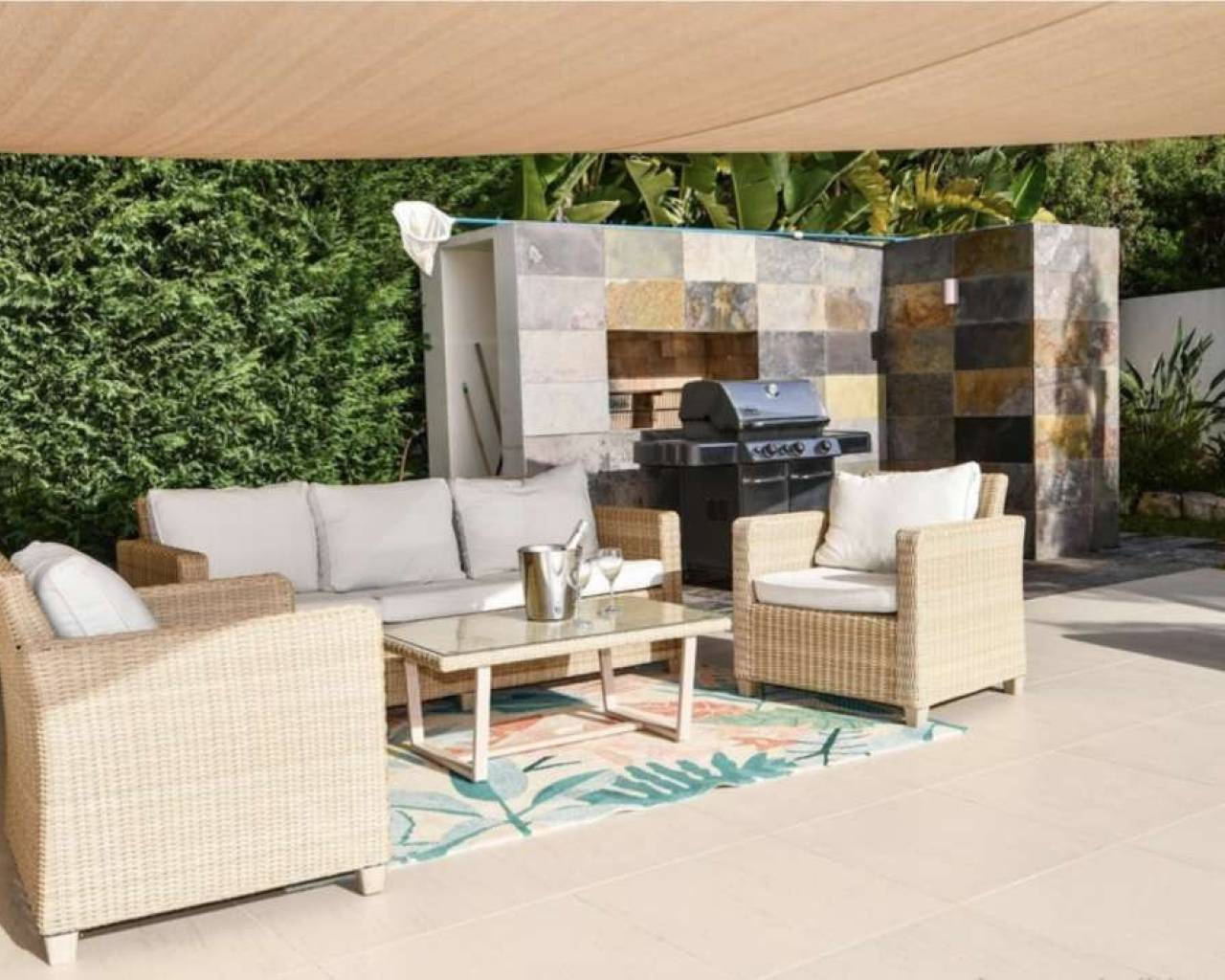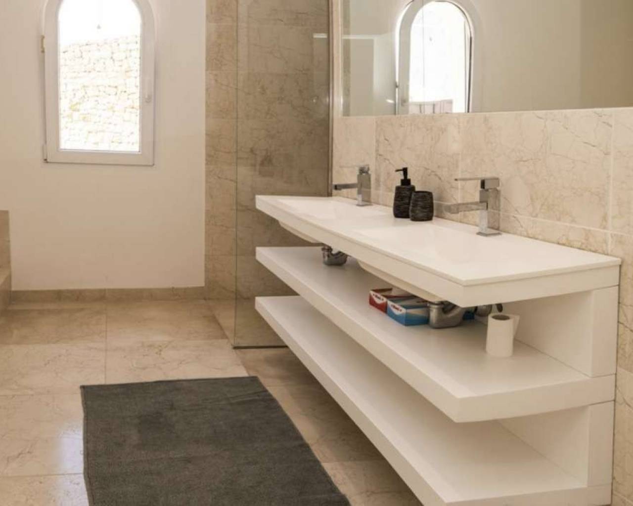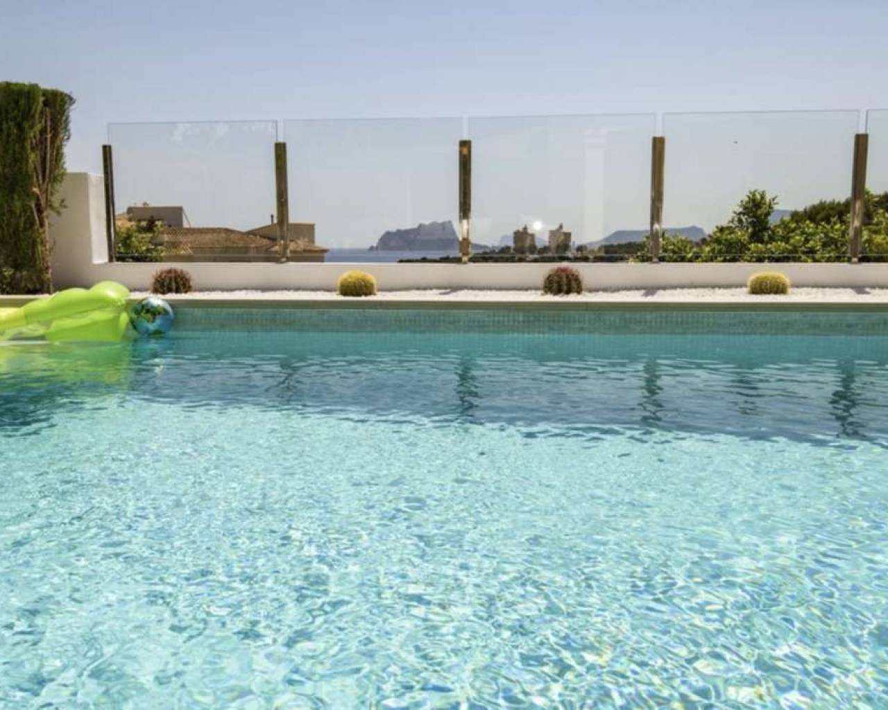 Dream Villa Above El Portet Bay, Moraira – Stunning Views & Top EquipmentSituated in one of Moraira's most sought-after locations, this spacious Spanish-style villa lies just 900 meters above the picturesque El Portet Bay. From here, you can enjoy breathtaking sea views, peaceful surroundings, and easy access to the beach, local restaurants, shops, and the charming town center of Moraira (approx. 2 km away).Key Facts:Living space: approx. 373 m²Plot size: approx. 836 m²Bedrooms: 4 – each with en-suite bathroom and air conditioningBathrooms: 4Private Pool: 9 x 4 m with sea views and outdoor showerAccommodates: up to 8 people Outdoor Areas:Covered dining terrace with large wooden table for 8 peopleSpacious sun terrace with loungers, Bose outdoor sound system, and shaded lounge areaInfinity sea and mountain views from multiple levelsPrivate pool with Roman steps and underwater lightingBasketball hoop, table tennis, pull-up bar – perfect for families and active guestsLandscaped garden with trees and hedges, bordering a green zoneCarport for 2 cars, plus additional parking on the gated property with electric entrance gateFeatures & Highlights:Bright, open living and dining area with sea view and direct access to terraceUnderfloor heating, double-glazed windows, electric shuttersPhotovoltaic solar system for cost-efficient energy during the dayAir conditioning in the living/dining area and all bedroomsModern American kitchen fully equipped with Bosch appliances (ceramic cooktop, oven, dishwasher, microwave, coffee machine, toaster, etc.)Elegant cream marble floors throughout the entire house4 stylish bedrooms, each with en-suite bathroom, TV, mosquito screens, and A/CMaster bedroom with large private balcony and panoramic views of the sea and Sierra Bernia mountainsWine cellar (Bodega) in the basement – perfect for wine loversPrivate cinema room with 85-inch TV – ideal for movie nights or gaming sessionsThis villa combines luxury, comfort, and one of the best locations on the Costa Blanca. Whether for personal use, as a holiday retreat, or as a high-end rental property – this home ticks all the boxes.