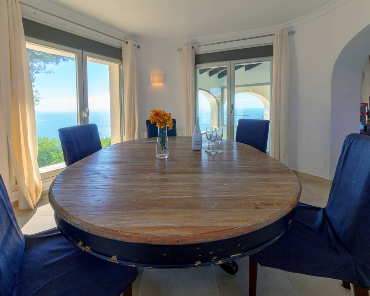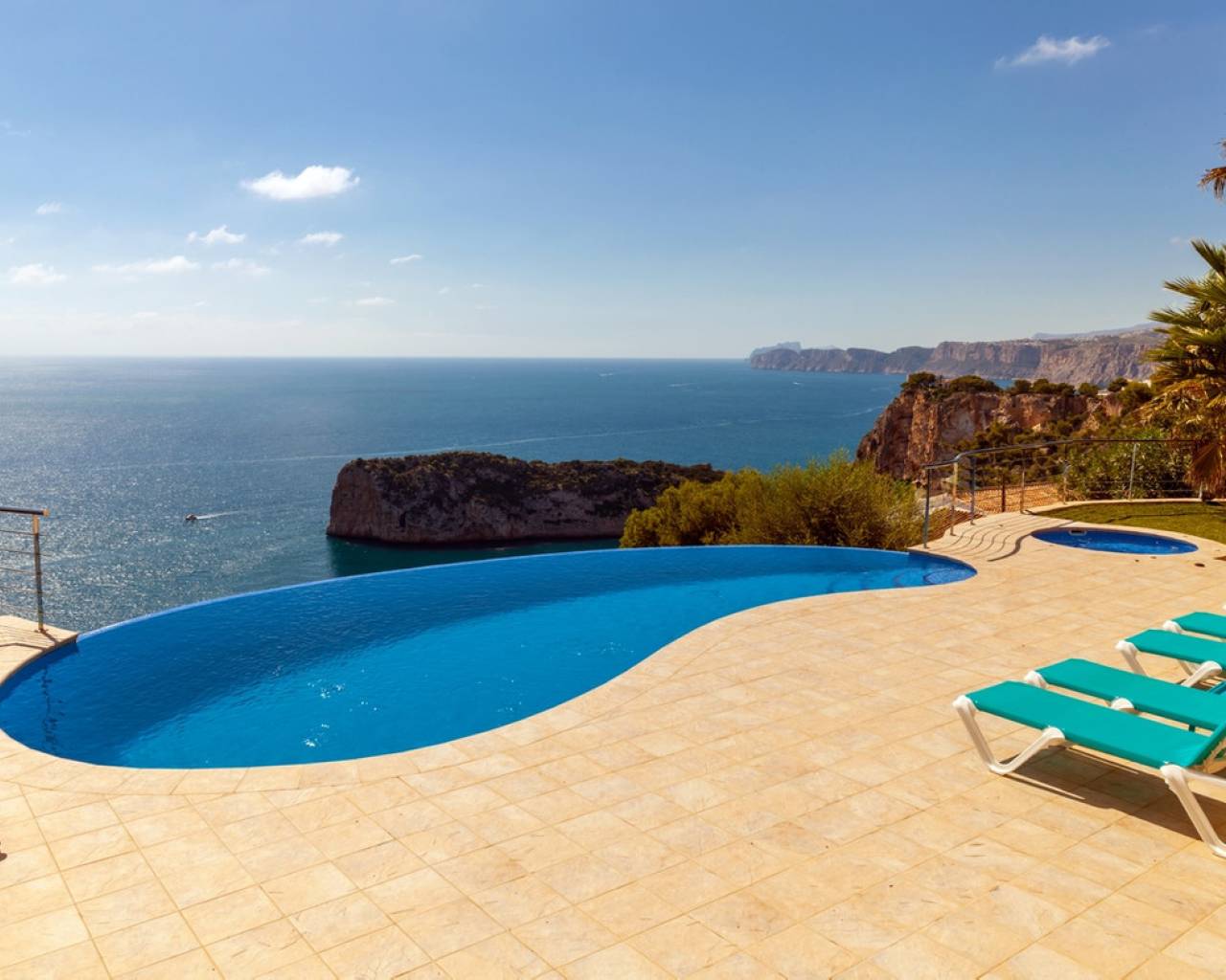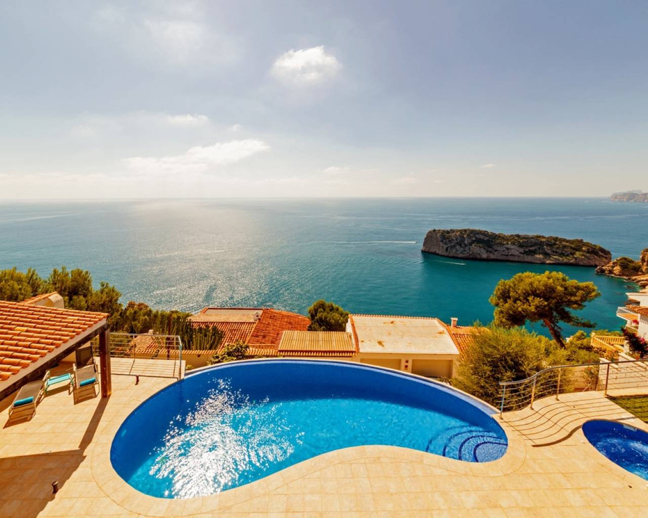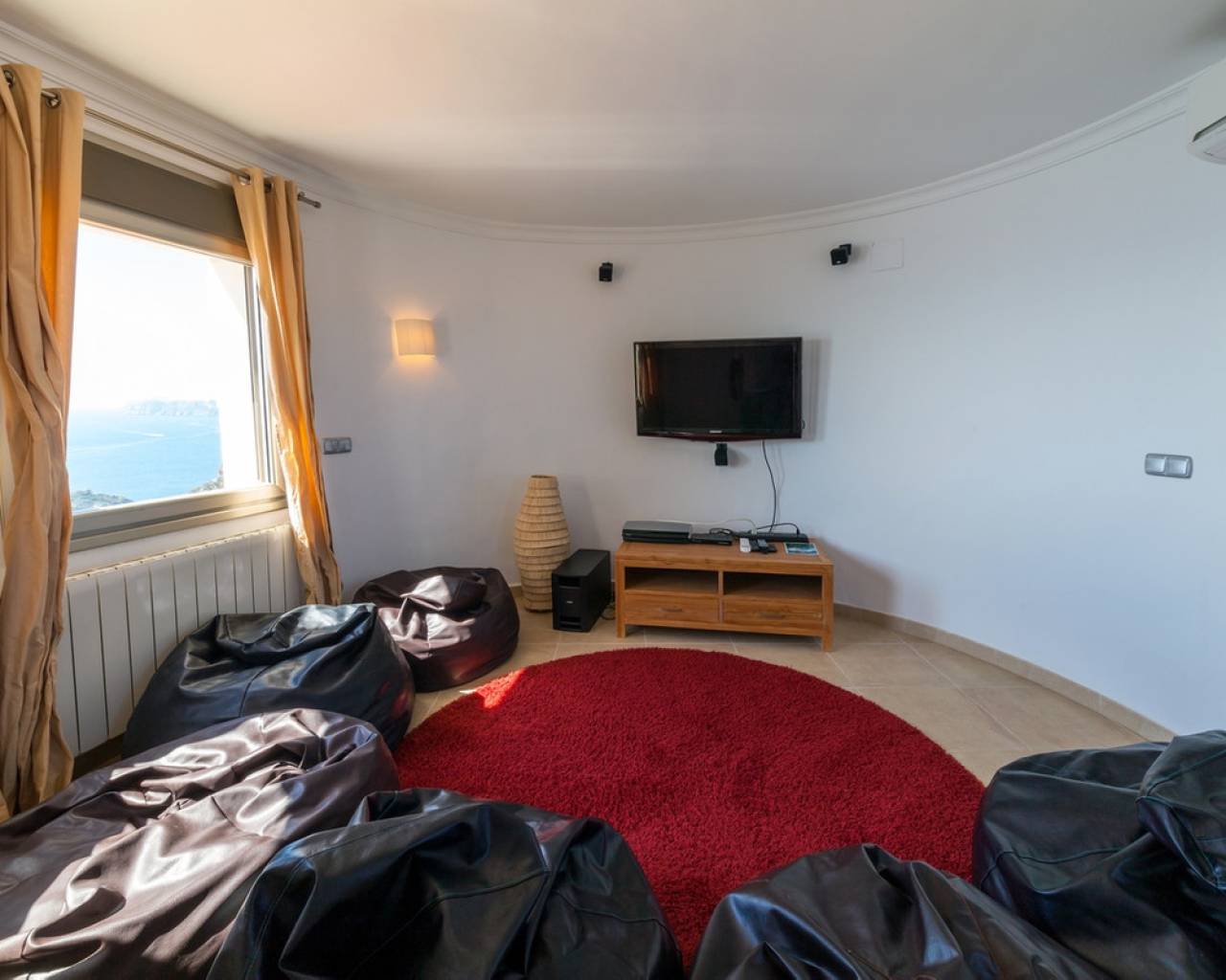 This impressive 6 bed 4 bath villa is located in a quiet area close to Cabo De la Nao, Javea. The sea views are incredible throughout the villa and while it is not situated on the first line, you would think you are from the majority of the villa.The property is entered either by a pedestrian gate or an electric sliding vehicle gate to a single car parking area. once through the front door and a short hallway you enter the living room where your gaze is drawn to the sea views in front of you. The large lounge gives access to the kitchen, dining room and the covered dining terrace. there is also access via a short hallway to three bedrooms, a double and a twin which share a bathroom and a master bedroom with ensuite bathroom where you can lie in bed and admire the sea views. From the living room, there is a staircase up to a circular tv room and then up to a roof terrace offering unbeatable views. Another staircase leads to the lower level which comprises an open plan living/dining/kitchen area from which you can access another covered dining/sitting area, and also another three bedrooms, two of which share a bathroom while the other, which also offers fantastic sea views, has an ensuite bathroom.From the lower covered terrace there is access to the parking area, and also down a few stairs to the pool terrace where again the sea views are incredible. To one side of the infinity pool area is a covered sitting/dining area complete with built in BBQ, while to the other is a built in Jacuzzi and all around is plenty of space for sunbeds.This is a property which demands to be viewed to appreciate how good the sea views are, and all the benefits offered by the villa.