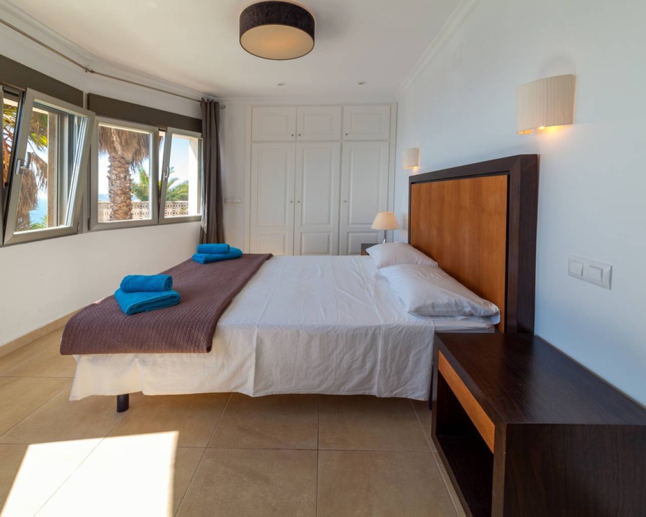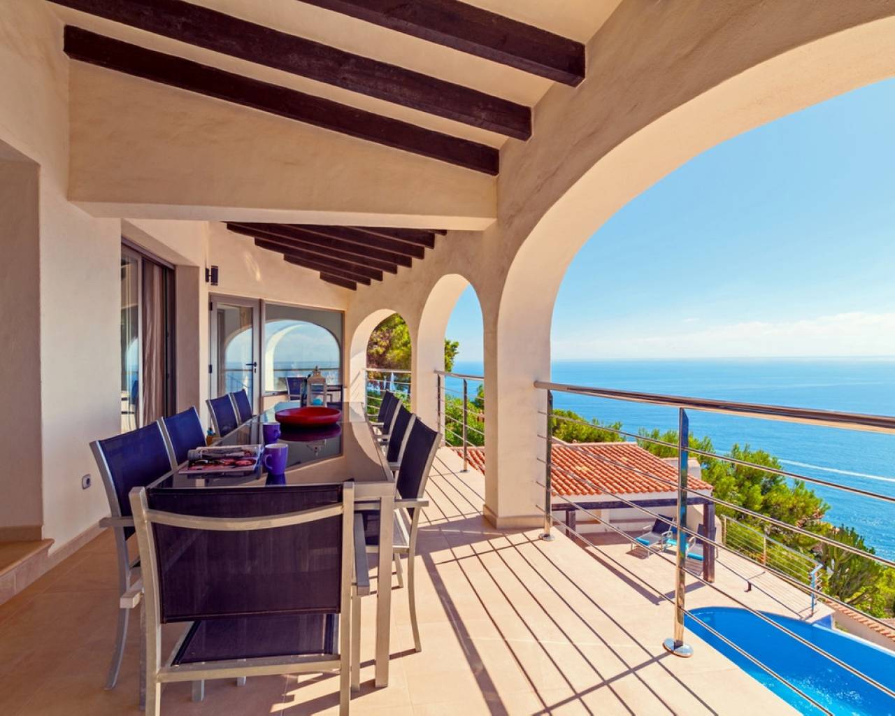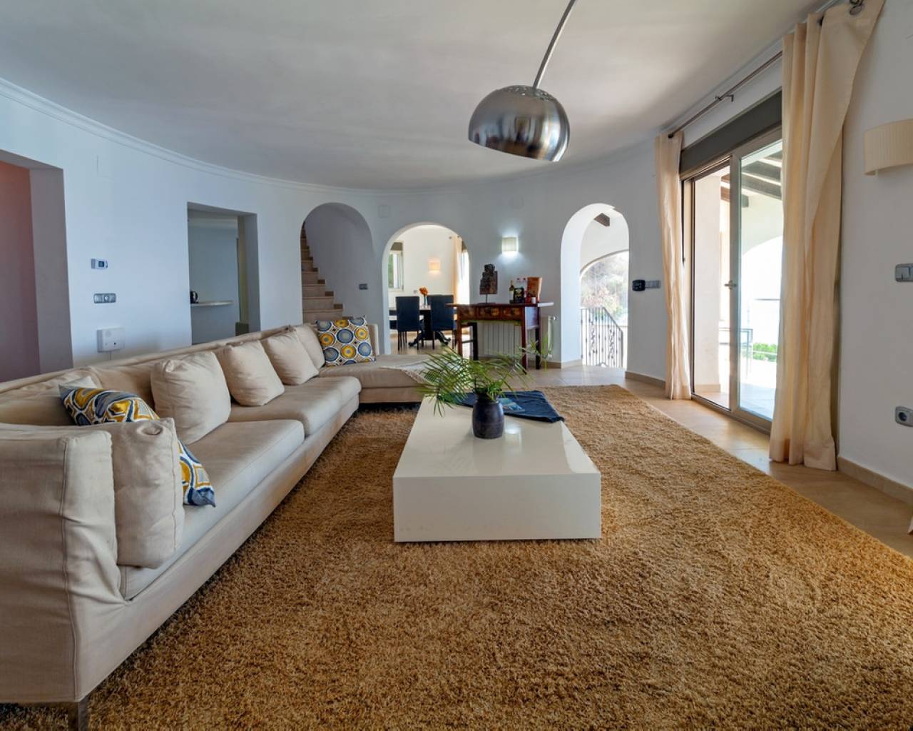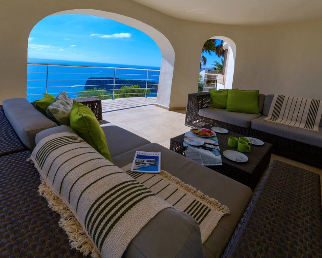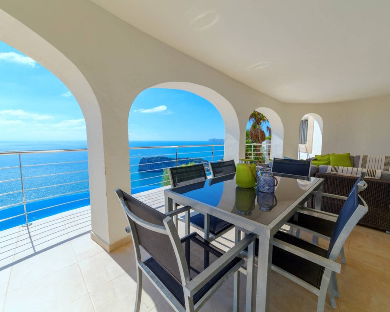 This impressive 6 bed 4 bath villa is located in a quiet area close to Cabo De la Nao, Javea. The sea views are incredible throughout the villa and while it is not situated on the first line, you would think you are from the majority of the villa.The property is entered either by a pedestrian gate or an electric sliding vehicle gate to a single car parking area. once through the front door and a short hallway you enter the living room where your gaze is drawn to the sea views in front of you. The large lounge gives access to the kitchen, dining room and the covered dining terrace. there is also access via a short hallway to three bedrooms, a double and a twin which share a bathroom and a master bedroom with ensuite bathroom where you can lie in bed and admire the sea views. From the living room, there is a staircase up to a circular tv room and then up to a roof terrace offering unbeatable views. Another staircase leads to the lower level which comprises an open plan living/dining/kitchen area from which you can access another covered dining/sitting area, and also another three bedrooms, two of which share a bathroom while the other, which also offers fantastic sea views, has an ensuite bathroom.From the lower covered terrace there is access to the parking area, and also down a few stairs to the pool terrace where again the sea views are incredible. To one side of the infinity pool area is a covered sitting/dining area complete with built in BBQ, while to the other is a built in Jacuzzi and all around is plenty of space for sunbeds.This is a property which demands to be viewed to appreciate how good the sea views are, and all the benefits offered by the villa.