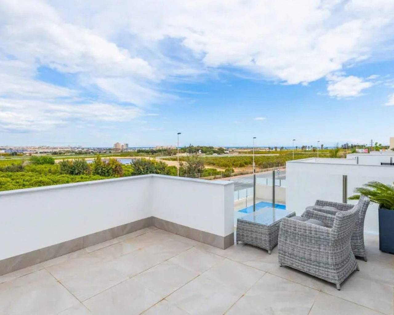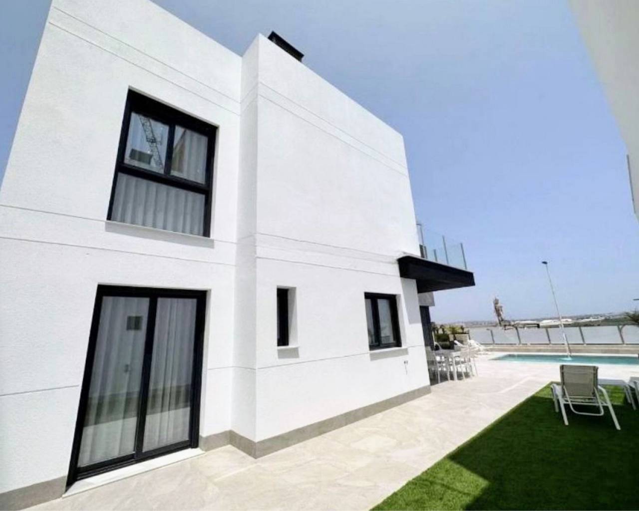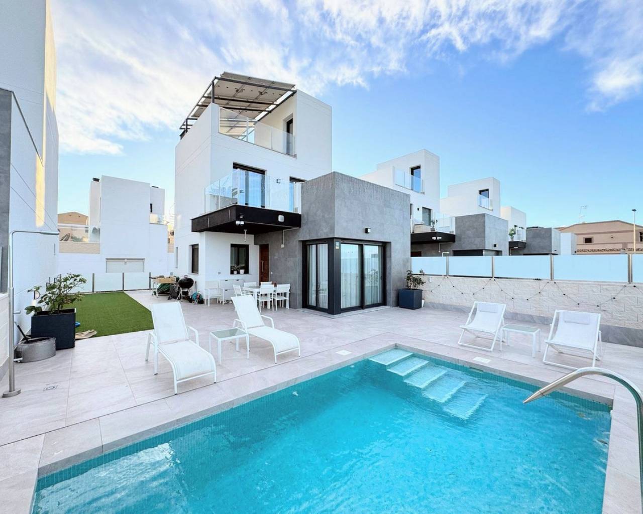 Take a look at this Fabulous New Build Resale Detached Villa located in Los Balcones. The property offers 3 spacious bedrooms with wardrobes, 3 bathrooms, living/dining area and a fully fitted kitchen. On the ground floor you will find a bedroom with ensuite bathroom and walk-in closet and on the upper floor a further 2 bedrooms and bathroom. The property benefits from terraced areas, roof solarium with views of the salt lakes, underfloor heating, solar panels and a 70 m² basement with a garage and plenty of storage for bicycles or sports equipment. The property also benefits from a private swimming pool, outside shower, air conditioning and much much more. The villa is located in a peaceful and well-connected area and you'll find supermarkets, pharmacies, restaurants, and cafés within walking distance. The beach is only a short bike ride away, and for shopping and entertainment, the popular La Zenia Boulevard is just a short drive away. Los Balcones is a quiet area with good transport connections. It is a quiet residential area with many parks and green areas and it is close to wonderful beaches from Torrevieja such as Playa de los Náufragos and it is 7 km away from Aquopolis Torrevieja water park. It is also close to hospitals like the Hospital Universitario de Torrevieja (3 km away) and airports such as Alicante Airport (35 km away) and Region of Murcia International Airport (43 km away). Los Balcones has its own facilities close by at the Filton shopping centre with amenities such as a supermarket, hairdressers, bars and restaurants, and an Ironmongers etc There is also a large supermarket and 2 pharmacies one at each end of the main zone. There is a local primary school a short distance away, and the bus route for all secondary schools and to the city of Torrevieja.