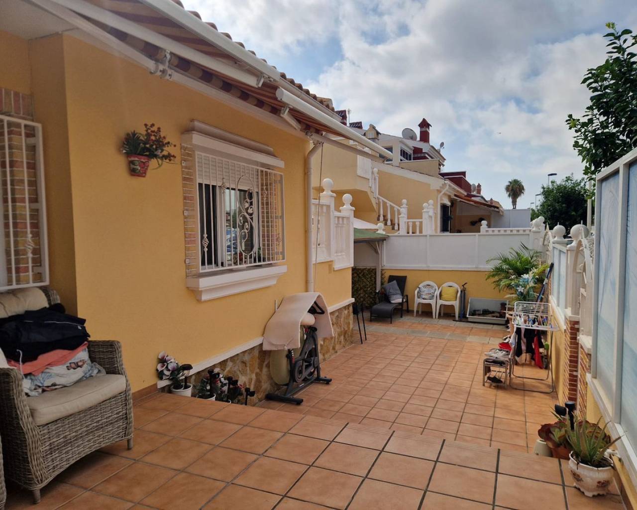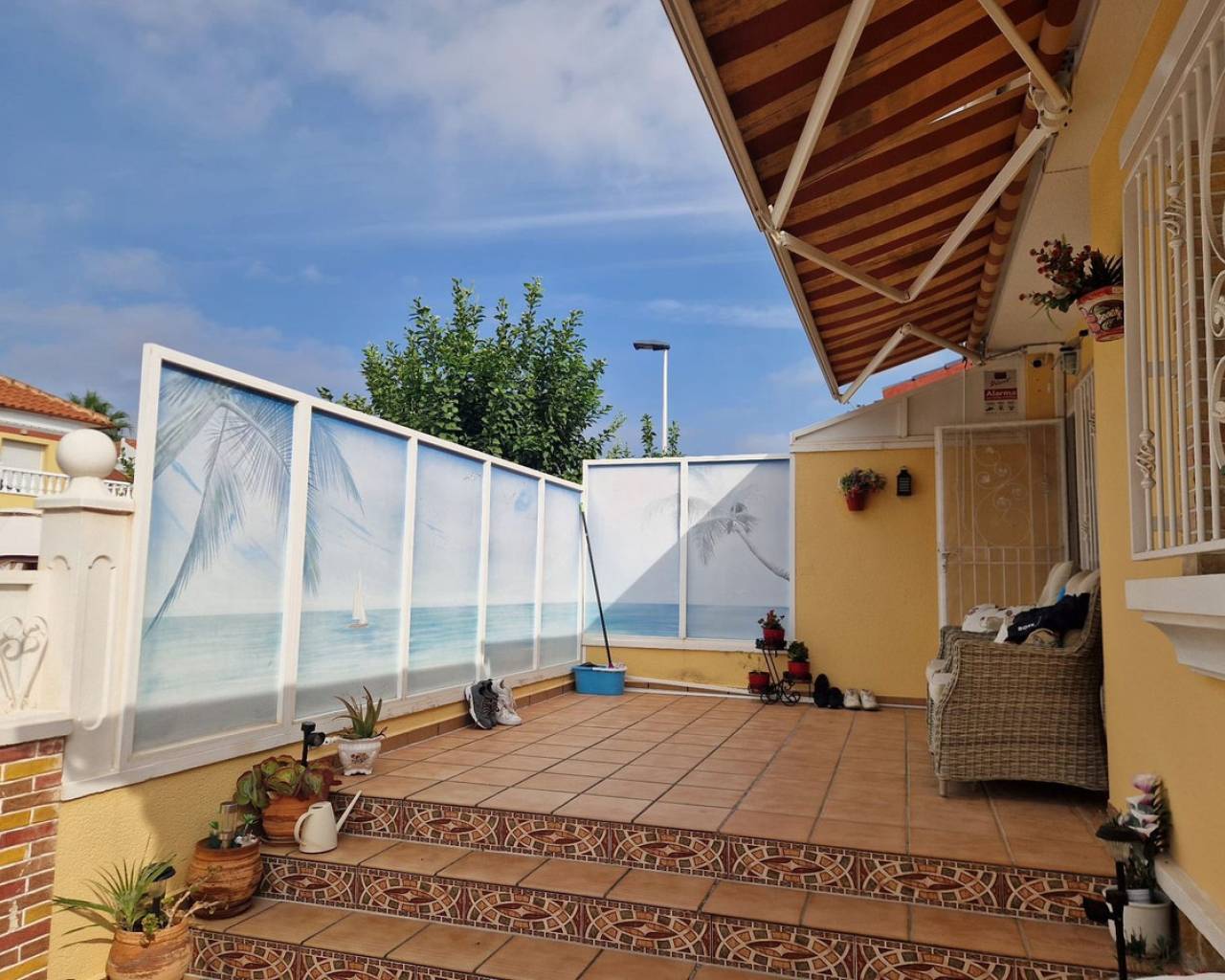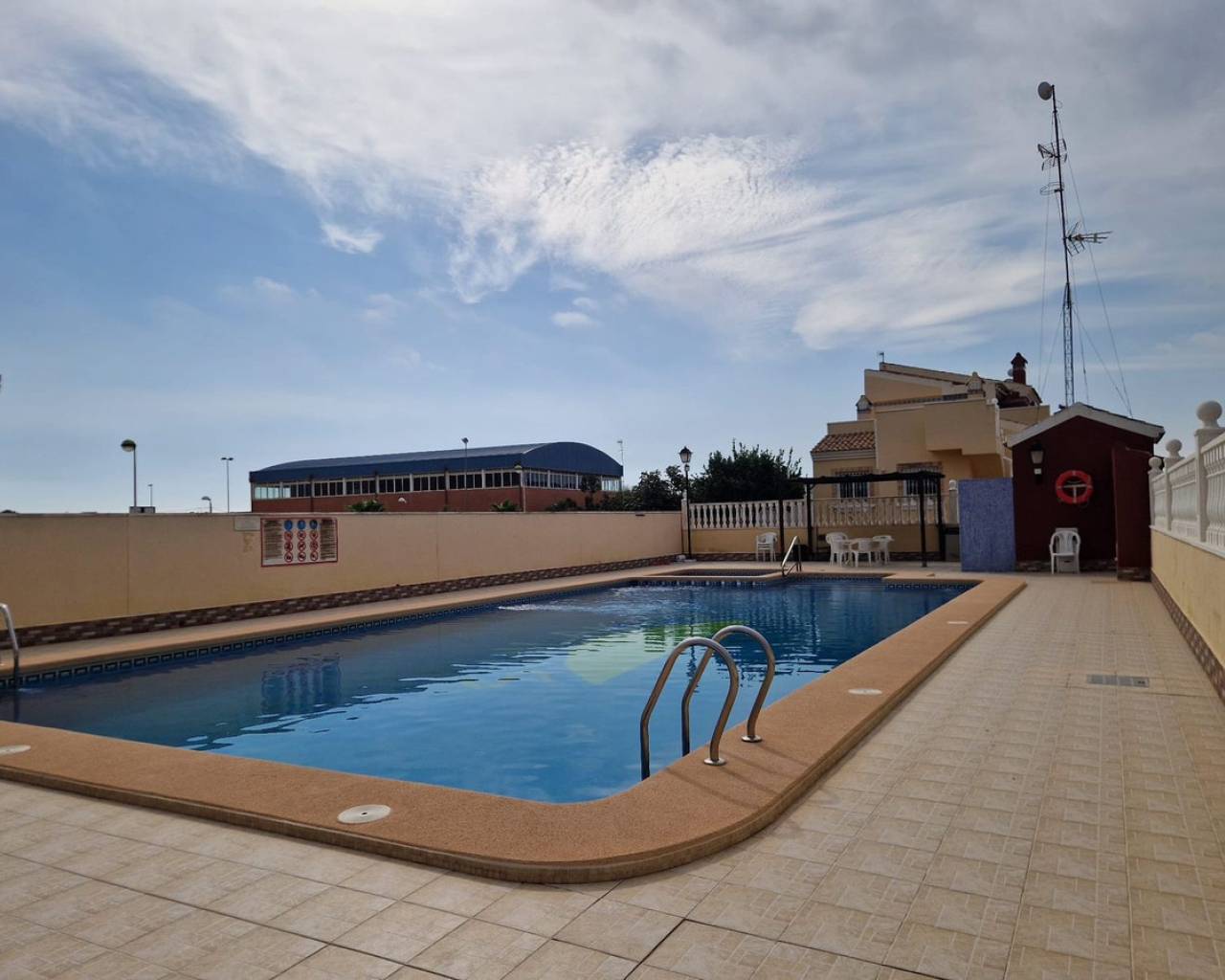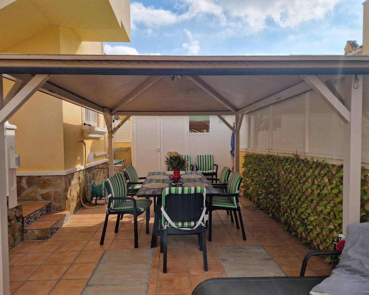 Nestled in the charming Urbanisation Sunlake 1 in Torrevieja, this lovely bungalow offers an inviting atmosphere with ample green spaces and proximity to the picturesque salt lakes. The ground floor features two bedrooms with wardrobes, two bathrooms, a spacious living and dining area, and a fully fitted kitchen. Additionally, the solarium houses a third guestroom or can be utilized as storage. The property boasts a generous garden with a pleasant private terrace, a covered dining and BBQ area, and a storage room. There is also the option to park a car in the garden or create a private pool. The community offers a communal pool and an underground parking space, although the latter is not included with the property. Torrevieja, located in Spain's southeastern Alicante province on the Costa Blanca, is renowned for its Mediterranean climate and stunning coastline. The city features promenades along sandy beaches, a vibrant local market, and all the amenities one could need within walking distance. Ideal for those who prefer not to drive, Torrevieja offers convenient access to the beach, marina, shops, and the Museo del Mar y de la Sal, which highlights the town's fishing and salt-mining history. Regular bus routes make getting around easy, and the Friday market is not to be missed for great bargains. Water sports, boat trips to the island of Tabarca, and numerous golf courses just a short drive away add to the town's appeal.