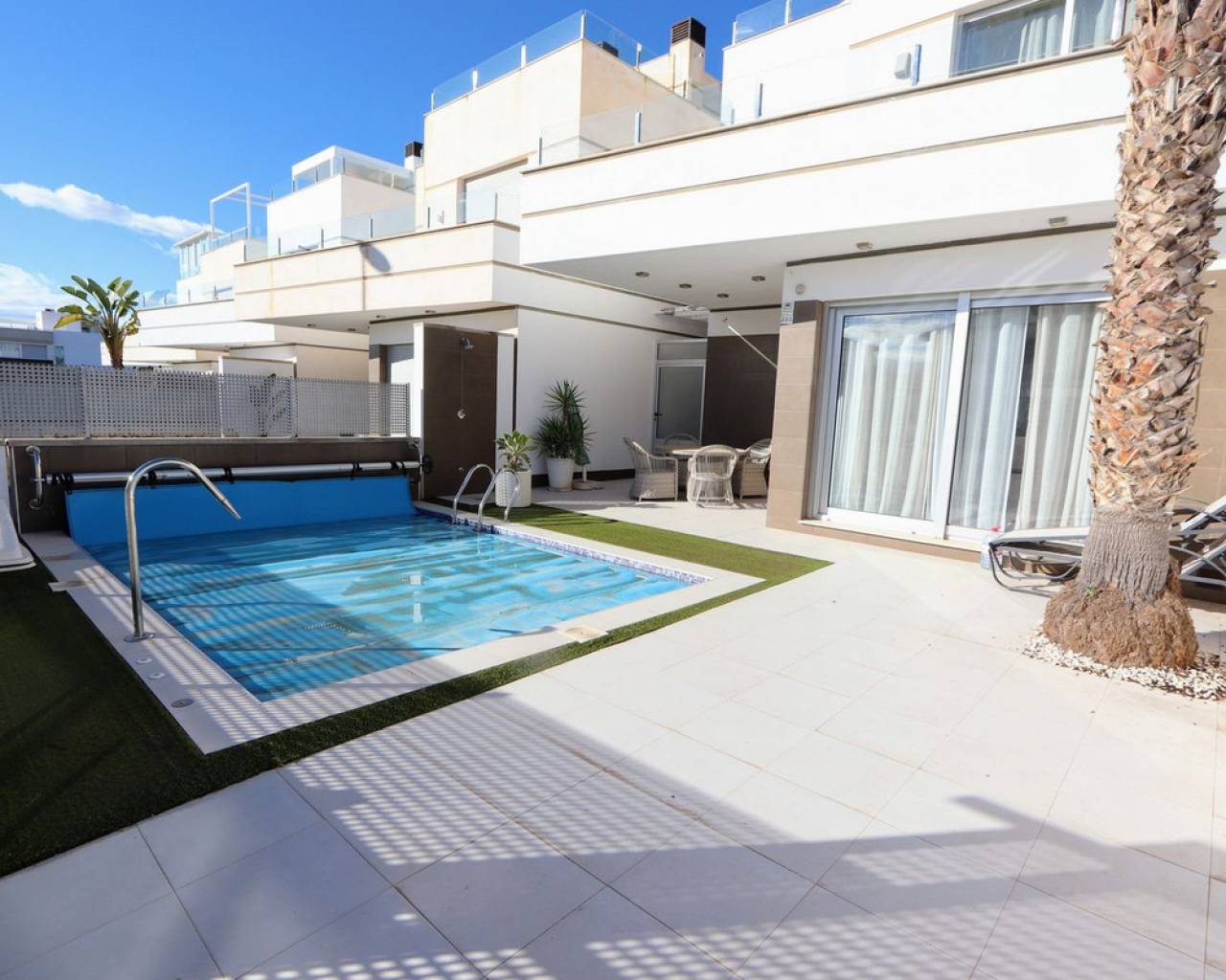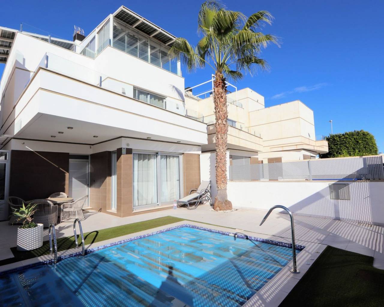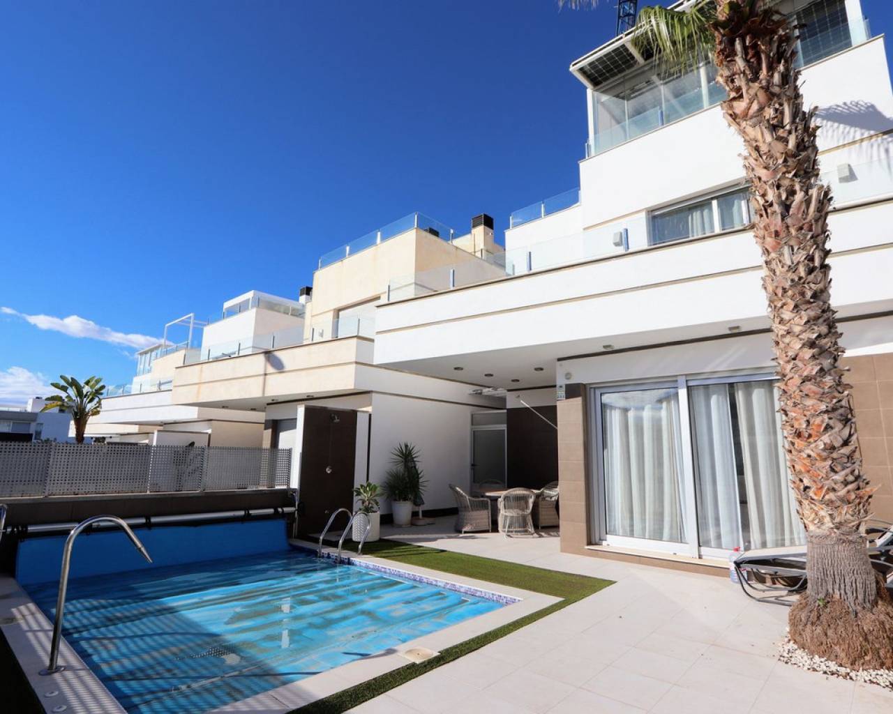 Take a look at this Fabulous Detached Villa located in Lomas de Cabo Roig. This newly built resale property features three bedrooms with fitted wardrobes, three bathrooms, a spacious living/dining area, and a fully fitted kitchen. Additional benefits include air conditioning, private terraced areas to the front and back, off-road parking, underfloor heating in living area and bathrooms, electric blinds, and solar panels for electric. The property benefits also from a private swimming pool. Lomas de Cabo Roig is a tranquil residential area in Orihuela Costa, Alicante, situated 4 km south of Torrevieja. The area offers a variety of shops, restaurants, and bars. You'll find many beautiful blue flag beaches nearby, including the popular beach next to Cabo Roig marina, which offers excellent views. For golf enthusiasts, Cabo Roig is ideally located near several championship courses, including the three Villamartin courses and the world-renowned La Manga golf complex