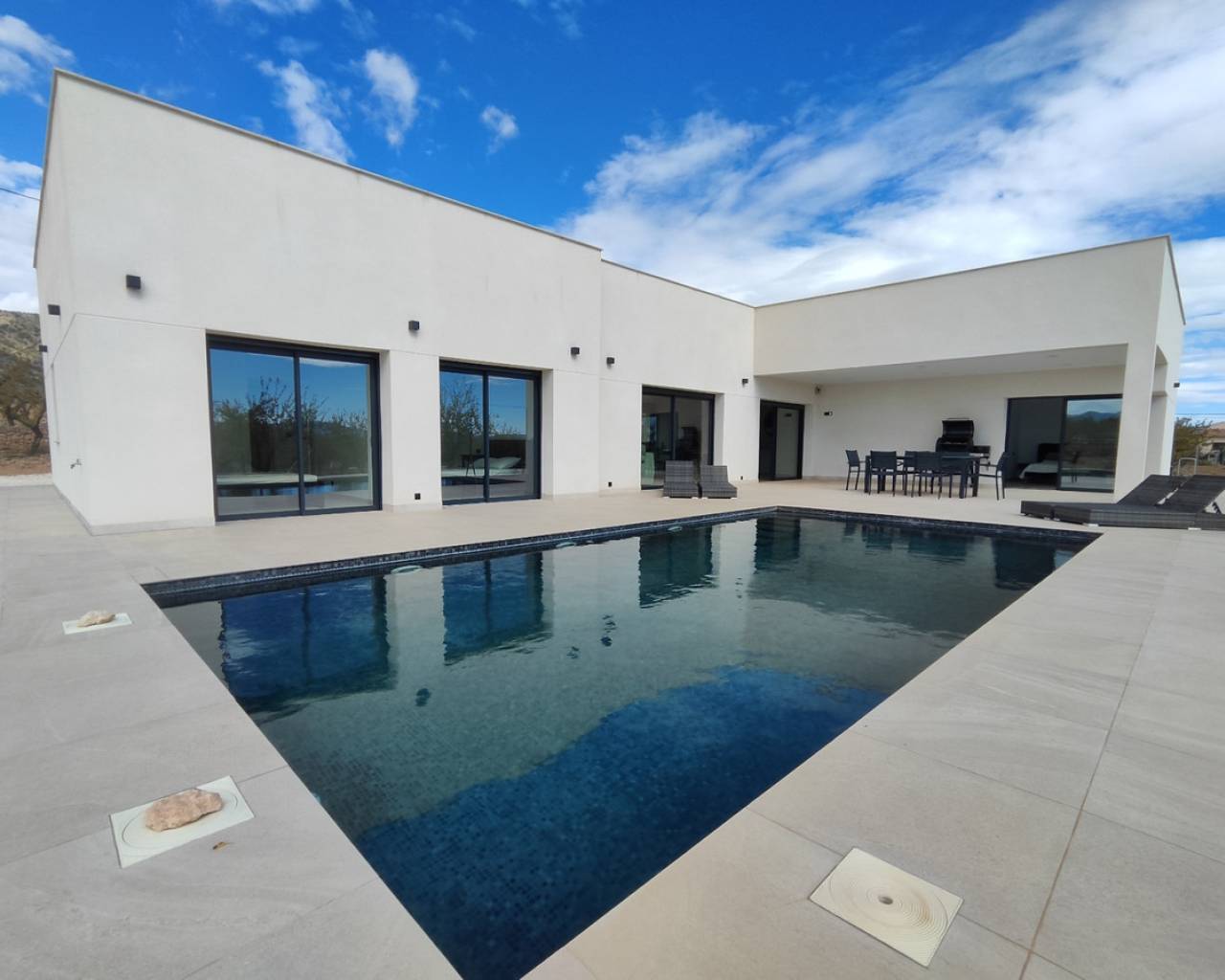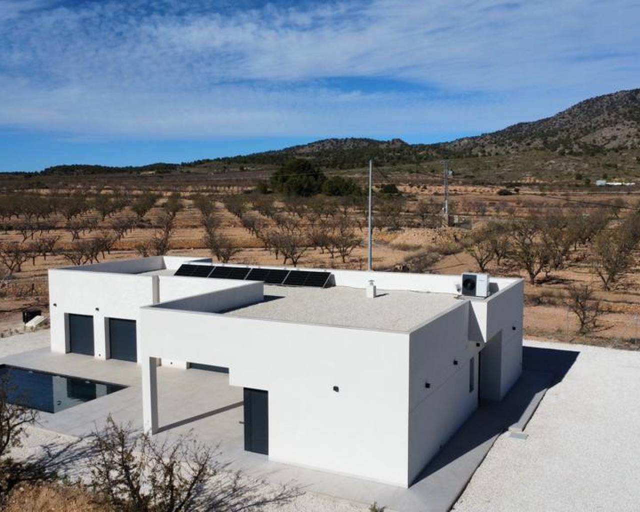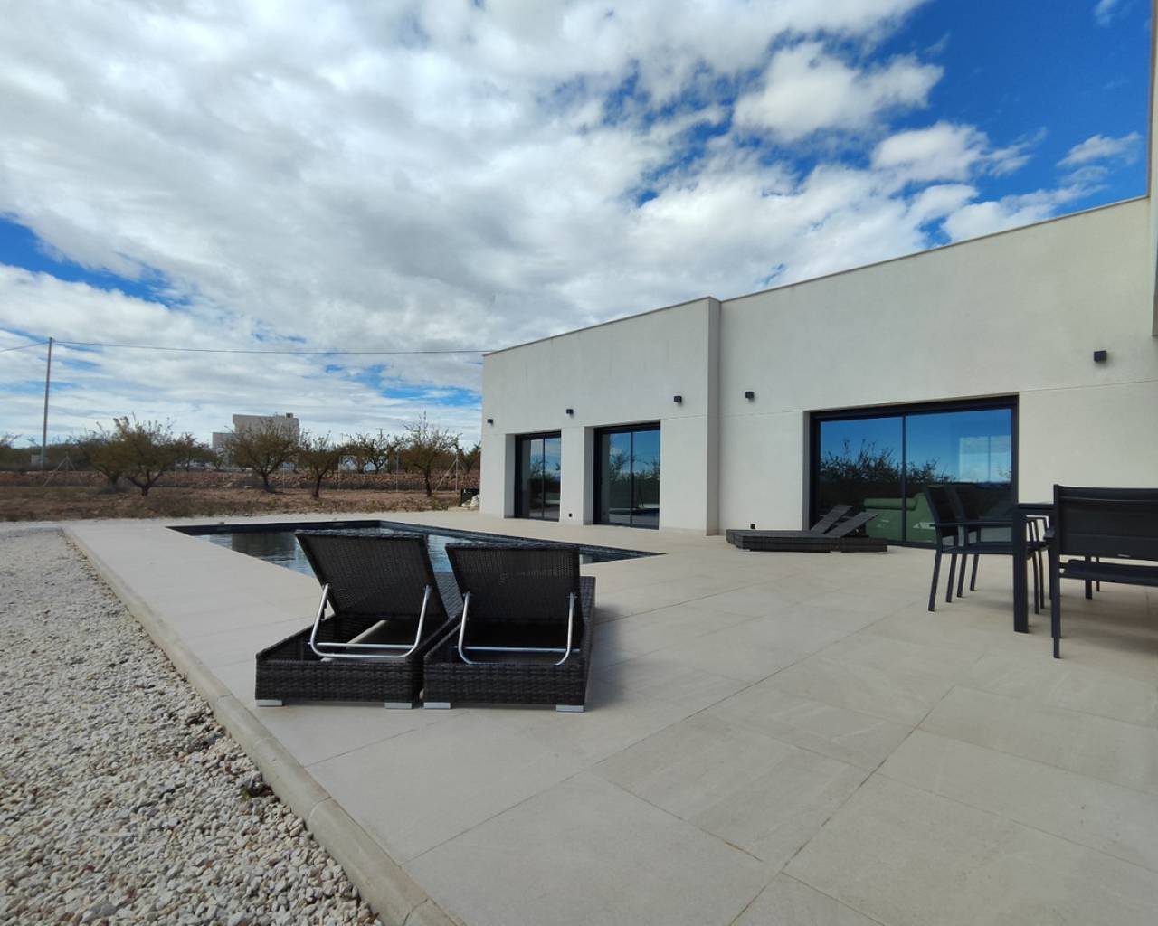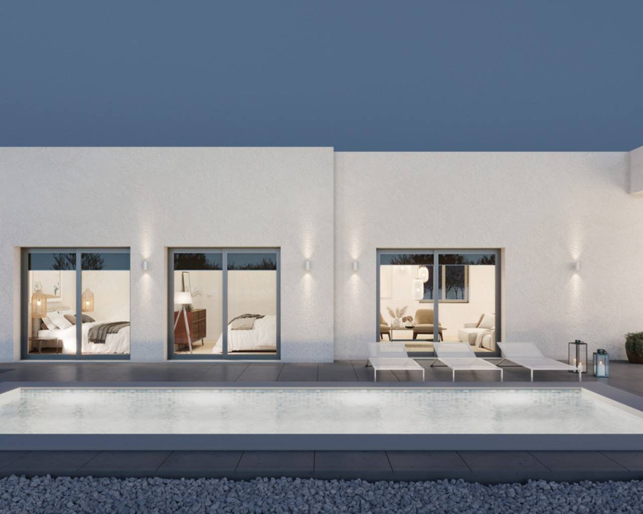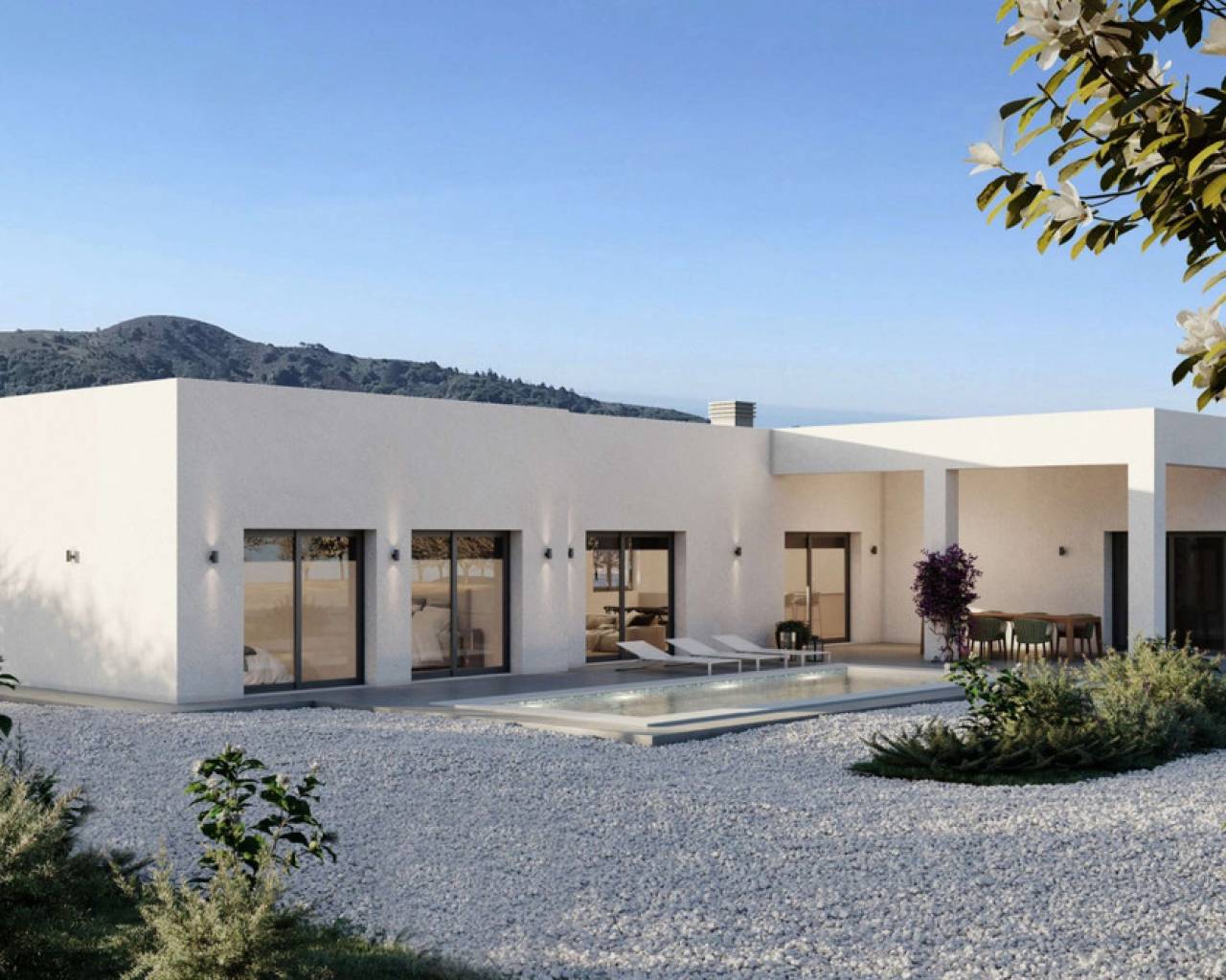 The villas are modern, independent, and customizable, tailored to the specific needs of each client. They are available on both rural and urban plots, in tranquil and naturally beautiful locations within the province, such as Aspe, Monforte del Cid, La Romana, Pinoso, Salinas, Yecla, and Elche. Construction and Structure: Foundation & Structure: Concrete foundation with reinforced concrete beams and slabs. Thermal insulation and waterproofing for roofs and terraces. Exterior Walls: Cellular concrete blocks (Ytong) or thermo-clay blocks with water-resistant mortar. Interior Walls: Ceramic brick or plasterboard with thermal insulation. Insulation: High-quality thermal and acoustic insulation for superior comfort. Interior Features: Floors: High-quality porcelain tiles (up to 20 €/m²) throughout the villa. Painting: Neutral tones of first-quality plastic paint on the walls. Ceilings: Suspended gypsum board ceilings with a smooth finish in maintenance areas. Interior Layout: Ceramic or plasterboard walls, with water-resistant panels in wet areas. Kitchen: Fully Equipped: Customized kitchen with melamine furniture, high-quality appliances (induction cooktop, oven, microwave, extractor), and quartz or granite countertops. Sink & Faucet: Stainless steel or resin sink with a monoblock faucet. Bathrooms: Finishes: High-quality ceramic tiles (up to 20 €/m²). Fixtures: Wall-hung toilets with concealed cisterns, anti-slip resin shower trays, chrome shower columns. Storage: Melamine bathroom furniture with integrated sink and mirror. Carpentry: Exterior: Aluminum windows with thermal break and double glazing (Climalit). Motorized roller shutters. Interior: White lacquered doors, security entrance door, built-in wardrobes. Exterior Spaces: Paving: Ceramic sidewalk surrounding the villa, with gravel (1,000 m²) in rural plots. Fencing: Decorative wall with motorized gate and chain-link fencing in urban plots. Pool: Custom-sized pool with a paved area (50 m²) finished with non-slip ceramic tiles. Installations: Plumbing & Hot Water: Multilayer pipes, PVC sewage system, and solar panels for hot water. Electricity: Fully installed electrical system with LEGRAND mechanisms and LED recessed lighting. Air Conditioning: Pre-installation of air conditioning throughout the house (except in wet areas). Customization: Each villa can be customized to the client's preferences, from flooring and kitchen designs to bathroom accessories and color schemes. Summary: These villas offer modern construction, energy-efficient systems, and high-quality materials. The customization options allow clients to create a home that suits their individual tastes, ensuring a comfortable and contemporary living space in a natural and accessible environment.