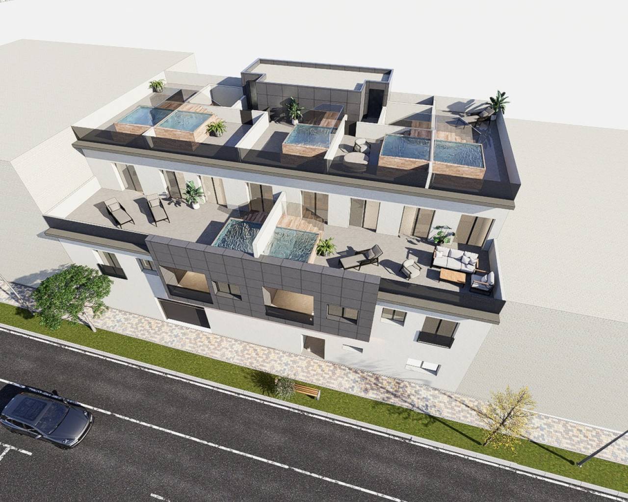 We are delighted to present our new development, located in a central area of Pilar de la Horadada, Alicante. This development is designed with 7 apartments of 1, 2 o3 bedrooms and 1 or 2 bathrooms with fully equipped kitchens including electrical appliances and pre-installation of ducted air conditioning. The houses are distributed by floors: 1 ground floor apartment with 3 beds, 4 first floor apartments with individual solarium on the roof of the building with 1 or 2 bedrooms and 2 penthouses of 3 bedrooms with private terrace. In addition, jacuzzi is included and garage space for each apartment and lift from the ground floor to the third floor