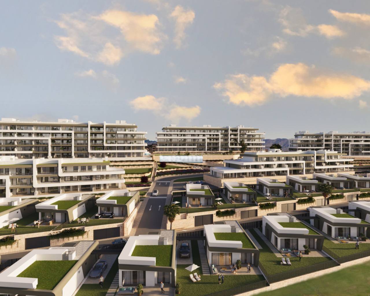 Enjoy the life of your dreams at this project: morning runs; a relaxing swim in the complex pool; a charming meal with friends and family in the Social Club; and an afternoon's fun with the kids in the children's areas. And all this in exclusive surroundings a few steps away from a relaxing game of golf. Buildings and architecture with great elegance and contemporary style that will captivate you. A brief stroll through the complex feels like strolling through an art gallery. The large spaces and communal areas of the exterior of the complex are modern in style and created with the loving care shown by an artist for their canvas. They will always give you a reason to escape. Whether alone, with your pet or with your loved ones, every spot you visit is designed to provide visual comfort and to keep you and your loved ones safe. During your strolls through the communal areas of the complex, you may find: A large fountain finished in blue tiles. A poolside area with natural grass. Furniture spread throughout the plot on which to rest and contemplate the views of the complex. Small areas of artificial lawn and ceramics with lustrous wood tone. The complex is fully fenced off with video intercom for your safety and the safety of those who matter most to you. Luxury apartments Two and three-bedroom homes captivate those seeking a home in magical surroundings. These extraordinary apartments are distinguished by their large terraces, offering views of the sea and the golf course. Every day, you will wake up surrounded by natural beauty that inspires peace of mind and serenity. Besides their exclusive location, these apartments include amenities like parking space and a storage room. In the communal areas, you may enjoy a splendid swimming pool, beautiful gardens and an exclusive social club, designed to encourage social encounters in a distinctive setting. These apartments are ready to help you start a new life with everything you need. Read the building specifications and find your new apartment.