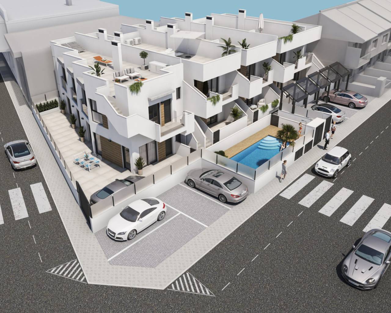 We are pleased to announce the launch of our new development, located in San Pedro del Pinatar (Murcia), surrounded by all services, sports areas, several Golf Courses and 5 minutes from the Mediterranean Sea and the beaches of the Mar Menor. Furthermore, its proximity to the beach makes it an ideal option for your leisure time and Summer getaways. This residential complex is characterised by its 10 maisonettes, which offers 1 bedroom, 1 bathroom properties at a very affordable price and 3 bedrooms, 2 bathrooms properties. Parking space for each house to meet the needs of each client, offering comfort and style. The interiors, elegant and functional, have fully equipped kitchens including electrical appliances. The bathrooms have a vanity unit with washbasin and light. Each property has pre-installation for ducted air conditioning in false ceilings, a magnificent solarium for the upper floors and an attractive communal swimming pool area, making it the perfect place to enjoy and relax. Prices from 179.900 € + I.V.A.