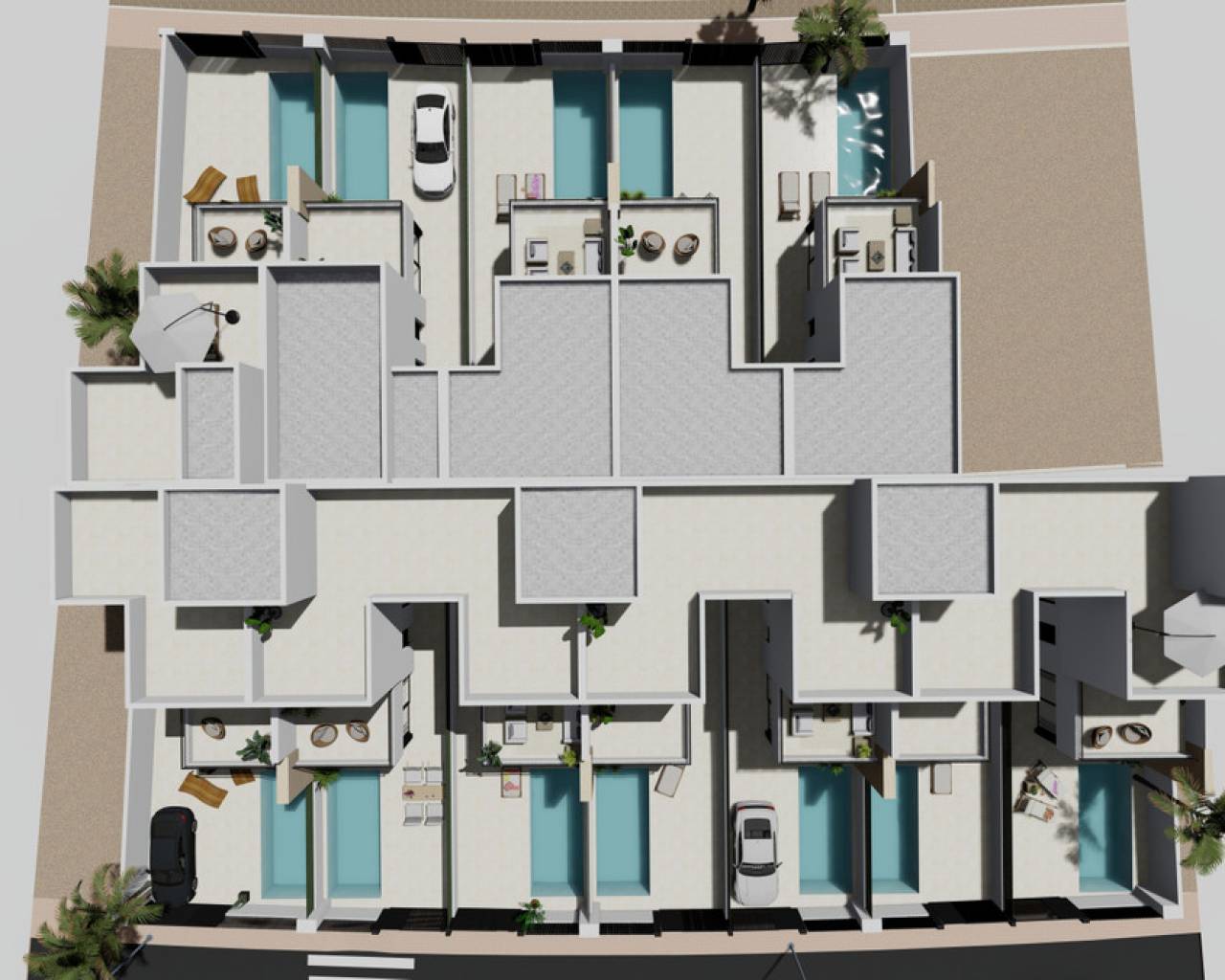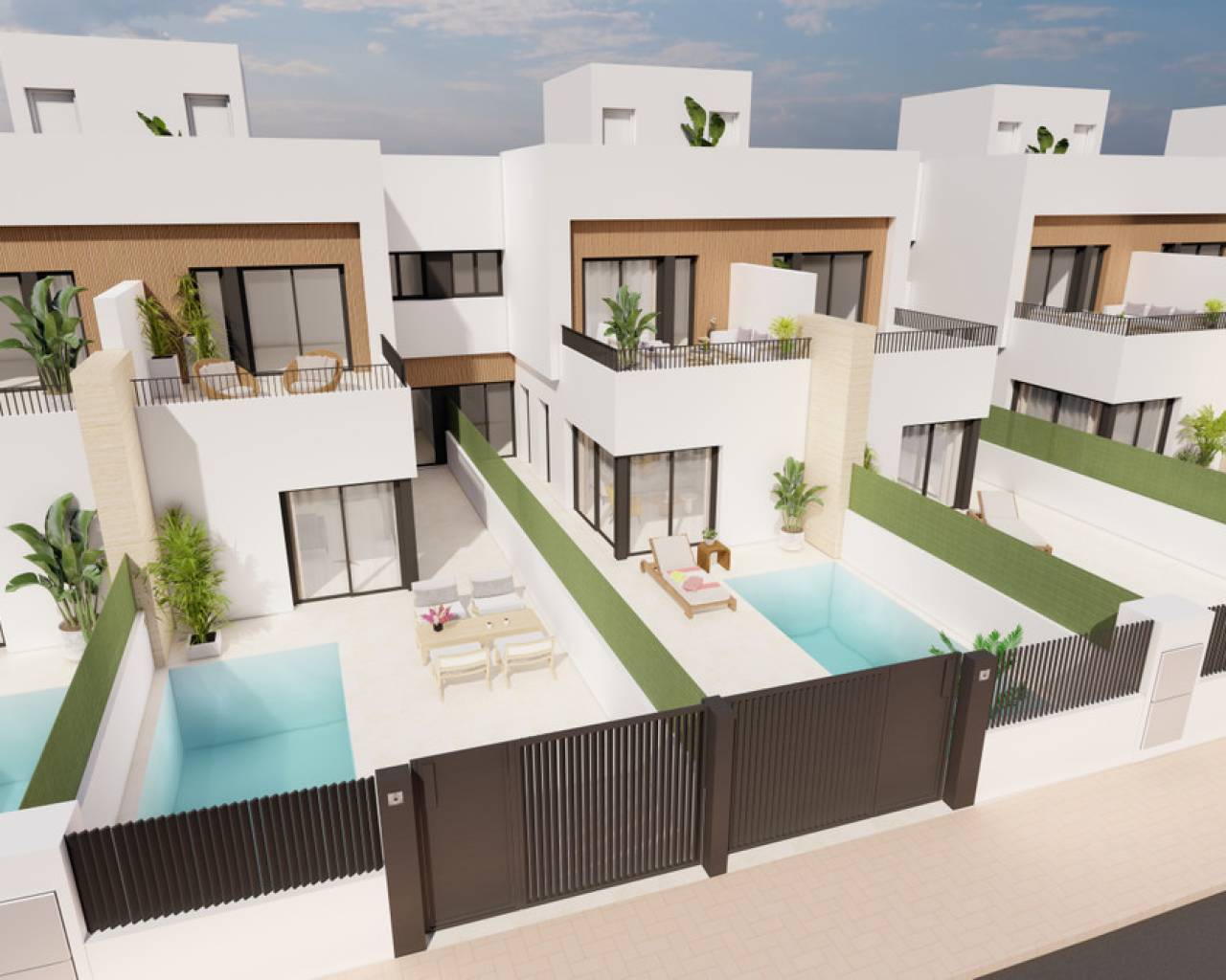 This development is designed with 12 villas with 3 bedrooms and 2/3 bathrooms including private swimming pool, terrace and solarium with summer kitchen in selected properties. In addition, two properties include photovoltaic panels for energy saving.