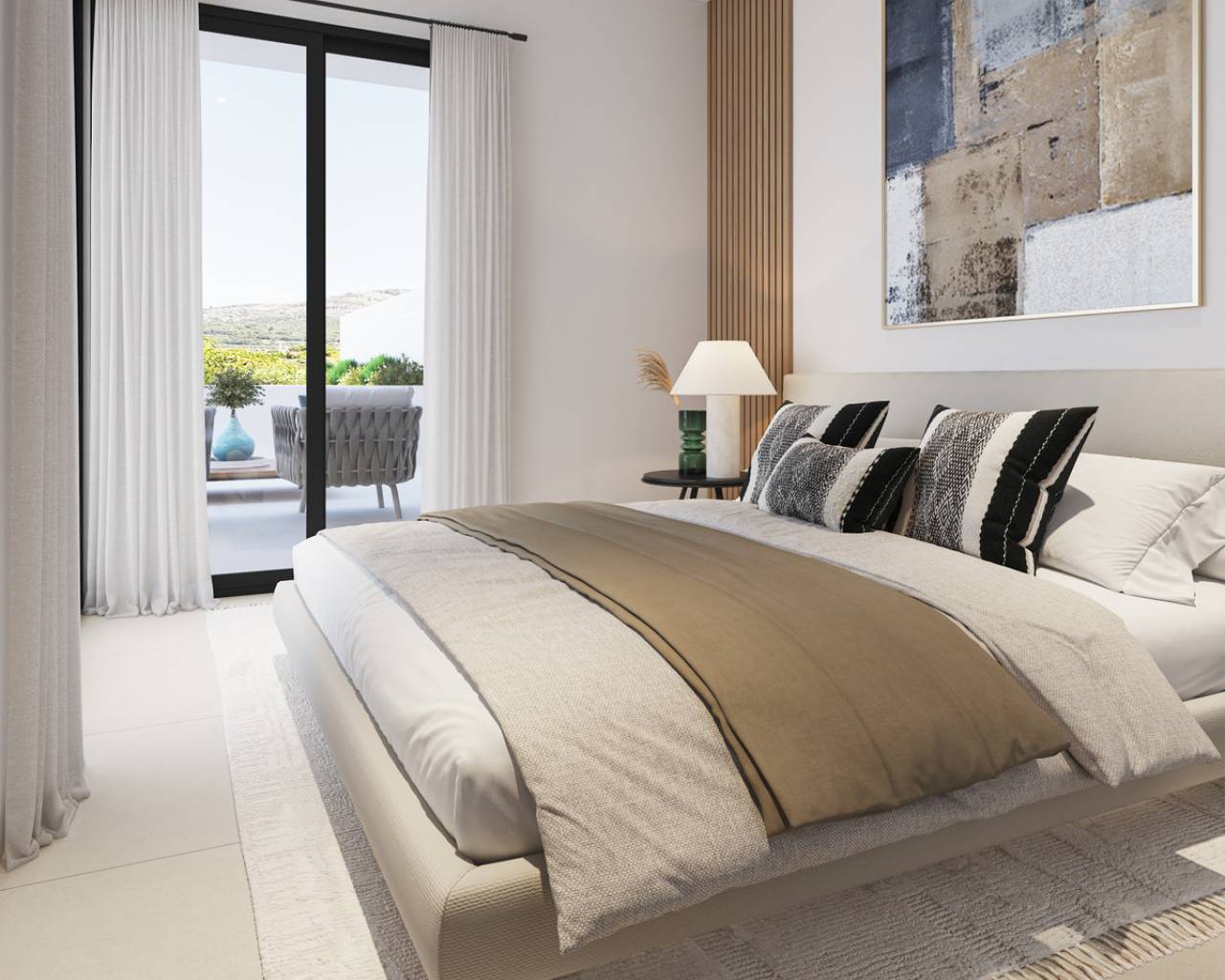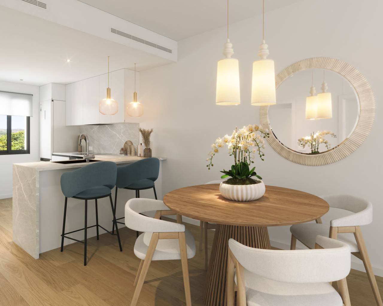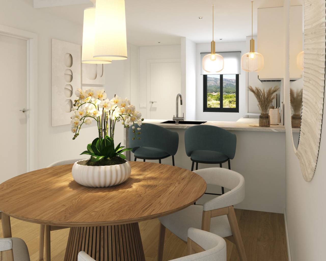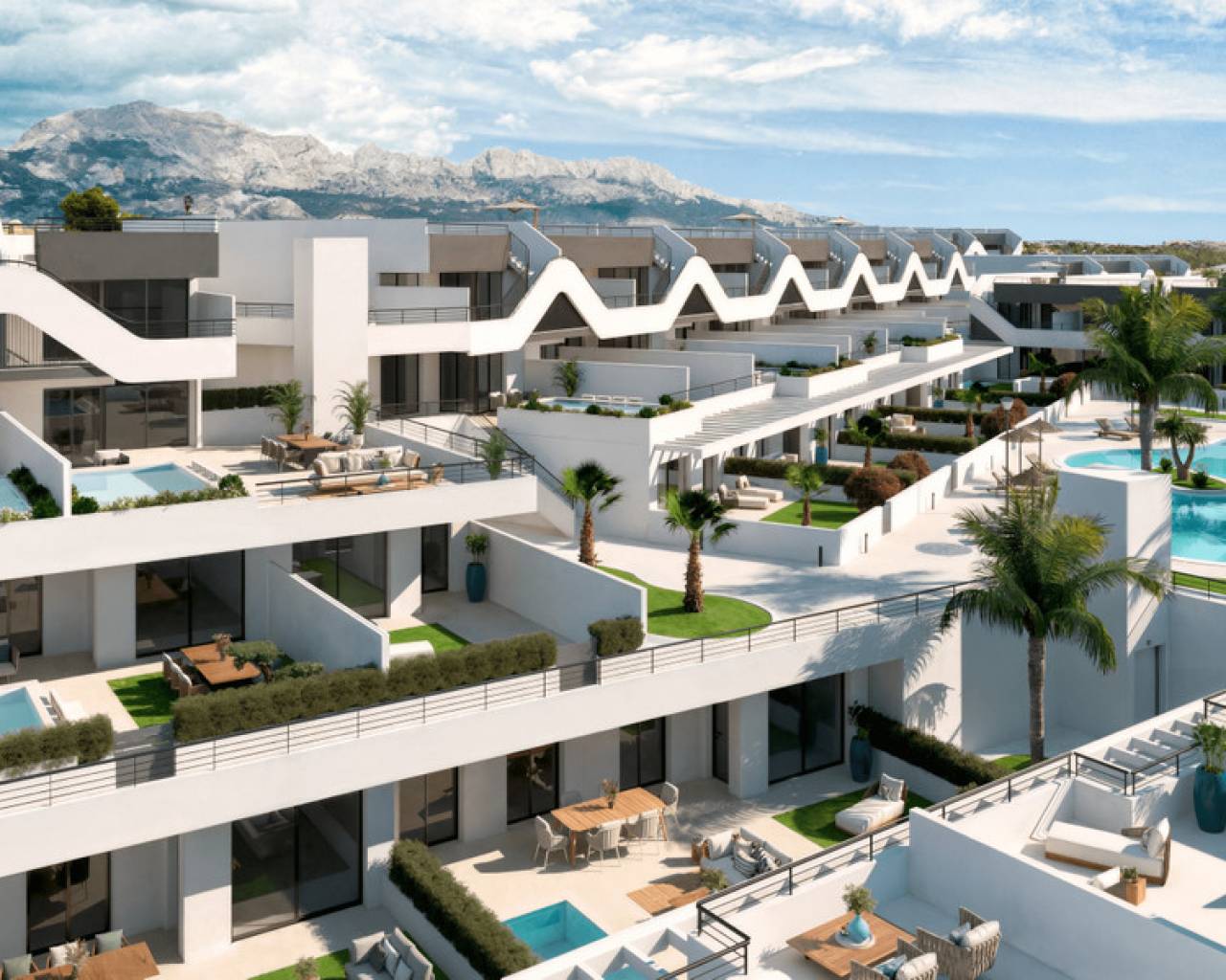 We present an exclusive residential complex in an elevated area of Alfaz del Pi, surrounded by Mediterranean nature and with all the services needed for daily life. This exclusive project of 123 apartments has been designed for those seeking tranquility, well-being, and a carefully maintained environment. Each home offers spaces created for comfort, with spacious terraces, landscaped areas, and access to a communal swimming pool — all within an atmosphere designed to relax and enjoy the outdoors 365 days a year. The design is complemented by communal areas that enhance the living experience. 1-, 2-, and 3-bedroom apartments, predominantly 2-bedroom, are designed with spacious living rooms and open kitchens, large windows, and direct access to south-facing terraces that fill every space with natural light. Master bedrooms offer generous space and high-quality finishes. Most units come with either a private garden or solarium, perfect for enjoying the outdoors in a private and peaceful atmosphere. For those seeking an even more exclusive experience, there is the option to add a jacuzzi or private pool. In addition, every property includes a private parking space for your maximum convenience. A contemporary, functional, and welcoming design that combines space, brightness, and a true connection with the Mediterranean environment.