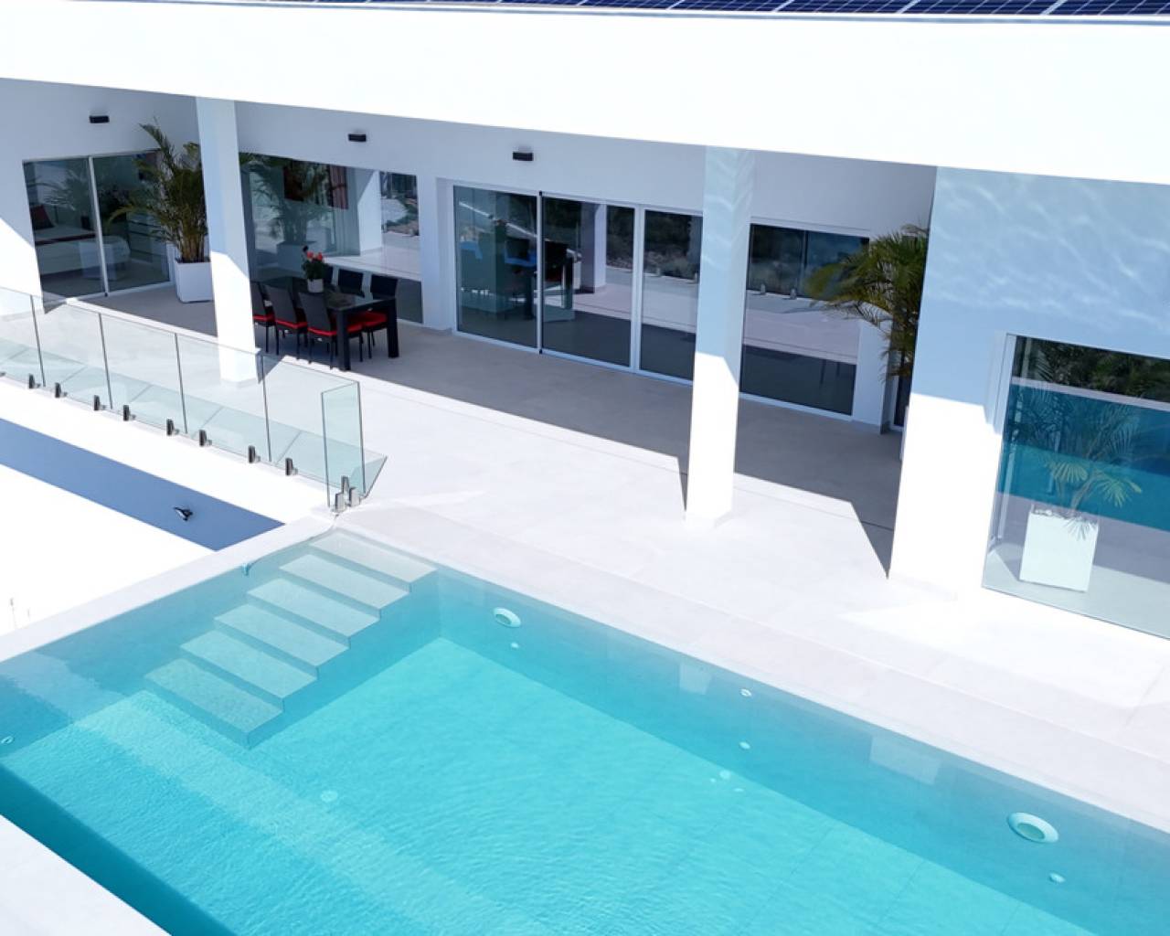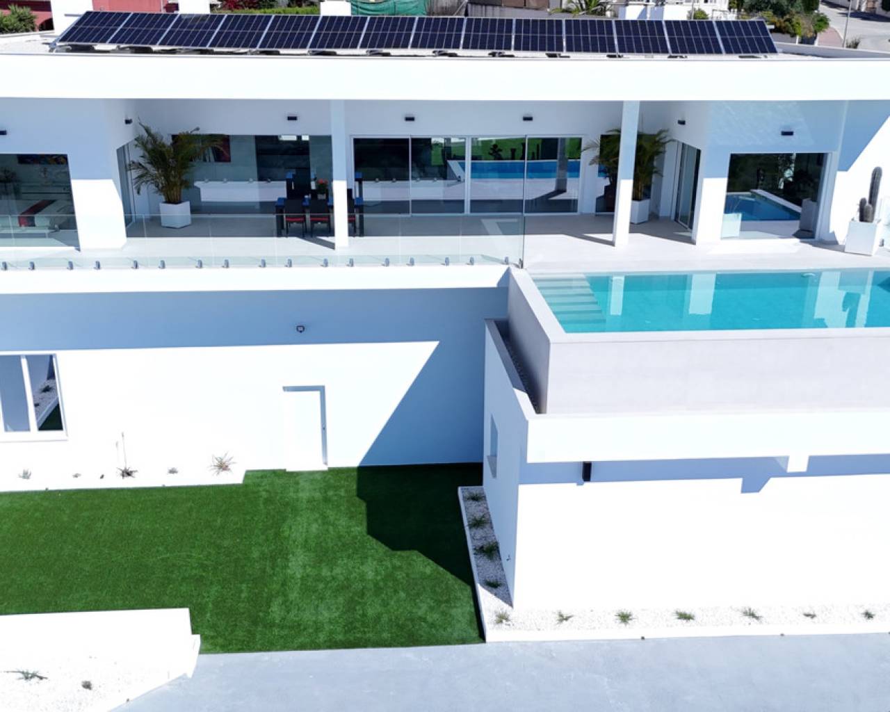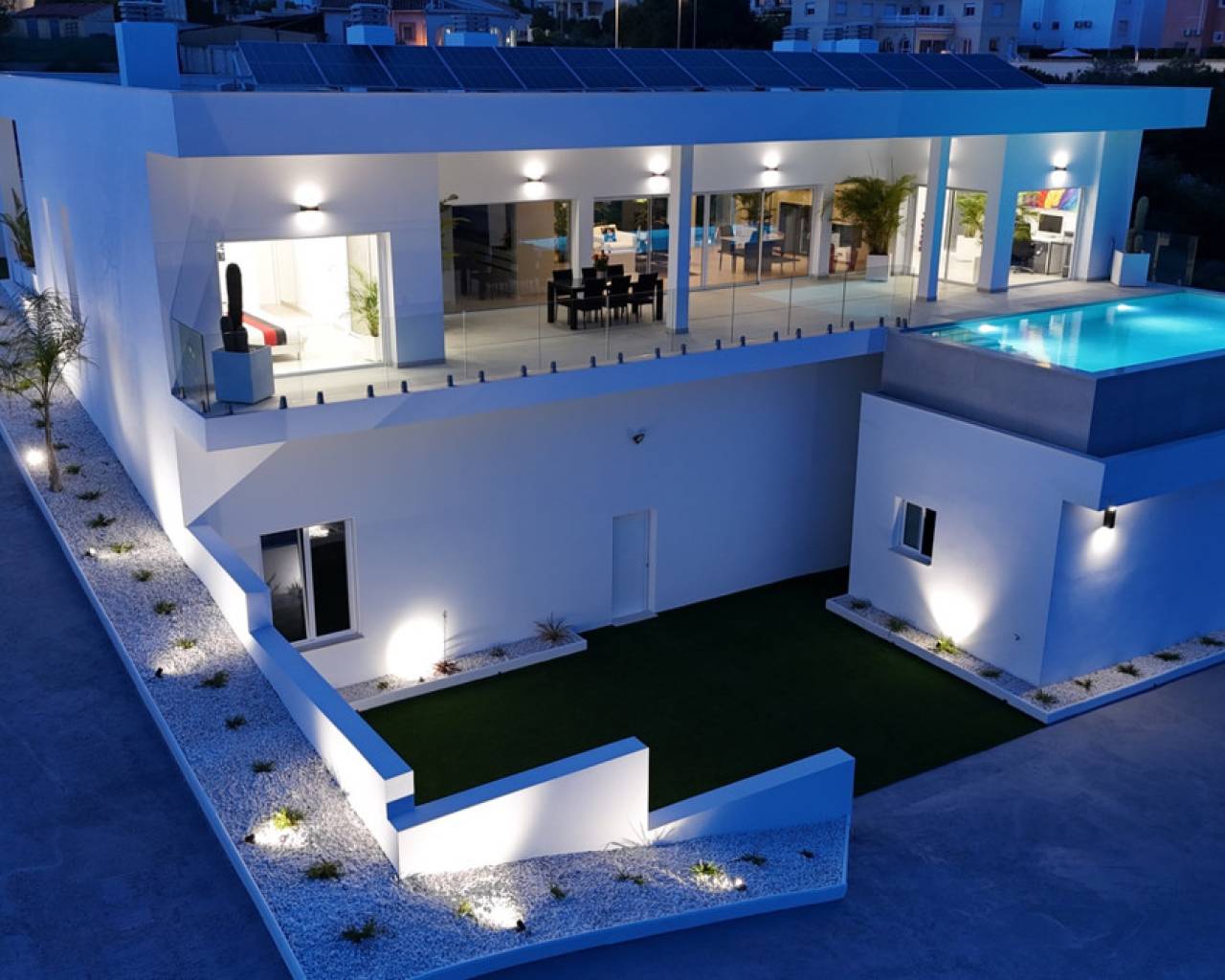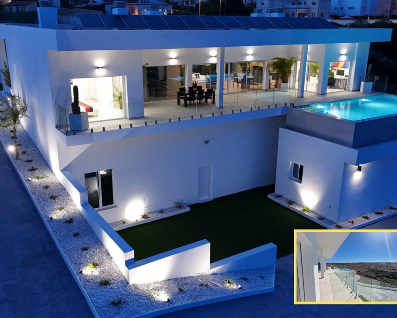 Beautiful new luxury villa (2024) in the exclusive urbanization La Marina/Escuera, on a plot of 1320 m² with breathtaking views of the protected natural park. This modern villa of 273 m² is equipped with high quality materials and luxurious finishes. On the first floor there is a master suite with dressing room and en-suite bathroom, a second bedroom with a beautiful view of the park, a spacious living room with fireplace and a fully equipped kitchen with laundry room. The large terrace of 73 m² overlooks the beautiful 8 x 4 m swimming pool and the surrounding garden. Thanks to large floor-to-ceiling windows in every room, the villa is full of natural light and offers spectacular views and maximum sunlight. It is possible to expand with a duplex apartment with an area of 170 m² in the basement and the possibility of adding another room on the terrace. Additions include two large storage rooms, two carports with electric gates and video systems, a lush garden with night lighting and an advanced air conditioning and heating system with individual room controls. Ideally located, just 20 minutes from Alicante airport, 5 minutes from the sandy beach of La Marina and close to all amenities such as supermarkets, restaurants and shops. Price: 1,590,000 euros.