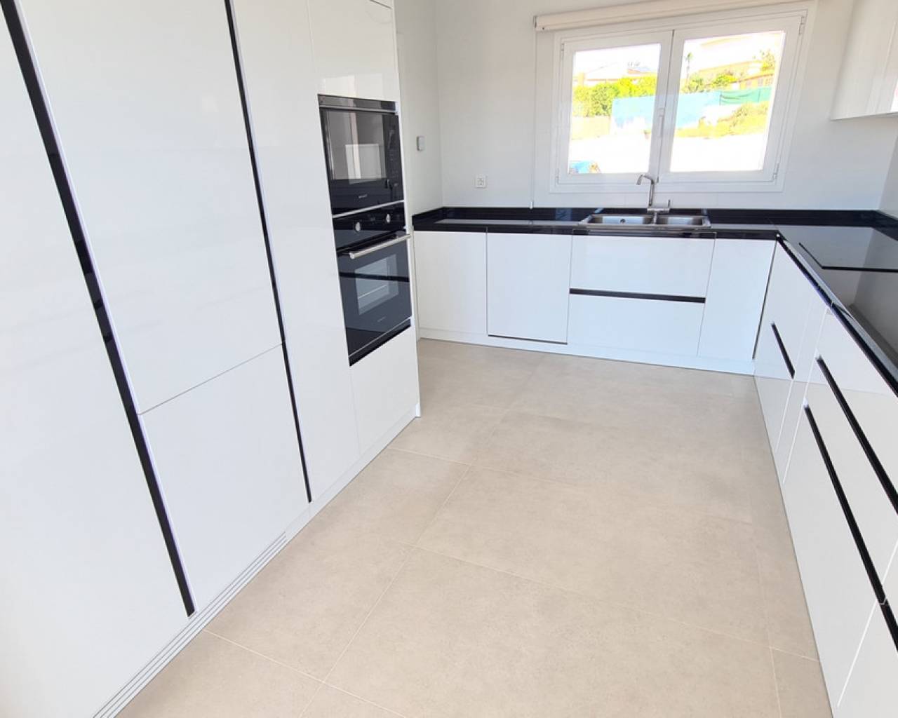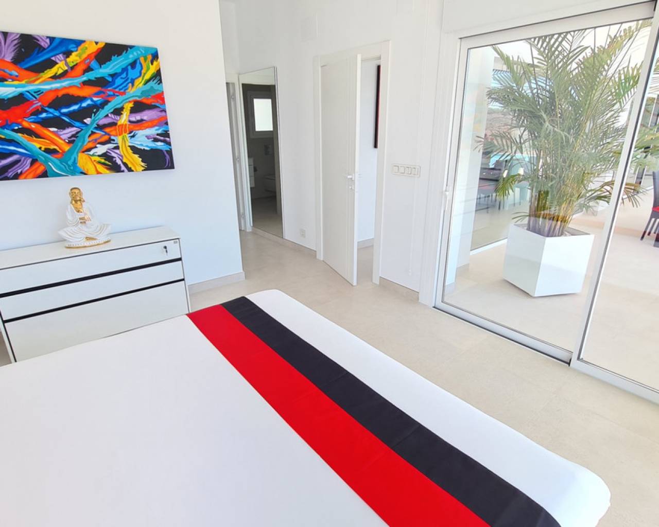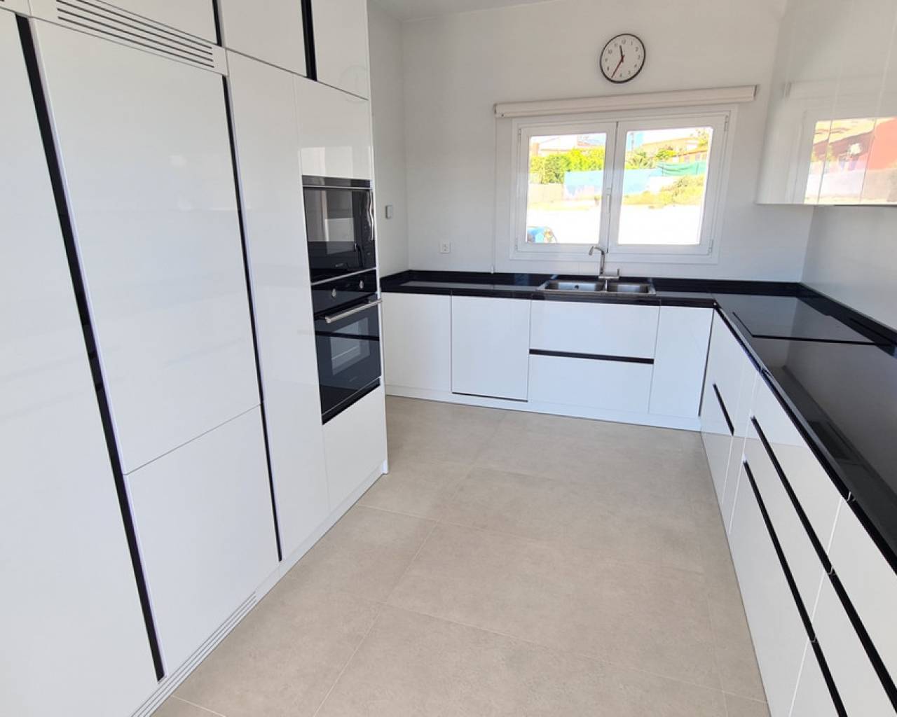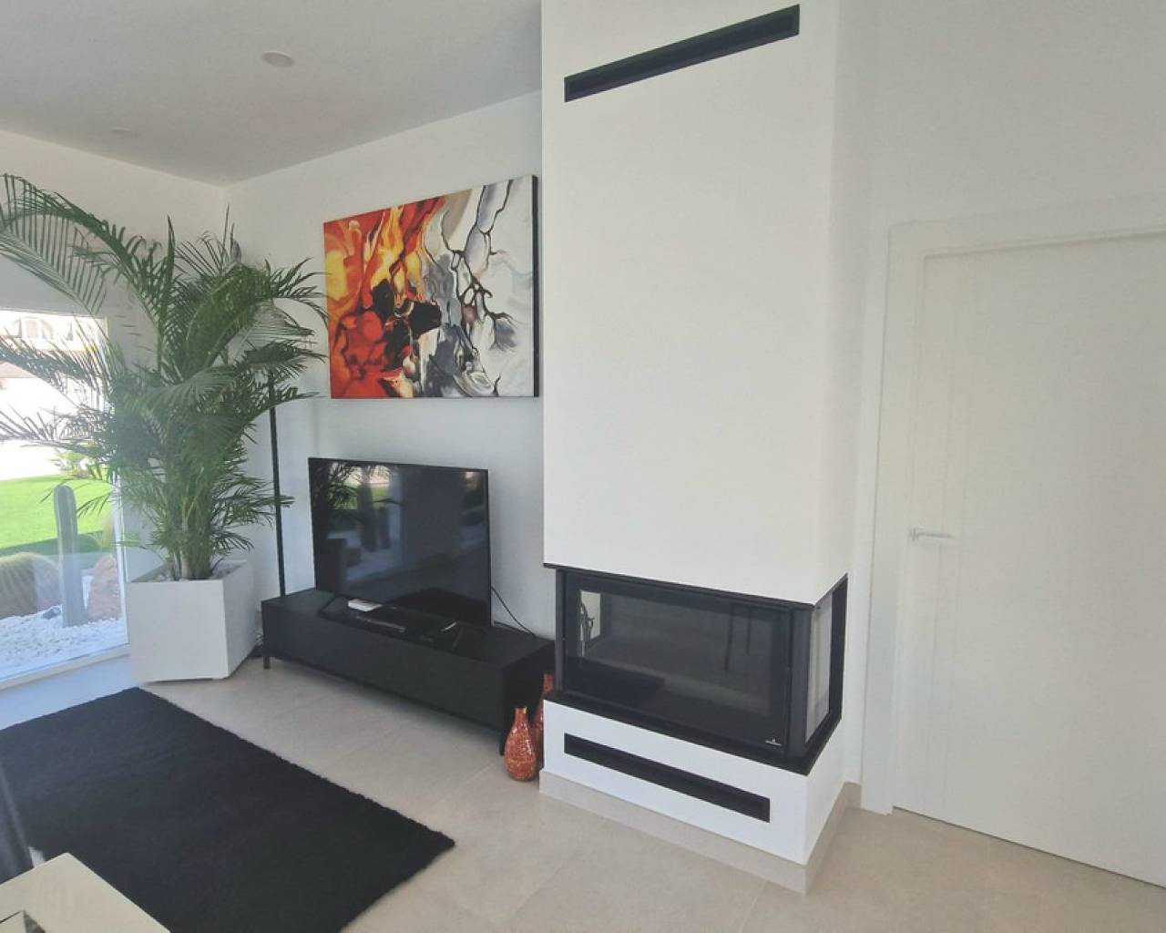 Beautiful new luxury villa (2024) in the exclusive urbanization La Marina/Escuera, on a plot of 1320 m² with breathtaking views of the protected natural park. This modern villa of 273 m² is equipped with high quality materials and luxurious finishes. On the first floor there is a master suite with dressing room and en-suite bathroom, a second bedroom with a beautiful view of the park, a spacious living room with fireplace and a fully equipped kitchen with laundry room. The large terrace of 73 m² overlooks the beautiful 8 x 4 m swimming pool and the surrounding garden. Thanks to large floor-to-ceiling windows in every room, the villa is full of natural light and offers spectacular views and maximum sunlight. It is possible to expand with a duplex apartment with an area of 170 m² in the basement and the possibility of adding another room on the terrace. Additions include two large storage rooms, two carports with electric gates and video systems, a lush garden with night lighting and an advanced air conditioning and heating system with individual room controls. Ideally located, just 20 minutes from Alicante airport, 5 minutes from the sandy beach of La Marina and close to all amenities such as supermarkets, restaurants and shops. Price: 1,590,000 euros.
