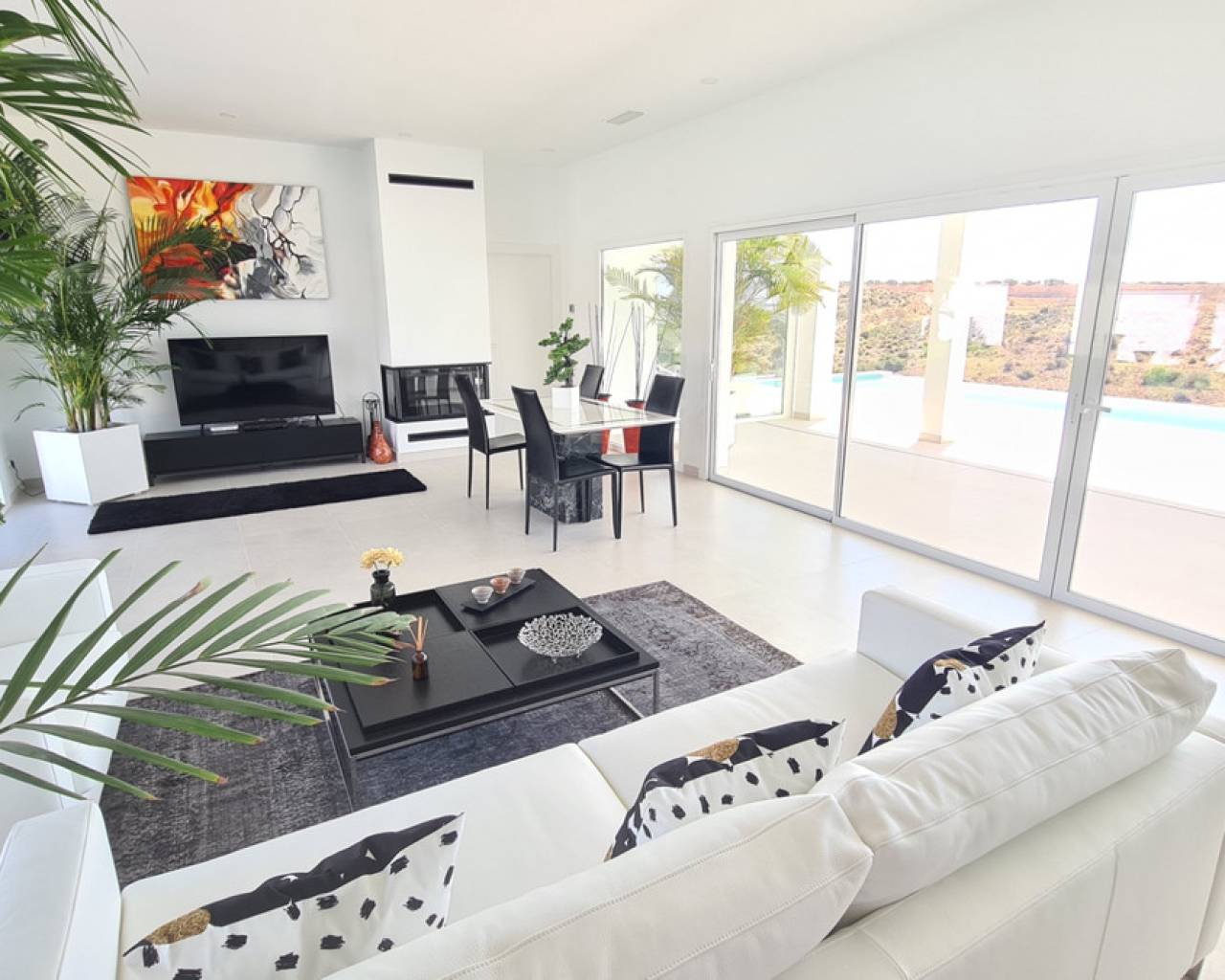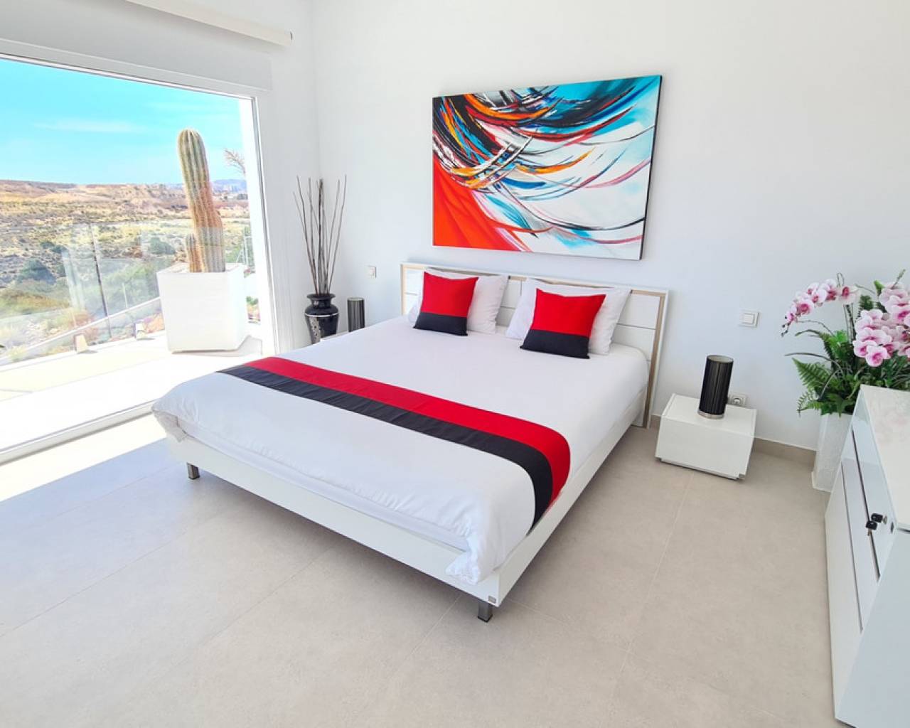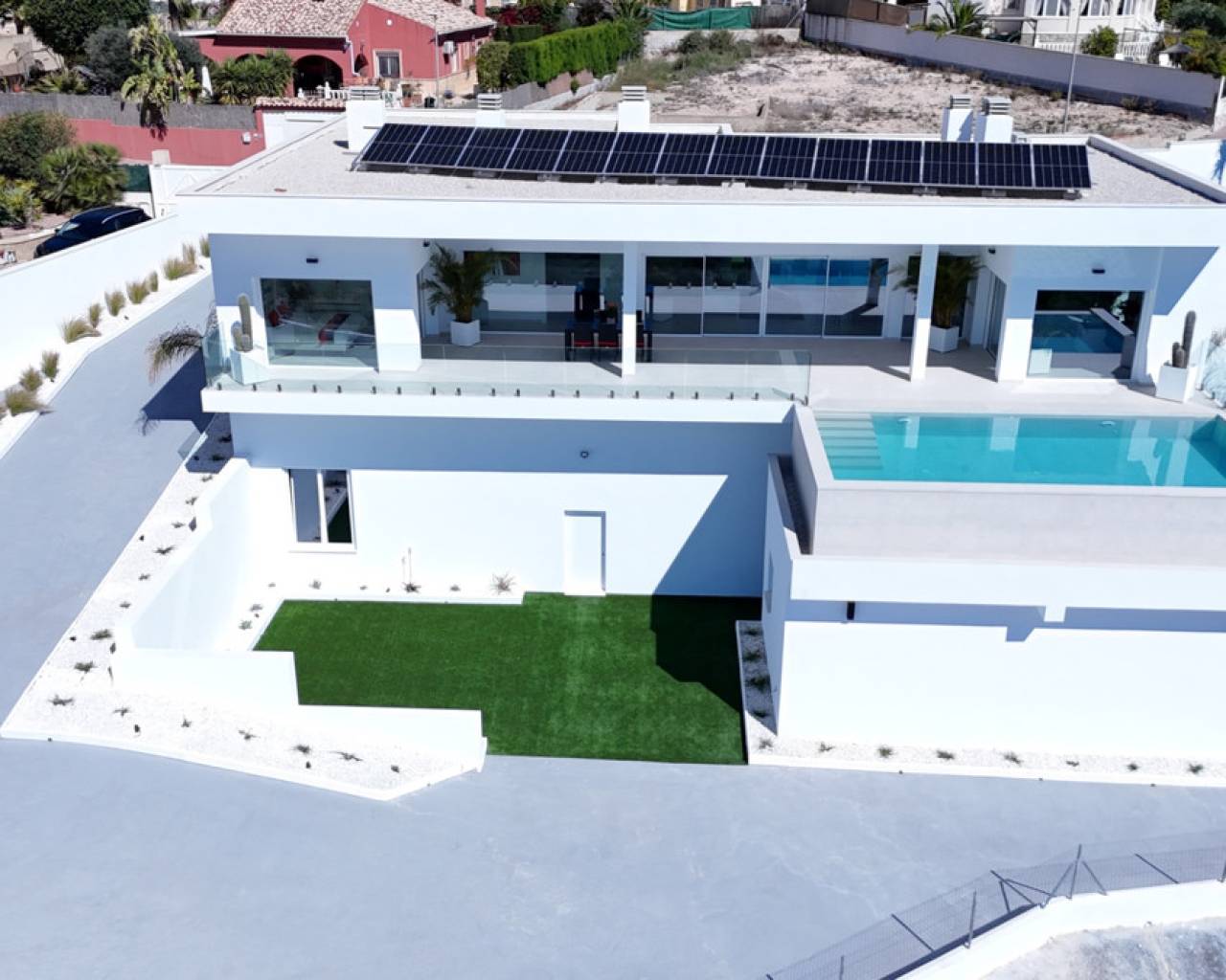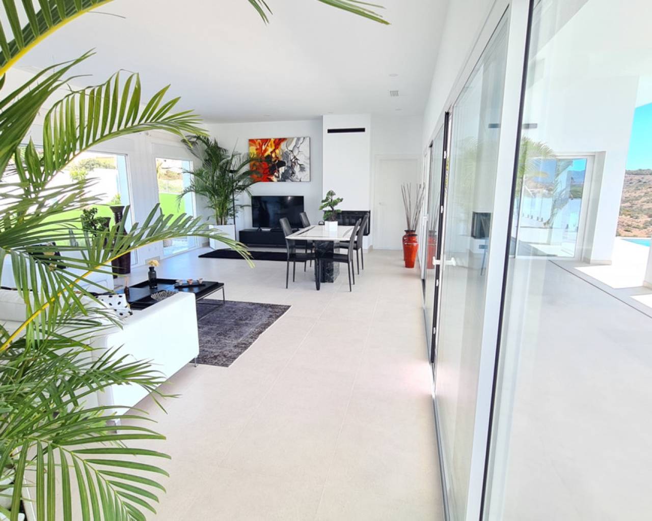 Beautiful new luxury villa (2024) in the exclusive urbanization La Marina/Escuera, on a plot of 1320 m² with breathtaking views of the protected natural park. This modern villa of 273 m² is equipped with high quality materials and luxurious finishes. On the first floor there is a master suite with dressing room and en-suite bathroom, a second bedroom with a beautiful view of the park, a spacious living room with fireplace and a fully equipped kitchen with laundry room. The large terrace of 73 m² overlooks the beautiful 8 x 4 m swimming pool and the surrounding garden. Thanks to large floor-to-ceiling windows in every room, the villa is full of natural light and offers spectacular views and maximum sunlight. It is possible to expand with a duplex apartment with an area of 170 m² in the basement and the possibility of adding another room on the terrace. Additions include two large storage rooms, two carports with electric gates and video systems, a lush garden with night lighting and an advanced air conditioning and heating system with individual room controls. Ideally located, just 20 minutes from Alicante airport, 5 minutes from the sandy beach of La Marina and close to all amenities such as supermarkets, restaurants and shops. Price: 1,590,000 euros.