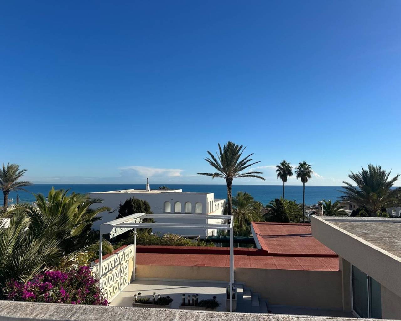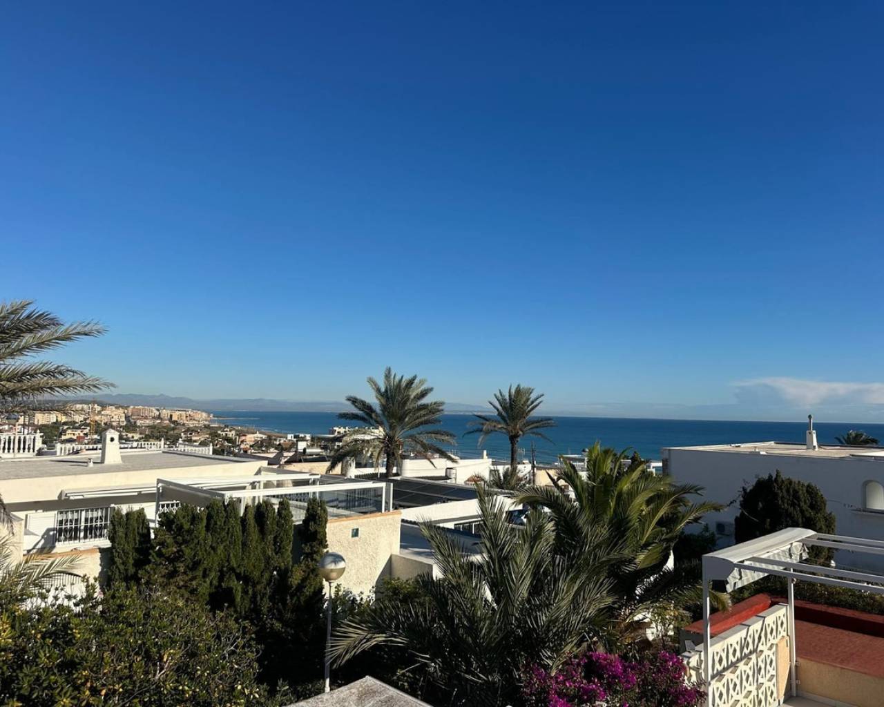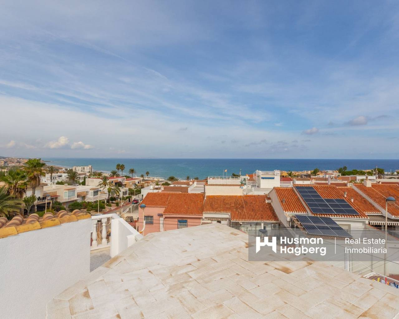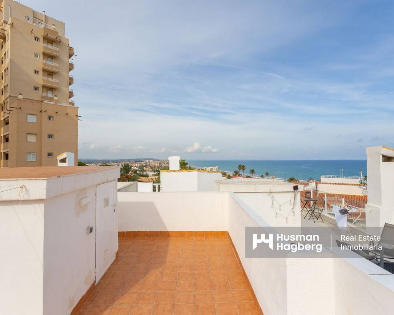 Charming townhouse with roof terrace in a sunny location and sea views We are pleased to present this unique and newly renovated townhouse with fantastic sea views from all floors - a real gem for those looking for a home on the coast with both character and modern comfort. The property offers two bedrooms, one bathroom, a bright living room and an open-plan kitchen. There are several lovely outdoor spaces - a terrace on two levels, a sunny balcony and a roof terrace shared with only one neighbour. From each level you can enjoy the view of the Mediterranean Sea, where sky and sea meet in harmonious blue tones. In 2024, the townhouse underwent an extensive renovation with several upgrades that raise both the standard and quality of life. Among other things, a practical roof storage room and a new balcony were built, and the patio has been expanded to create even more space for relaxation and social moments. The kitchen and kitchen floor have been renewed with stylish materials, and two new air conditioning units have been installed. The guest room now has solar cells, which contributes to a more sustainable living, and the previous bidet has been replaced with a washing machine for increased functionality. The area around Torre del Moro, where the property is located, is one of Torrevieja's most appreciated. Here, history, culture and nature meet in perfect balance. The iconic tower, which has stood here since the 14th century, still watches over the coast and reminds us of the city's rich heritage. Around the tower, a beautiful park spreads out with palm trees, walking paths and seating areas - a place where both locals and visitors gather to enjoy the tranquility and the expansive sea views. Here you live close to beaches, restaurants, parks and services, but still with the feeling of being in your own little oasis. Welcome to contact us for more information or to book a viewing - we of course offer digital viewings for those of you who are unable to be there in person.