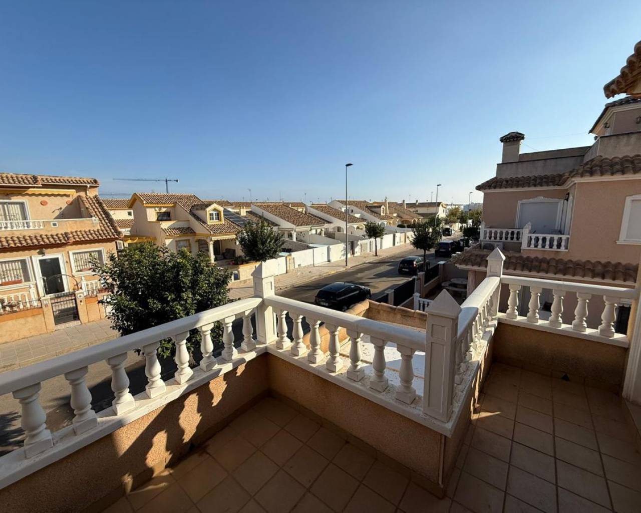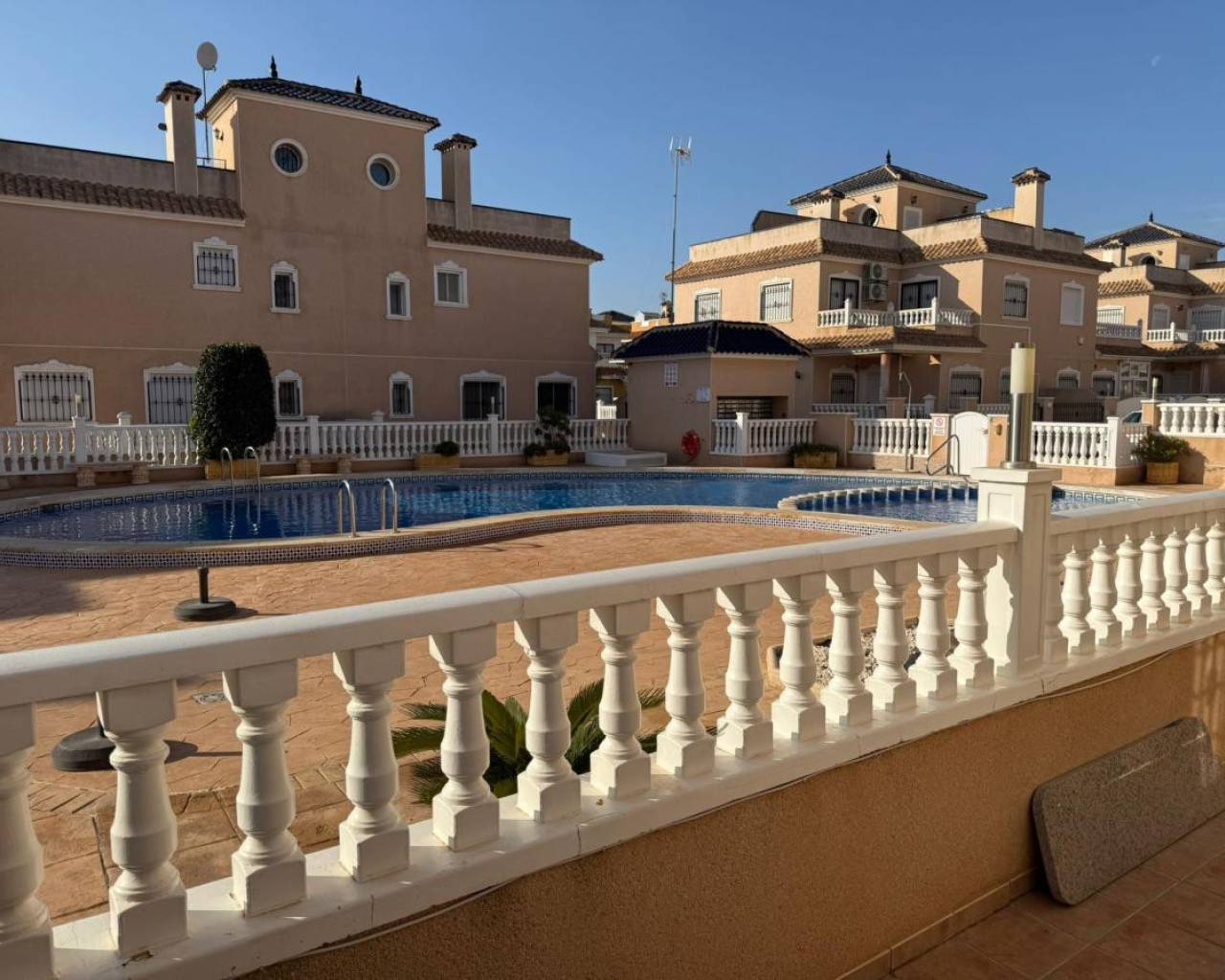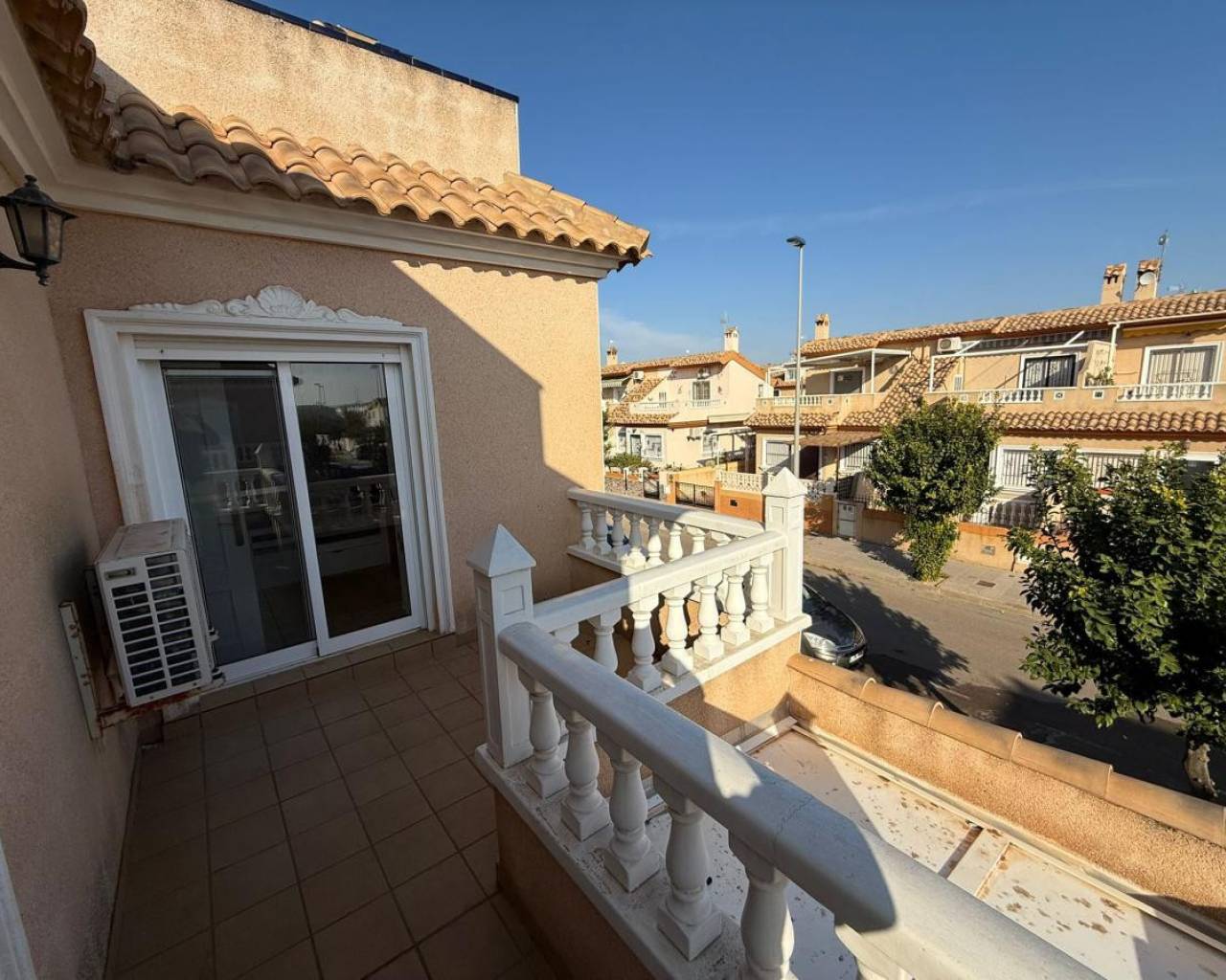 Fantastic semi-detached house for sale in the highly sought-after area of Torre de la Horadada. Situated in a peaceful residential community with a lovely communal pool, this property is less than 900 meters from the stunning beaches of Torre de la Horadada an exceptional location for both holiday living and year-round comfort. As you enter the property, you are welcomed by a spacious front porch, perfect for parking your car, hosting outdoor dinners, or simply relaxing and enjoying the exceptional Mediterranean climate. Yuou have a North terrace for morning sun, East terrace and south terrace to enjoy the sun till the last moment. Inside, the home stands out for its excellent condition fully renovated, beautifully maintained, and ready to move in. The ground floor features a bright and spacious living room, a modern kitchen, and a bathroom. Heading up to the first floor, you will find two generous bedrooms with built-in wardrobes and a complete bathroom. A fantastic bonus: both bedrooms offer access to a shared balcony, ideal for enjoying morning coffee or an evening breeze. On the second floor, a large private solarium awaits you. Whether you love sunbathing, entertaining, or creating your own chill-out area, this space gives you endless possibilities. This duplex truly has it all location, condition, outdoor space, and access to a wonderful communal pool. Homes like this are in high demand, so don't miss your opportunit