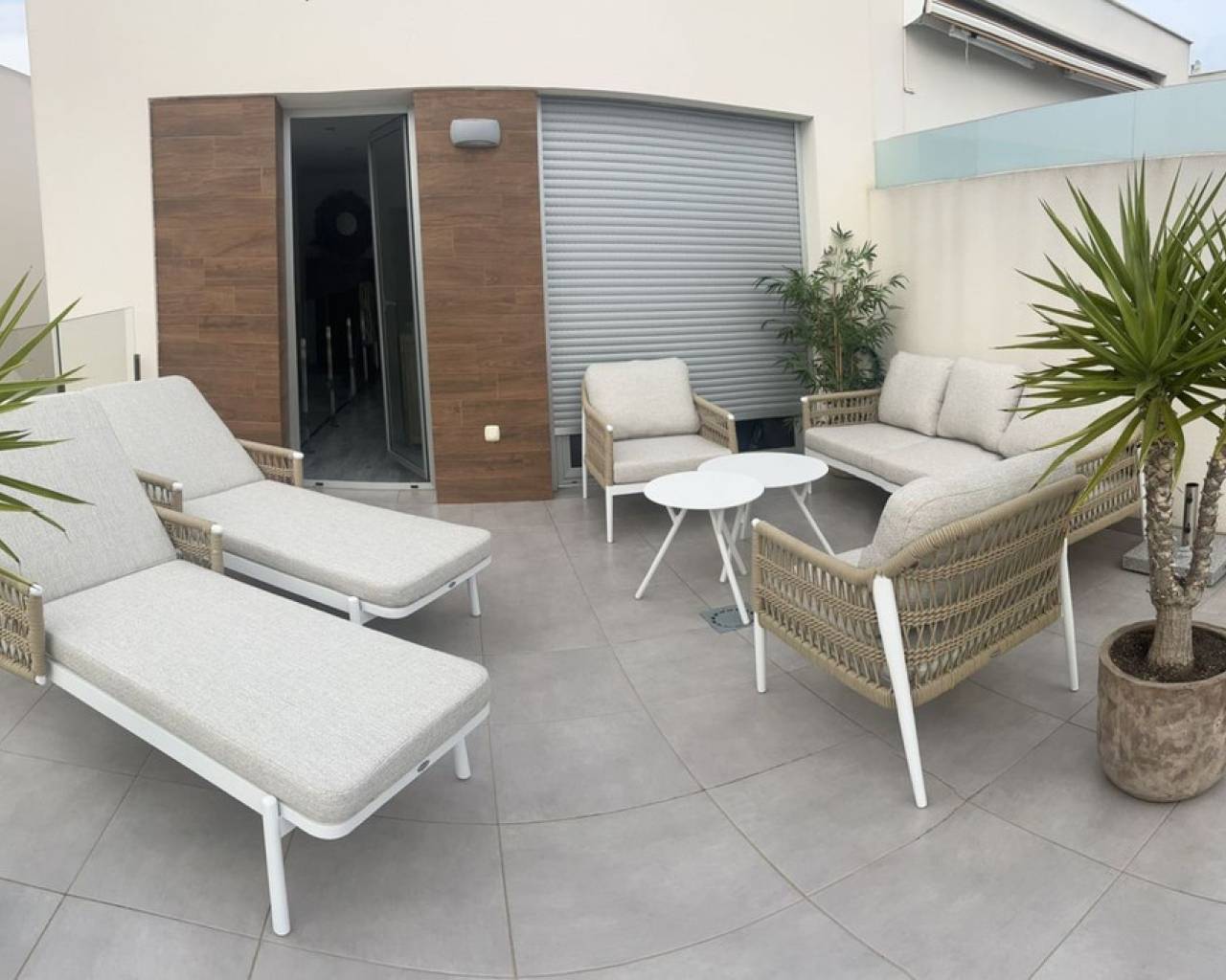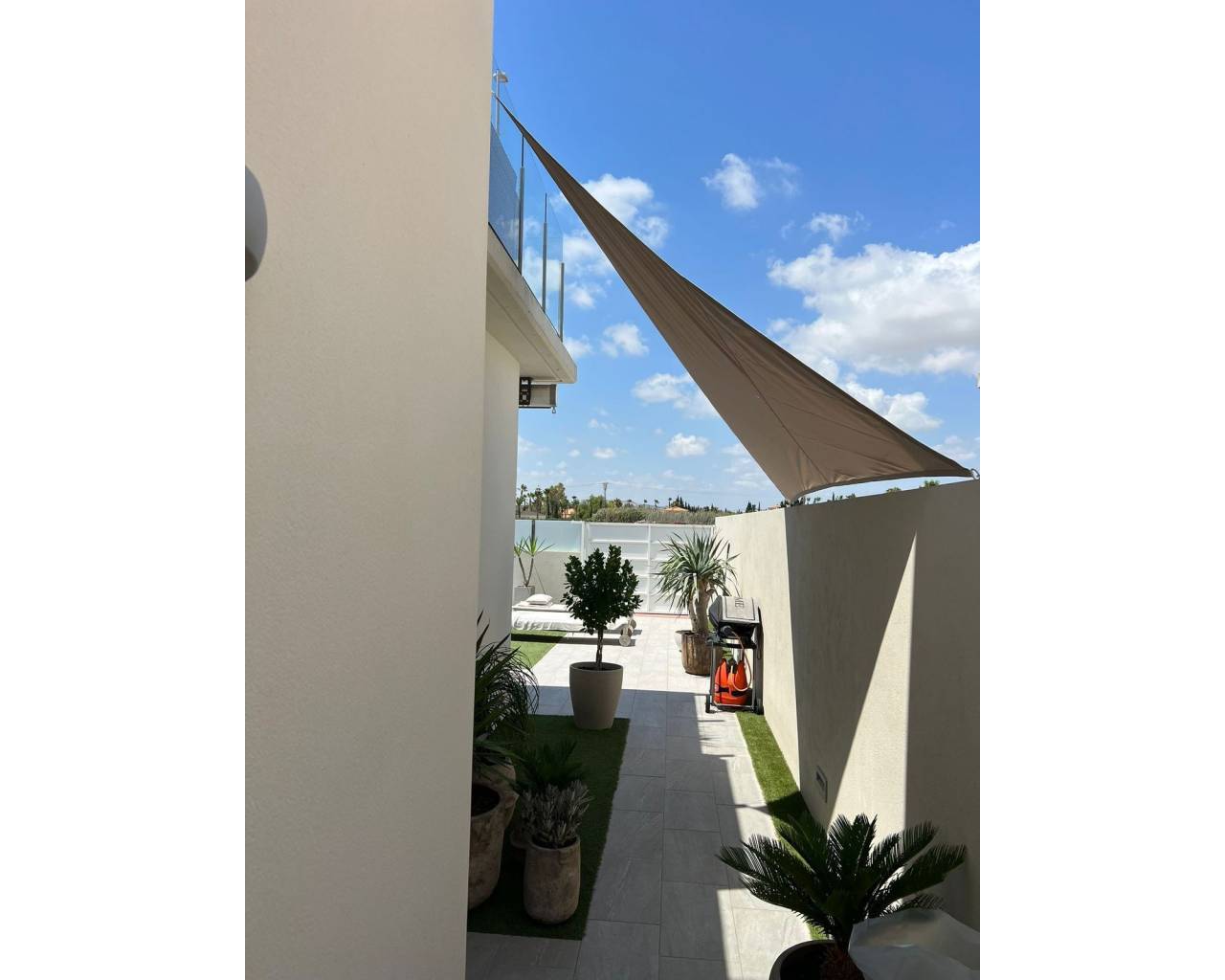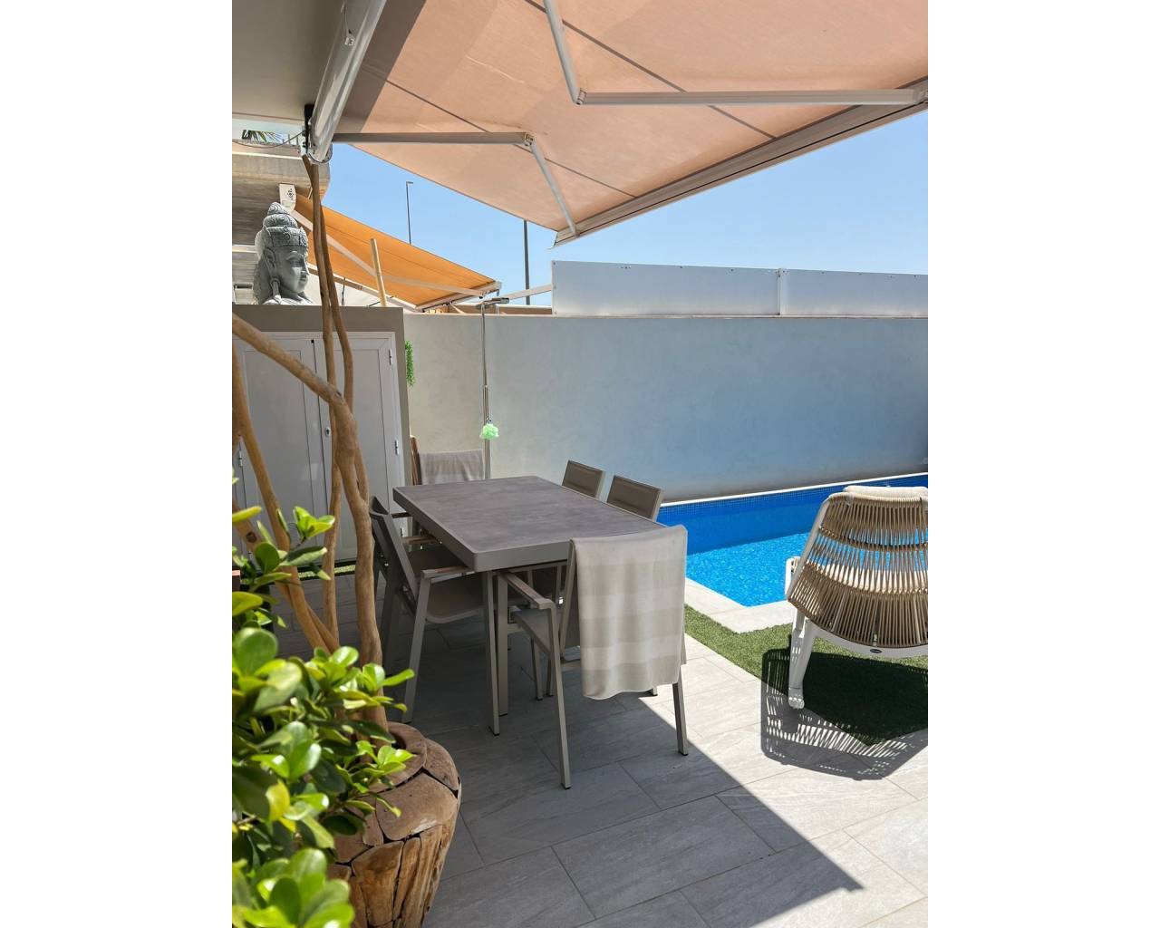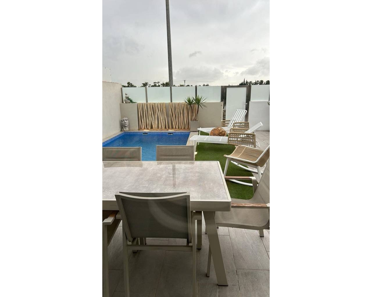 Discover this stunning contemporary villa flooded with natural light, south-facing and featuring a private swimming pool (2.80 m x 5.50 m), located in the sought-after area of Daya Vieja, just 3 minutes from Rojales and San Fulgencio. Fully furnished with high-end, carefully selected designer furniture, this semi-detached villa impresses from the moment you enter with its elegant and welcoming atmosphere. It offers 3 spacious bedrooms, 2 bathrooms, and 1 separate guest toilet, all designed for optimal comfort. The heart of the home features a bright, open and harmonious living space, where the modern kitchen blends seamlessly into the living room. Large windows provide direct views of the pool and the outdoor lounge area, creating a perfect connection between indoor and outdoor living—ideal for entertaining or enjoying everyday life under the Spanish sun. All bedrooms are equipped with built-in wardrobes offering generous storage space, while air conditioning ensures absolute comfort throughout the year. From the kitchen, a hallway leads to a guest bedroom with en-suite bathroom, followed by an additional guest bathroom. Upstairs, you will find two main bedrooms and a bathroom. At the end of the corridor, access to the front balcony reveals a true relaxation area, equipped with a retractable bioclimatic awning, ideal for creating a comfortable and intimate outdoor lounge. Tastefully decorated both inside and out, this turnkey villa combines elegance, brightness and high-quality finishes. A rare opportunity for a primary residence, holiday home or premium investment.